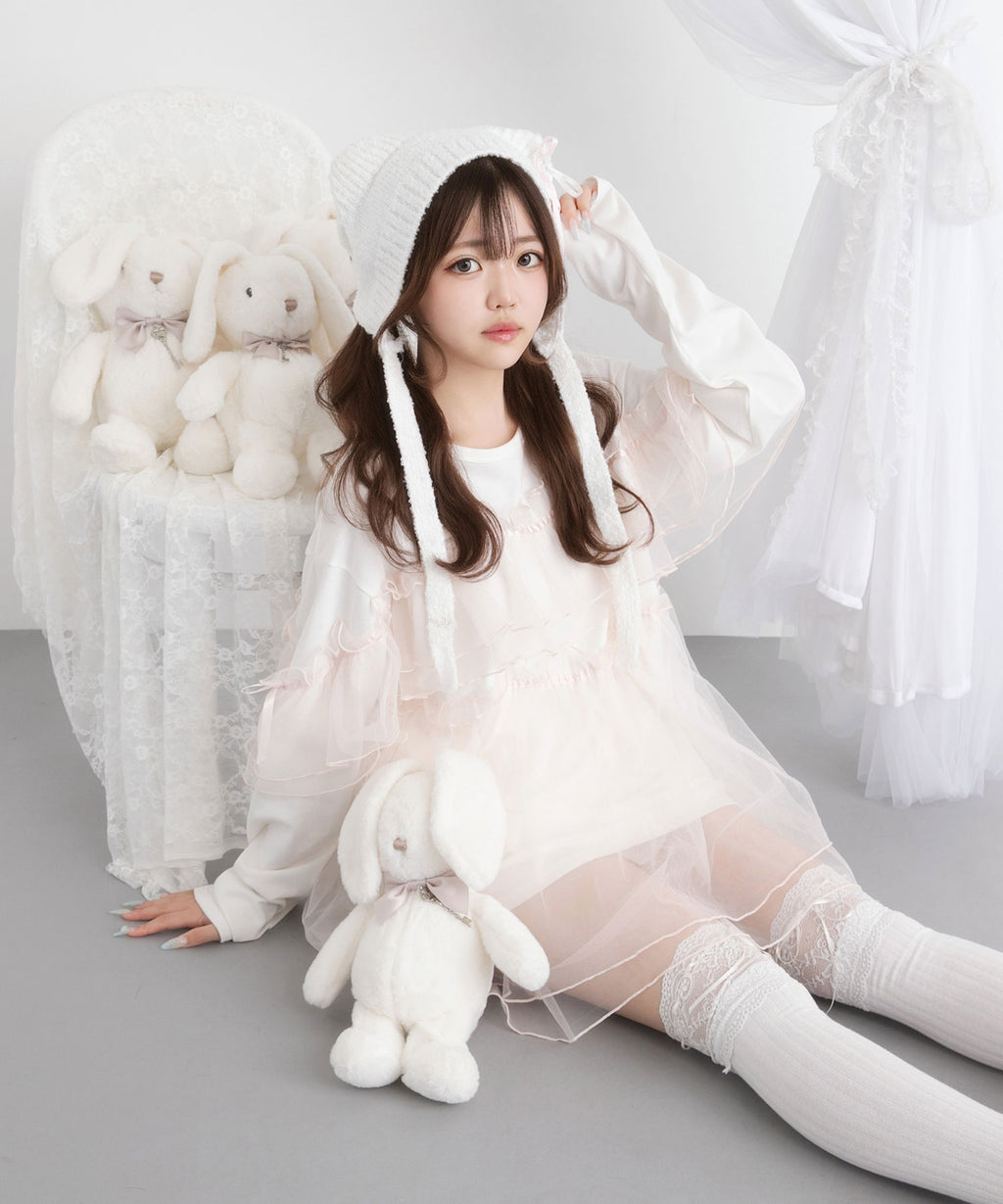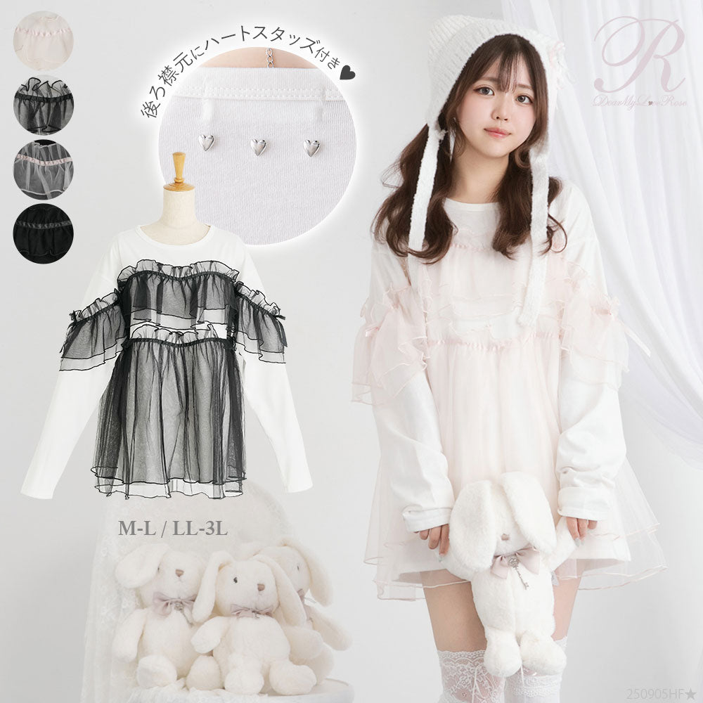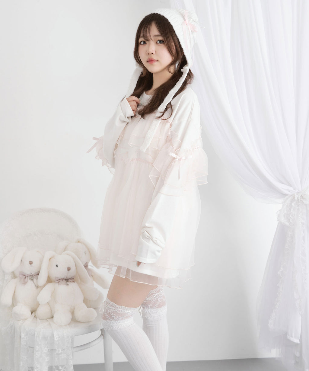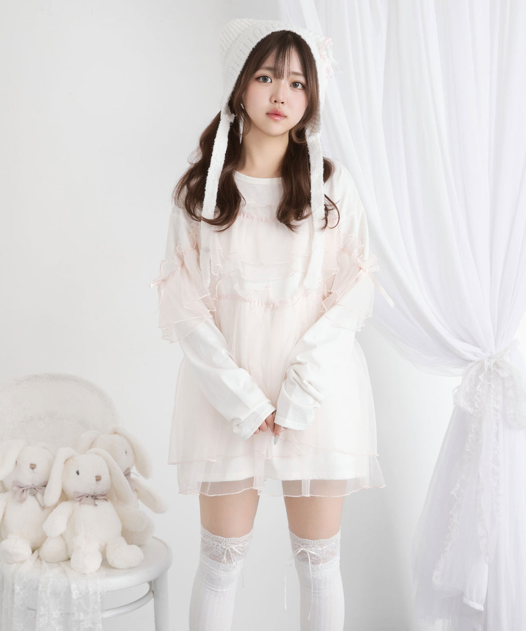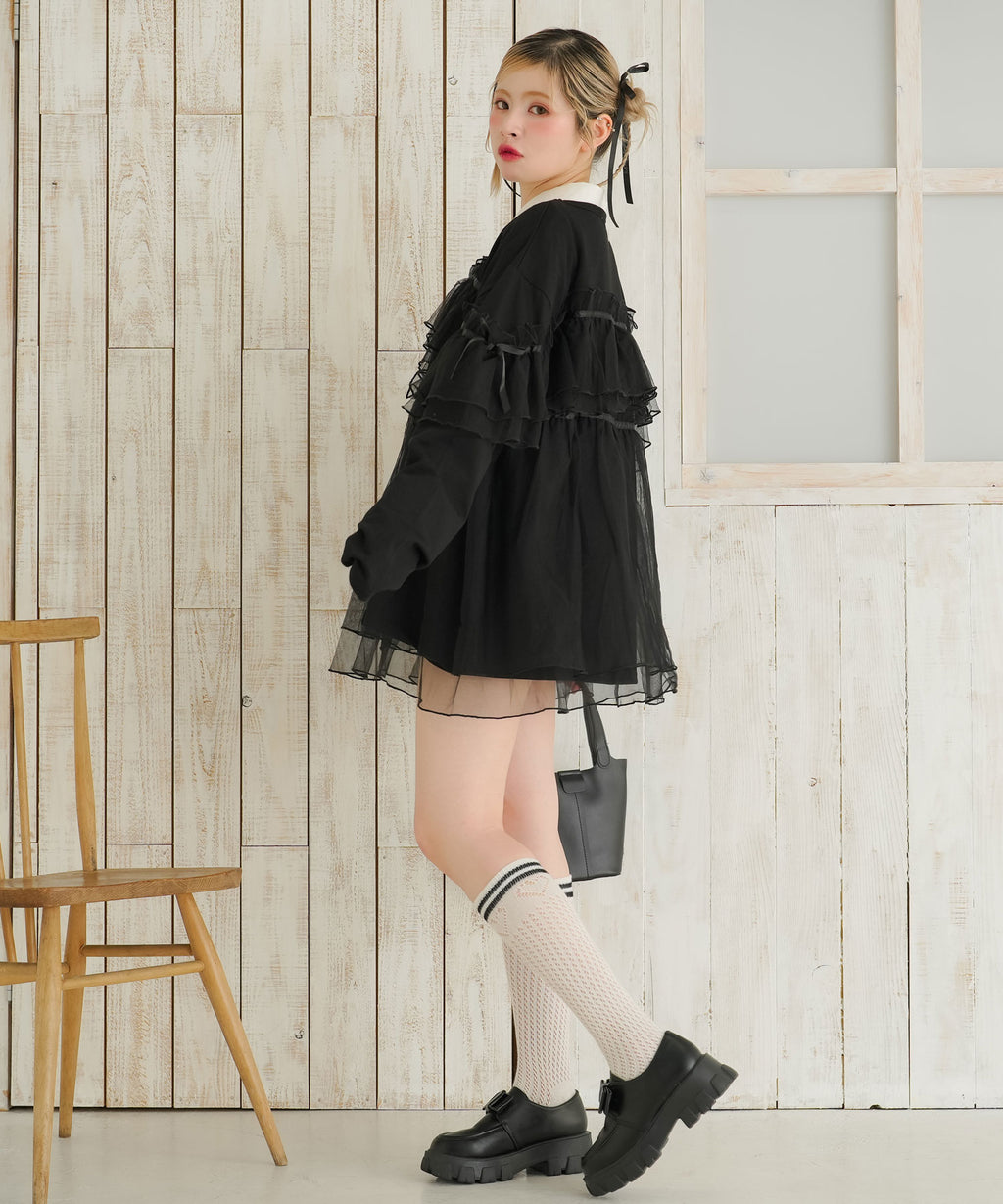 ふわっふわのたっぷりチュールフリルが可愛いチュニック丈ロンTのご紹介。