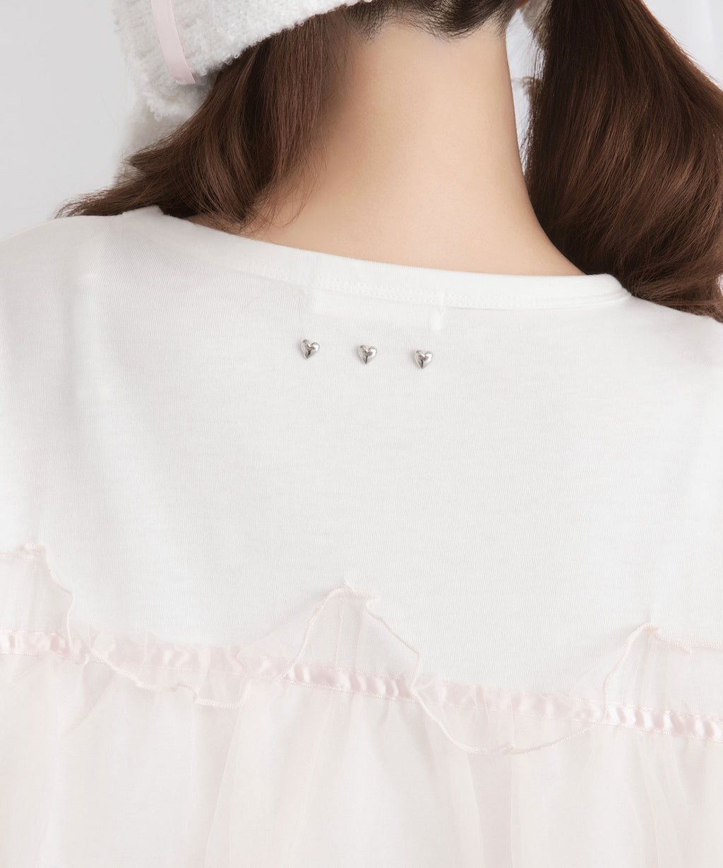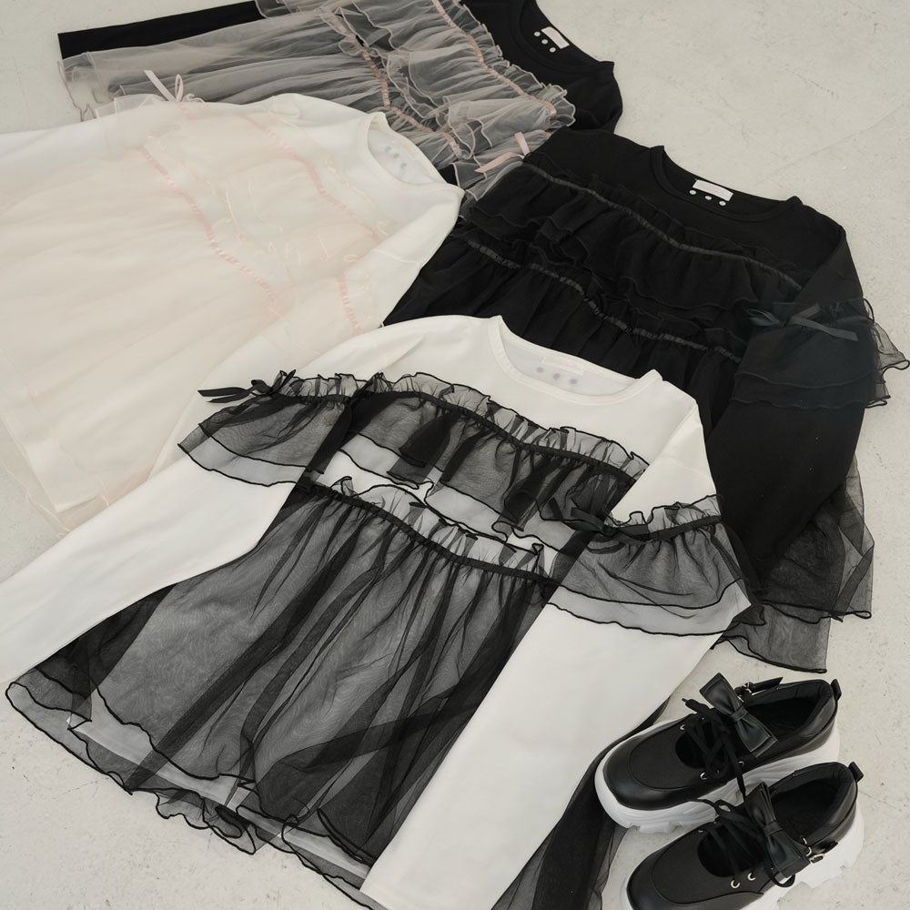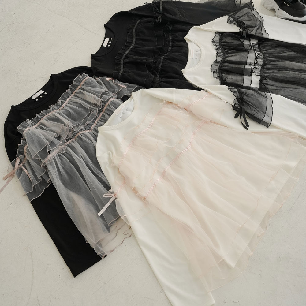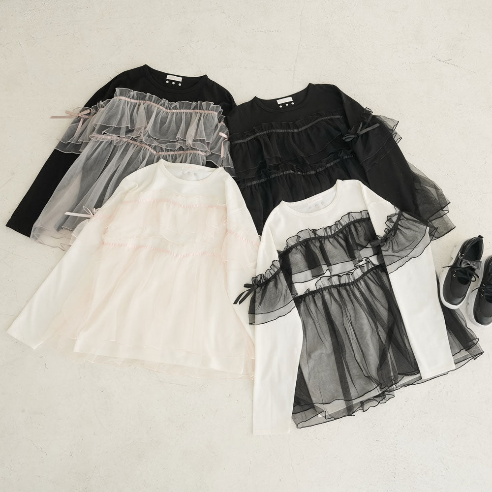 春に大人気だったフリルリボンスウェットを、ふわふわチュールに変えてロングシーズン着れるロンTにアップデートしました♪