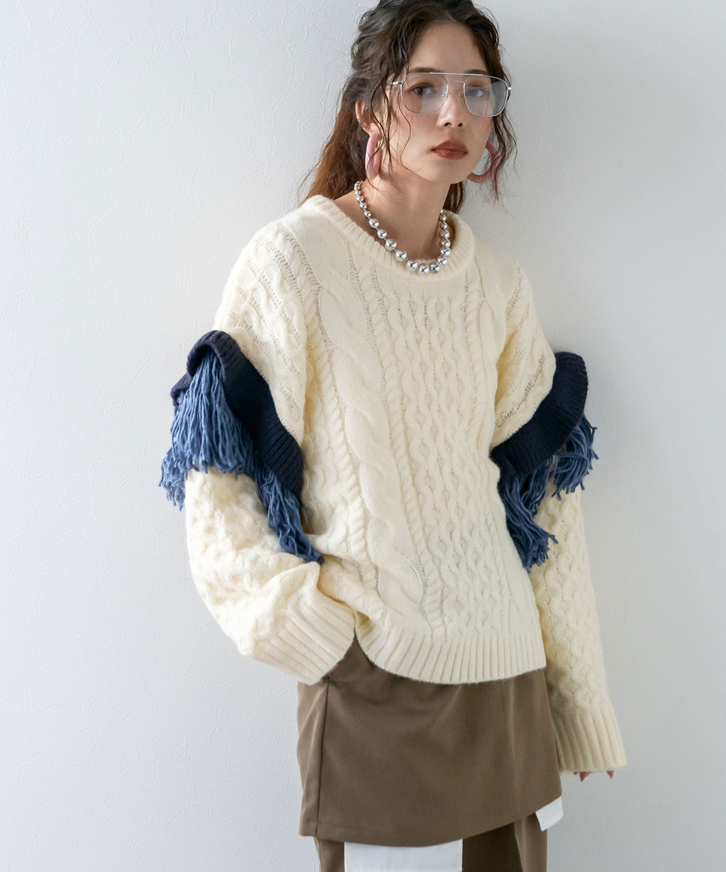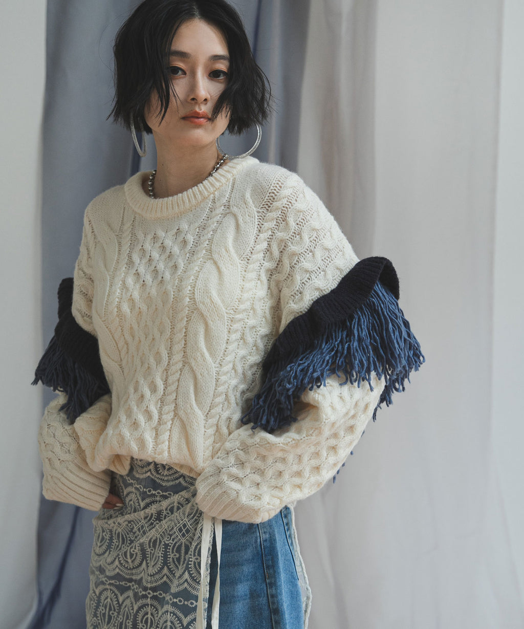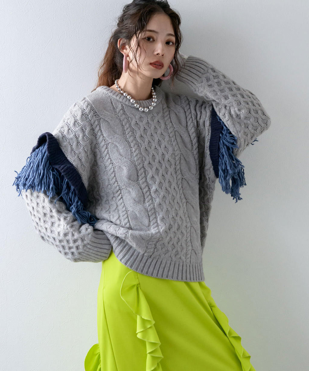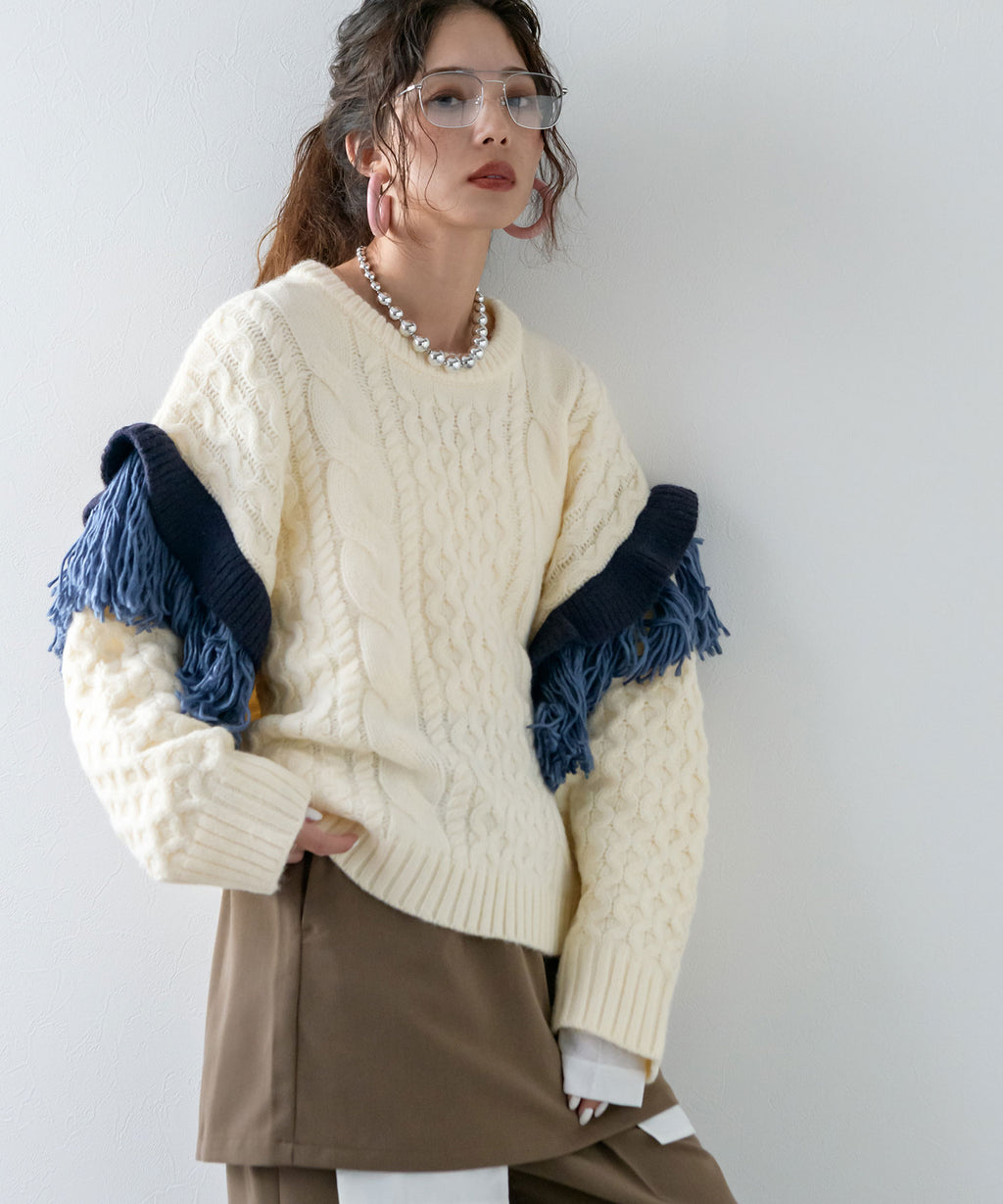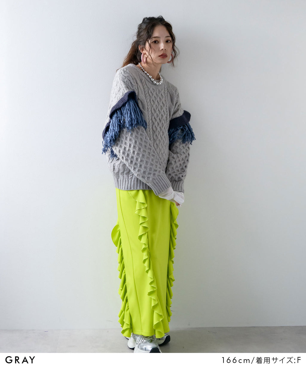 袖のフリンジ&フリルが特徴的なニット。