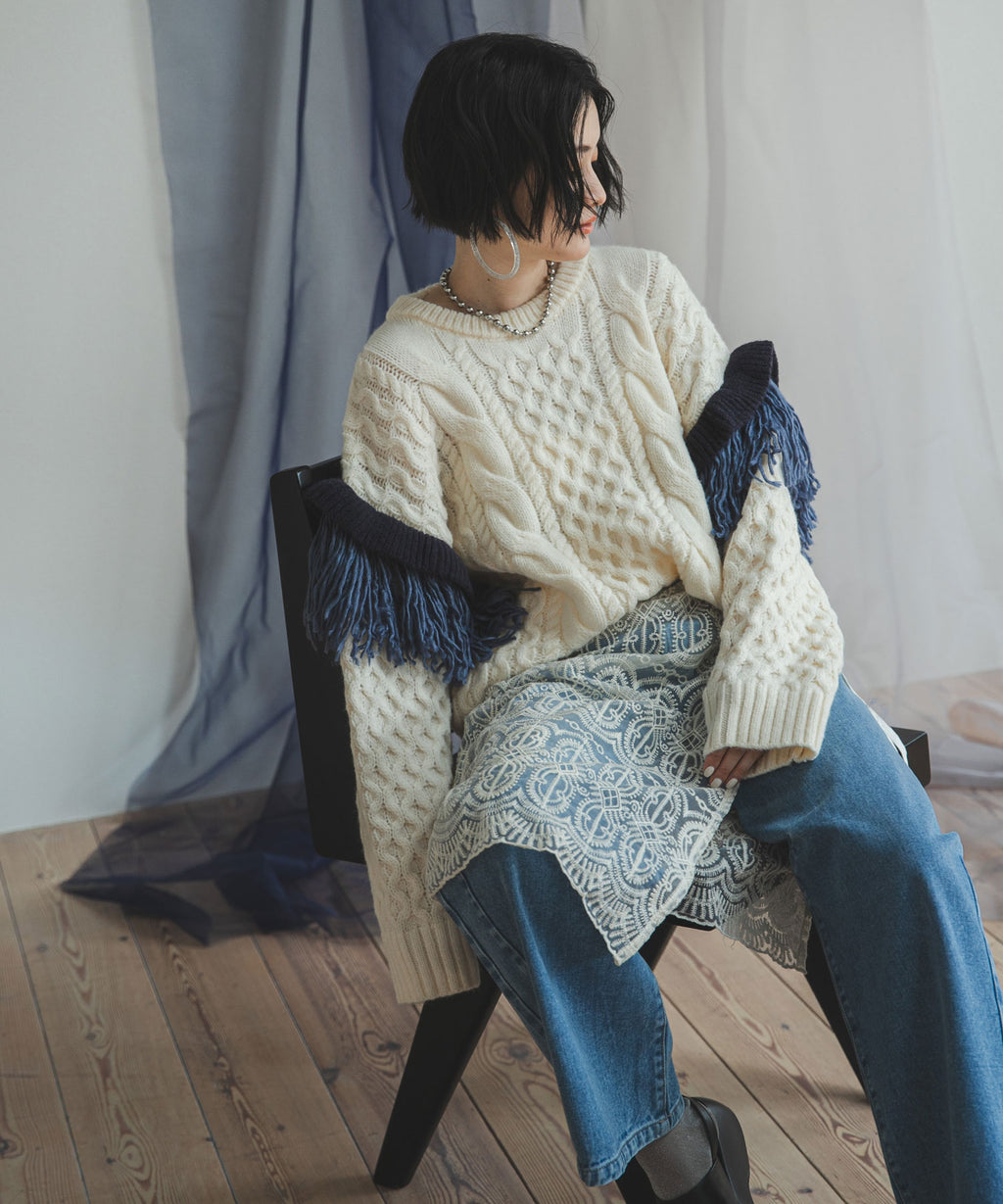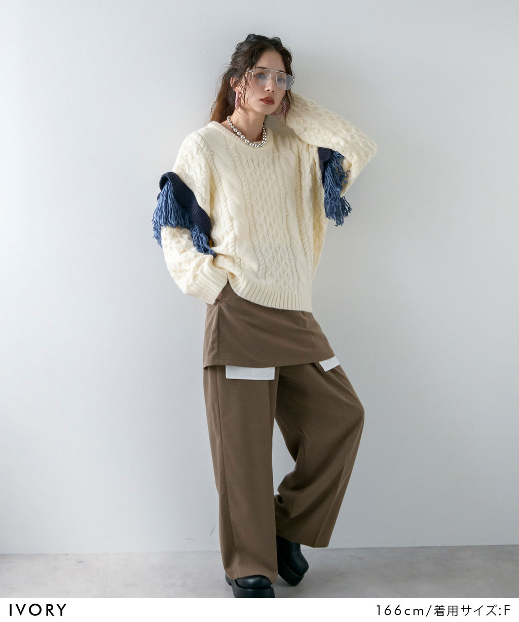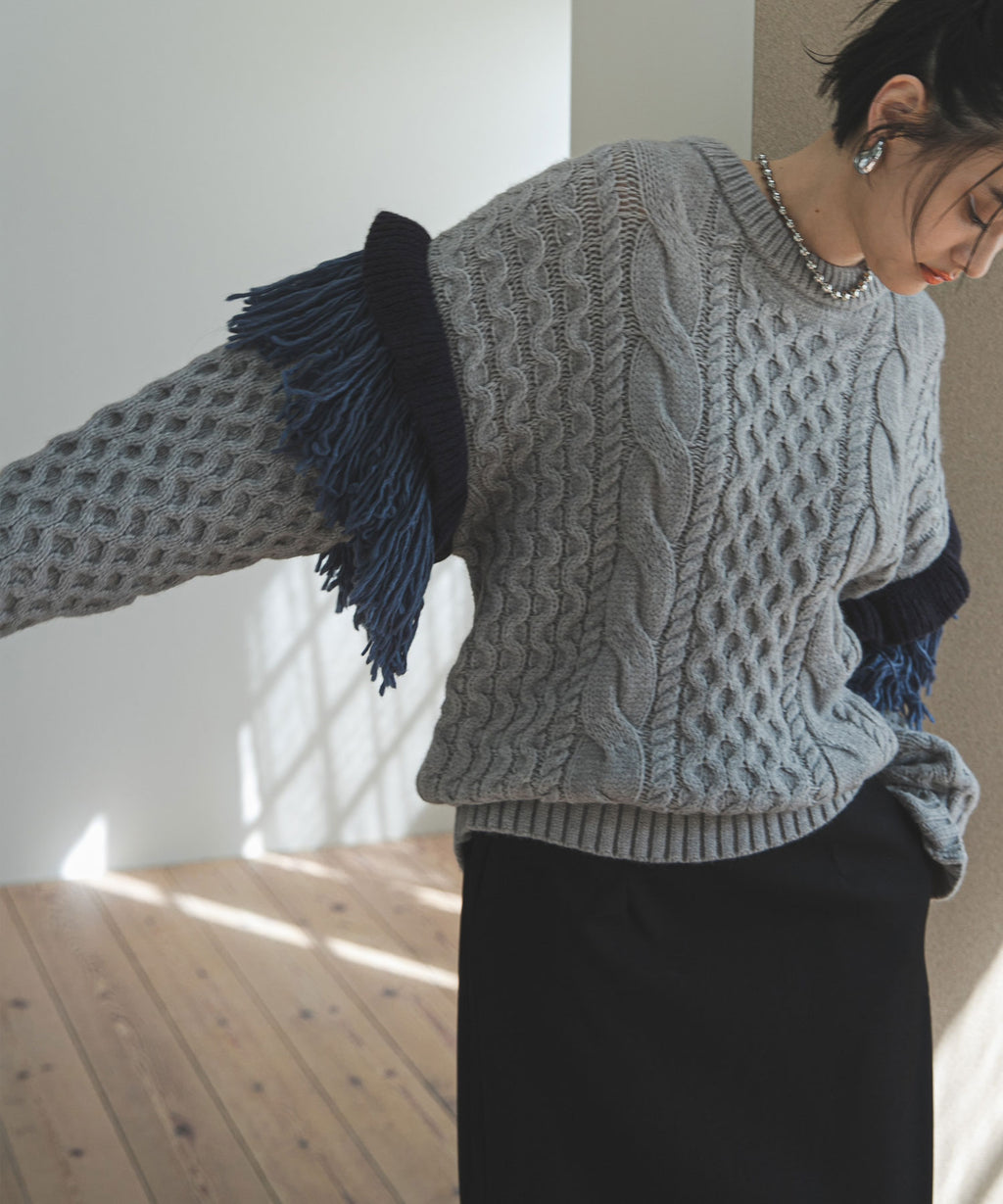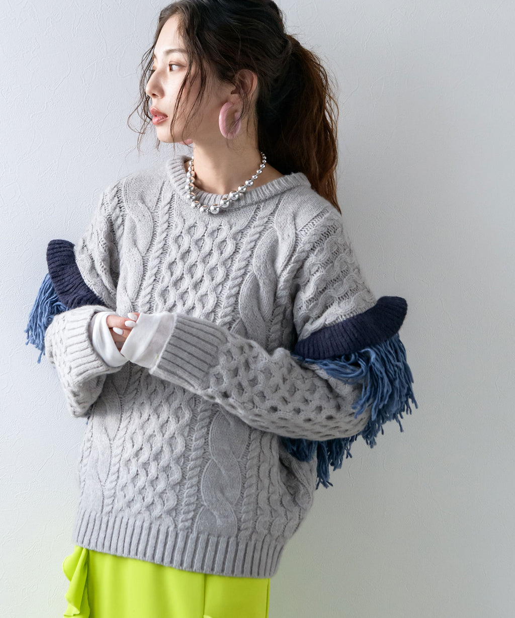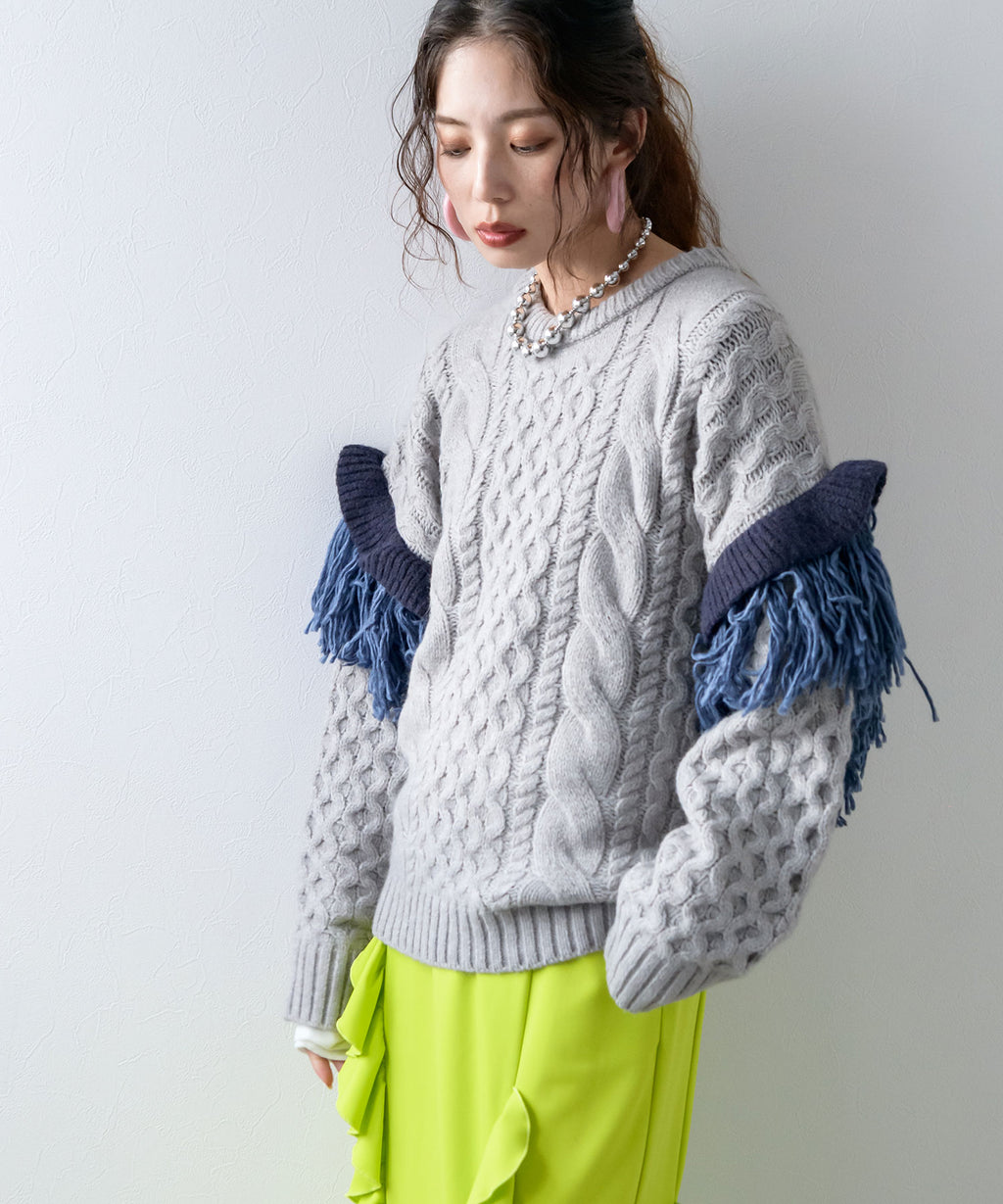 袖のフリンジ&フリルが特徴的なニット。