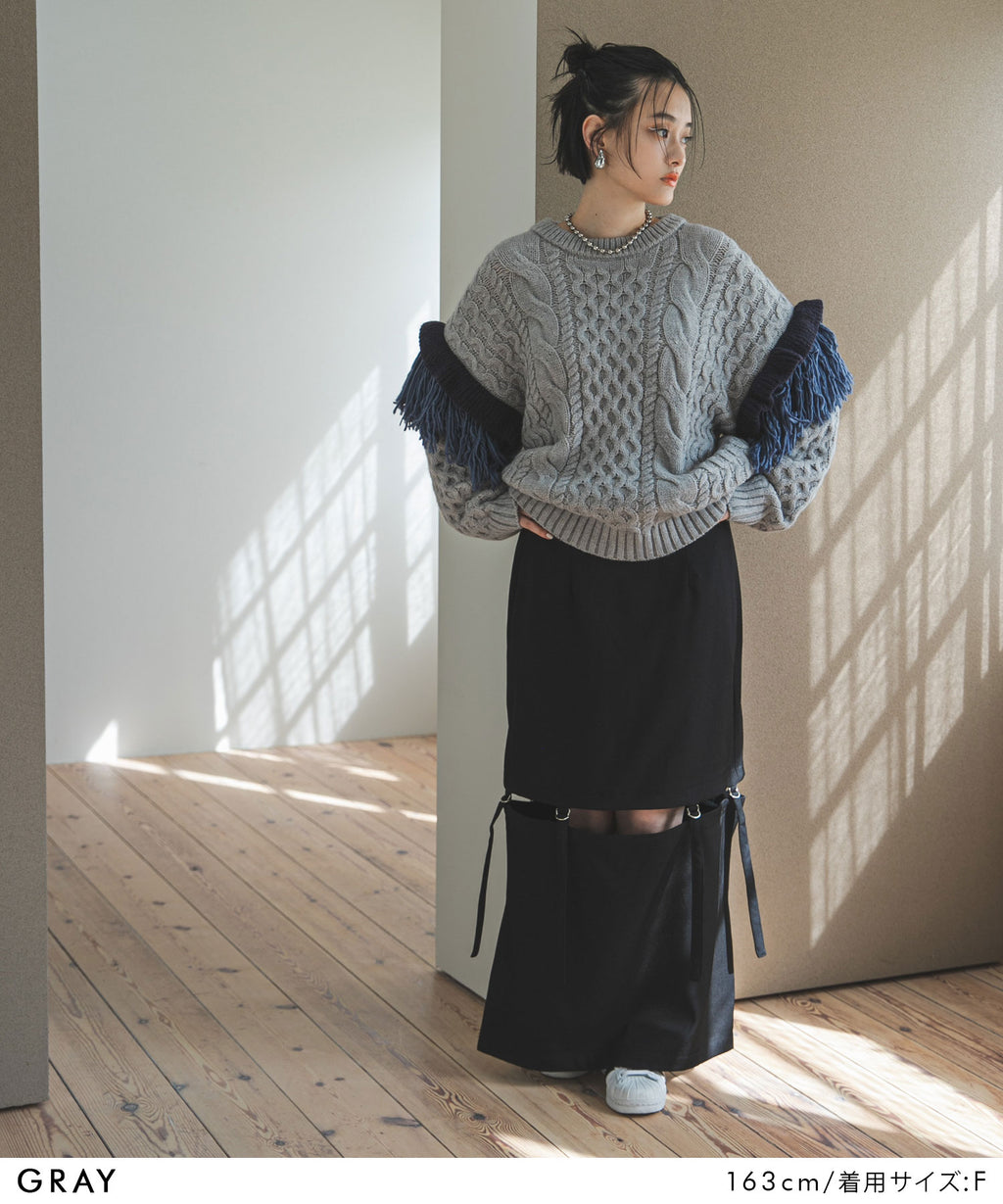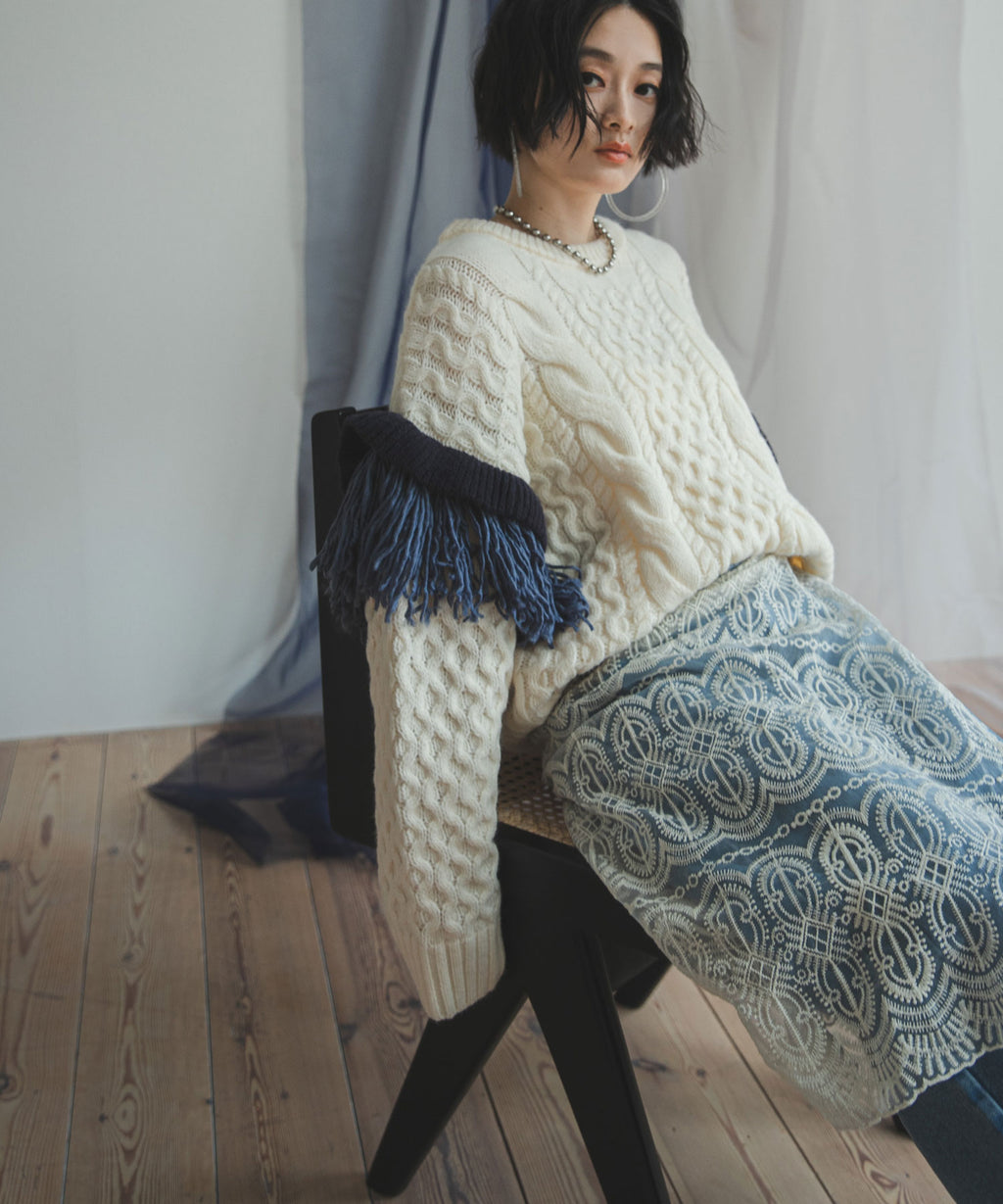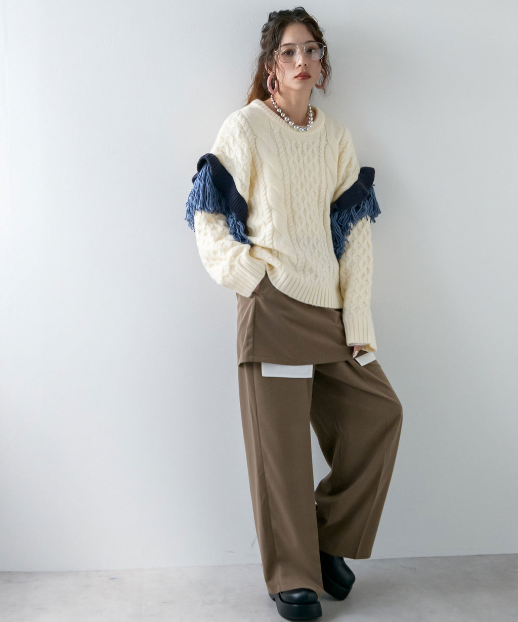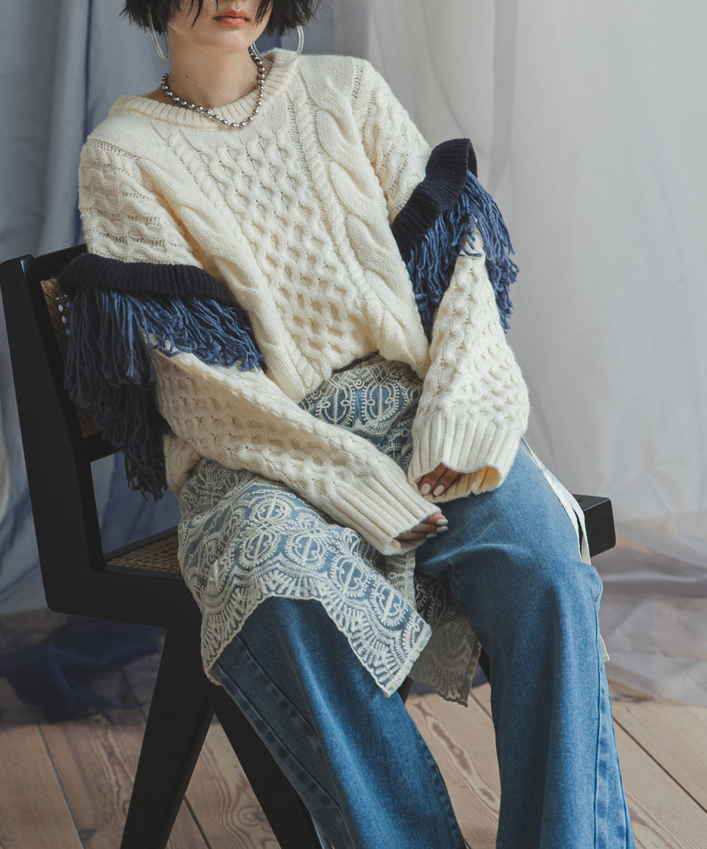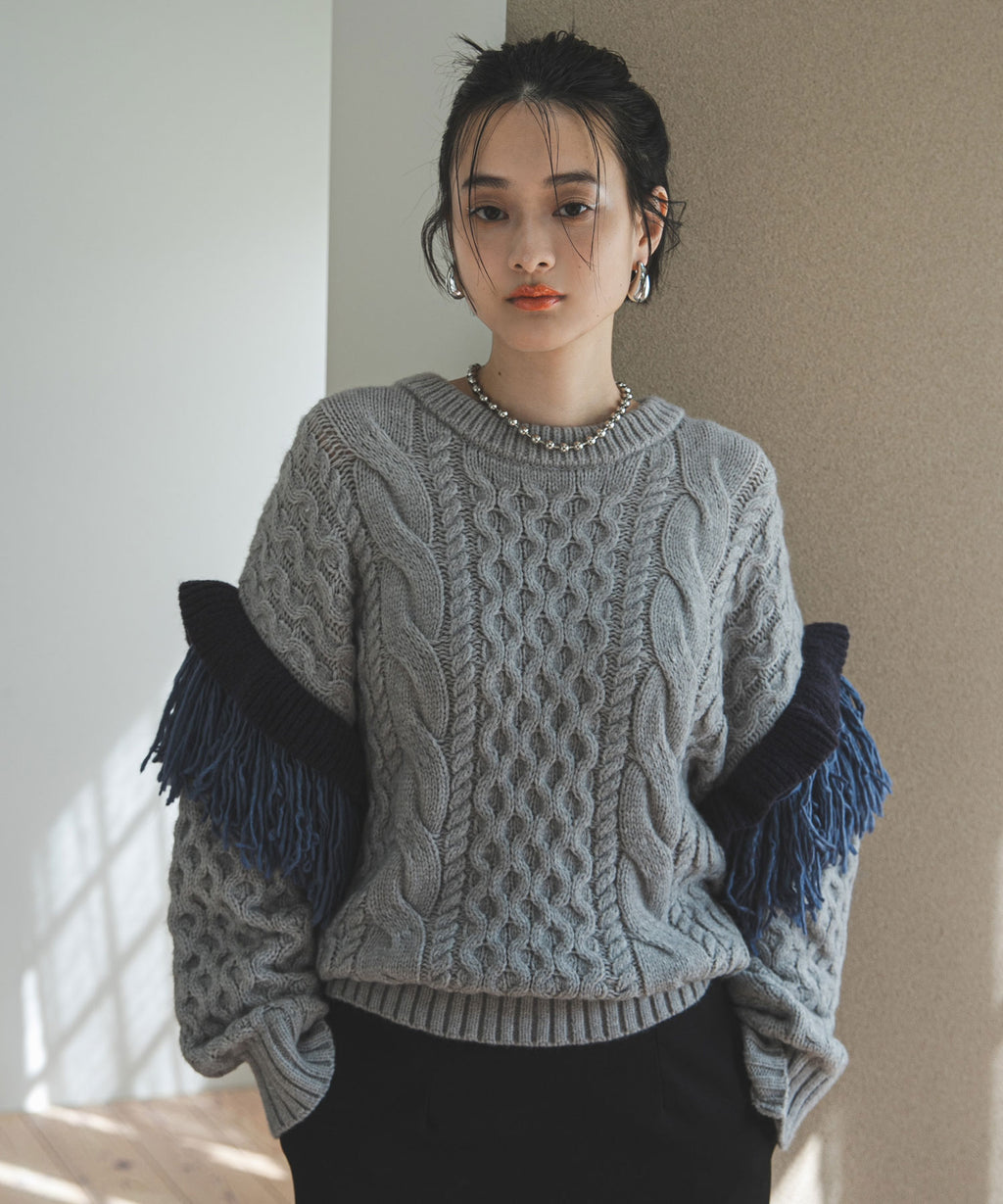 袖のフリンジ&フリルが特徴的なニット。