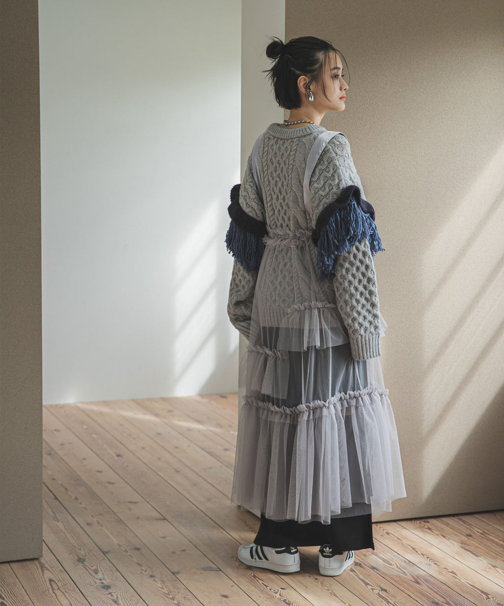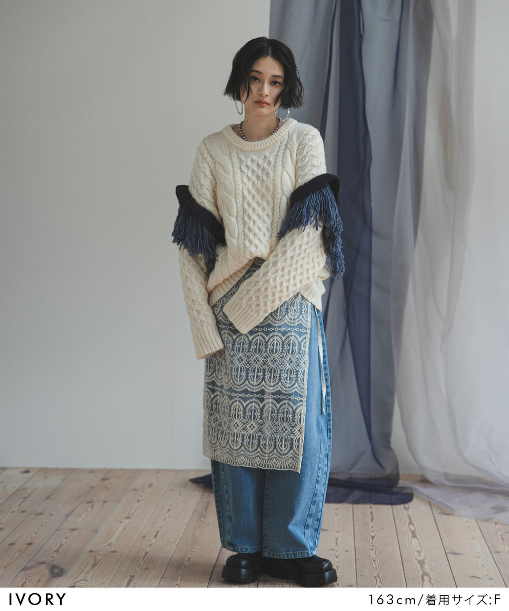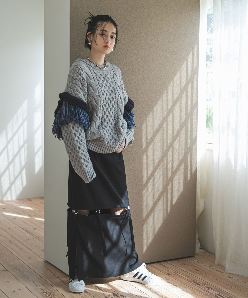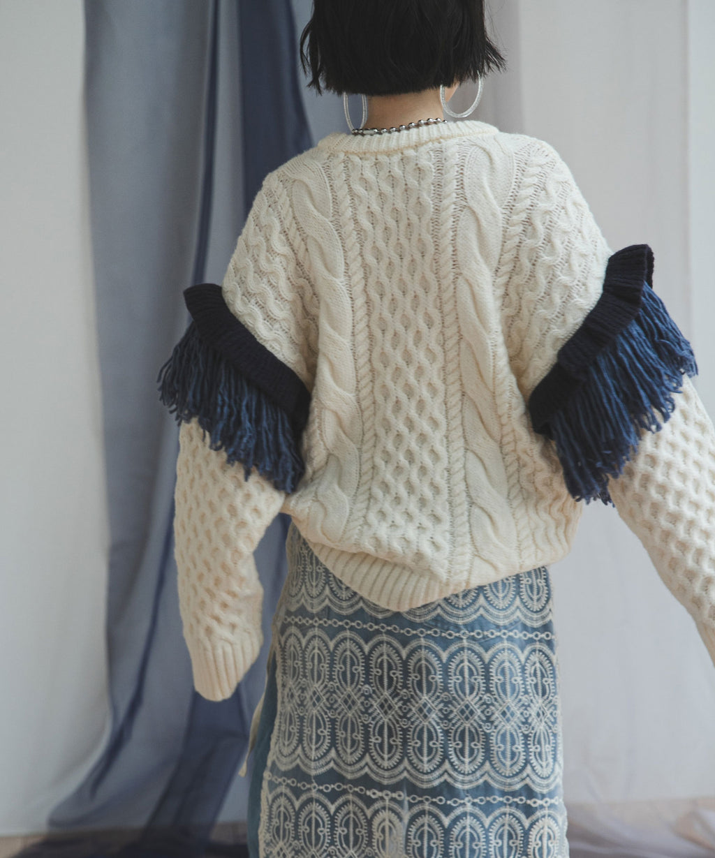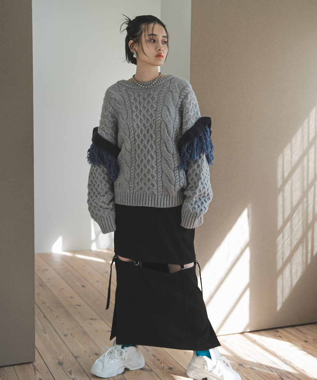 袖のフリンジ&フリルが特徴的なニット。