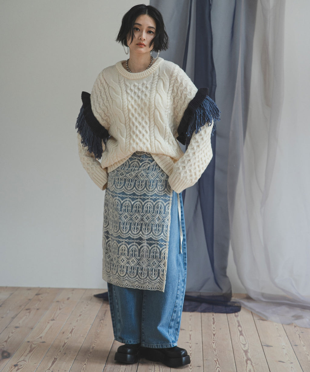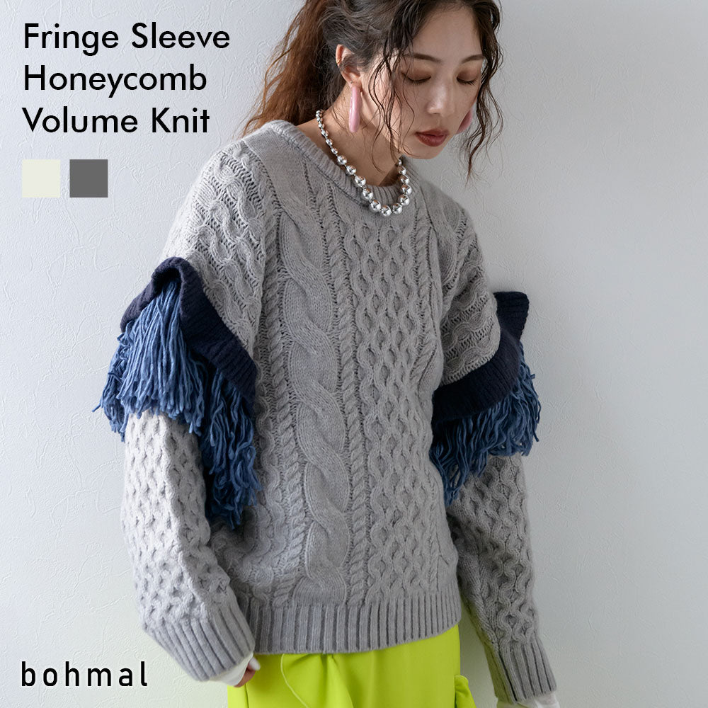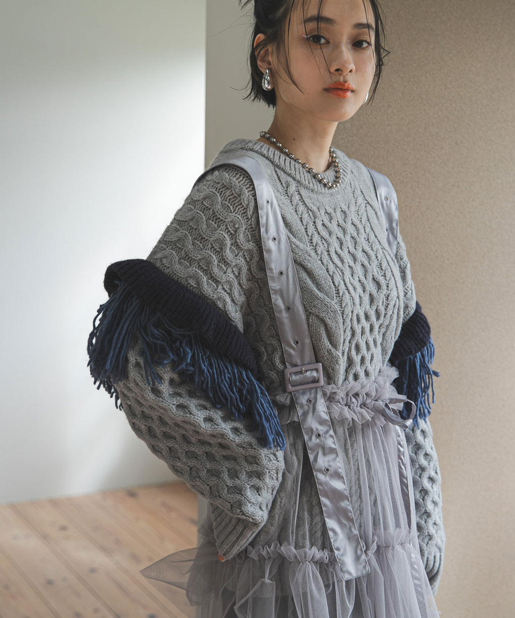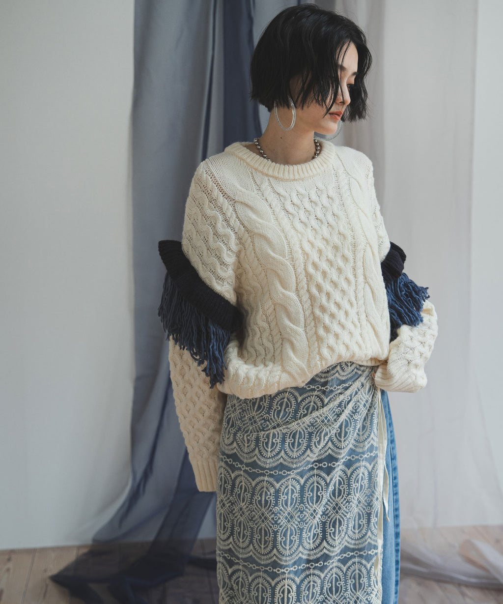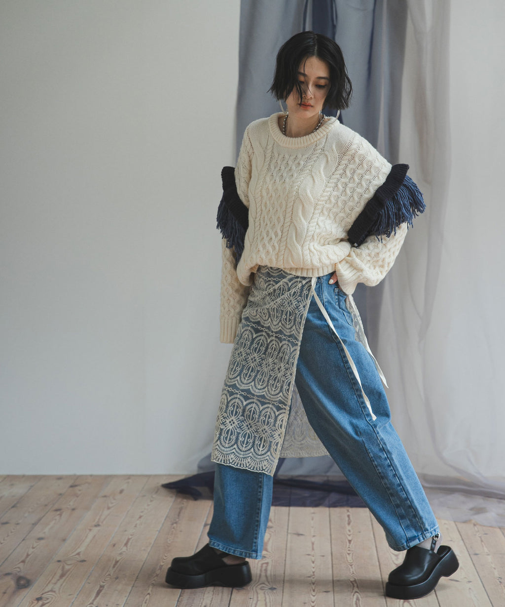 袖のフリンジ&フリルが特徴的なニット。