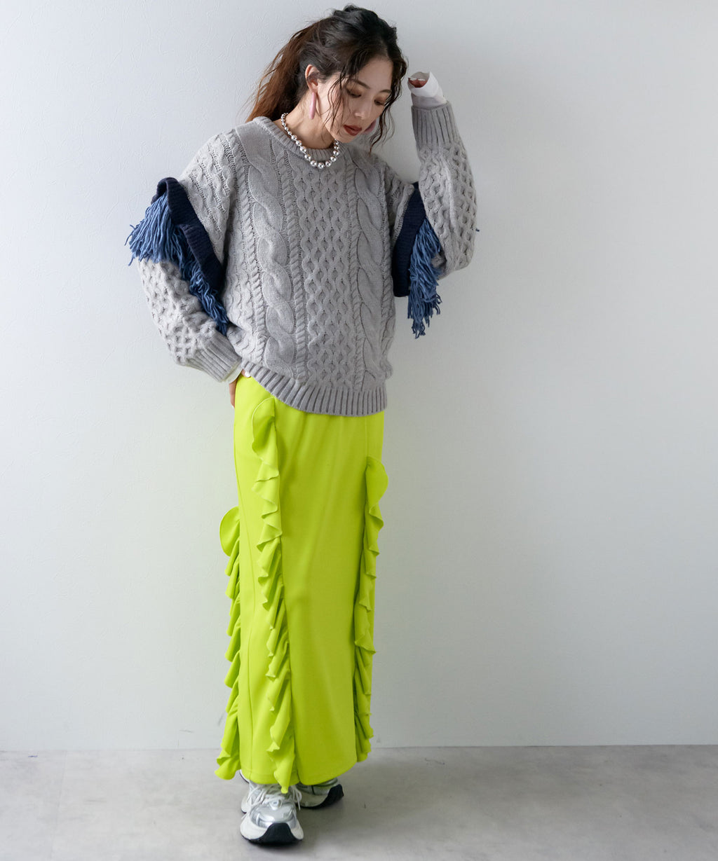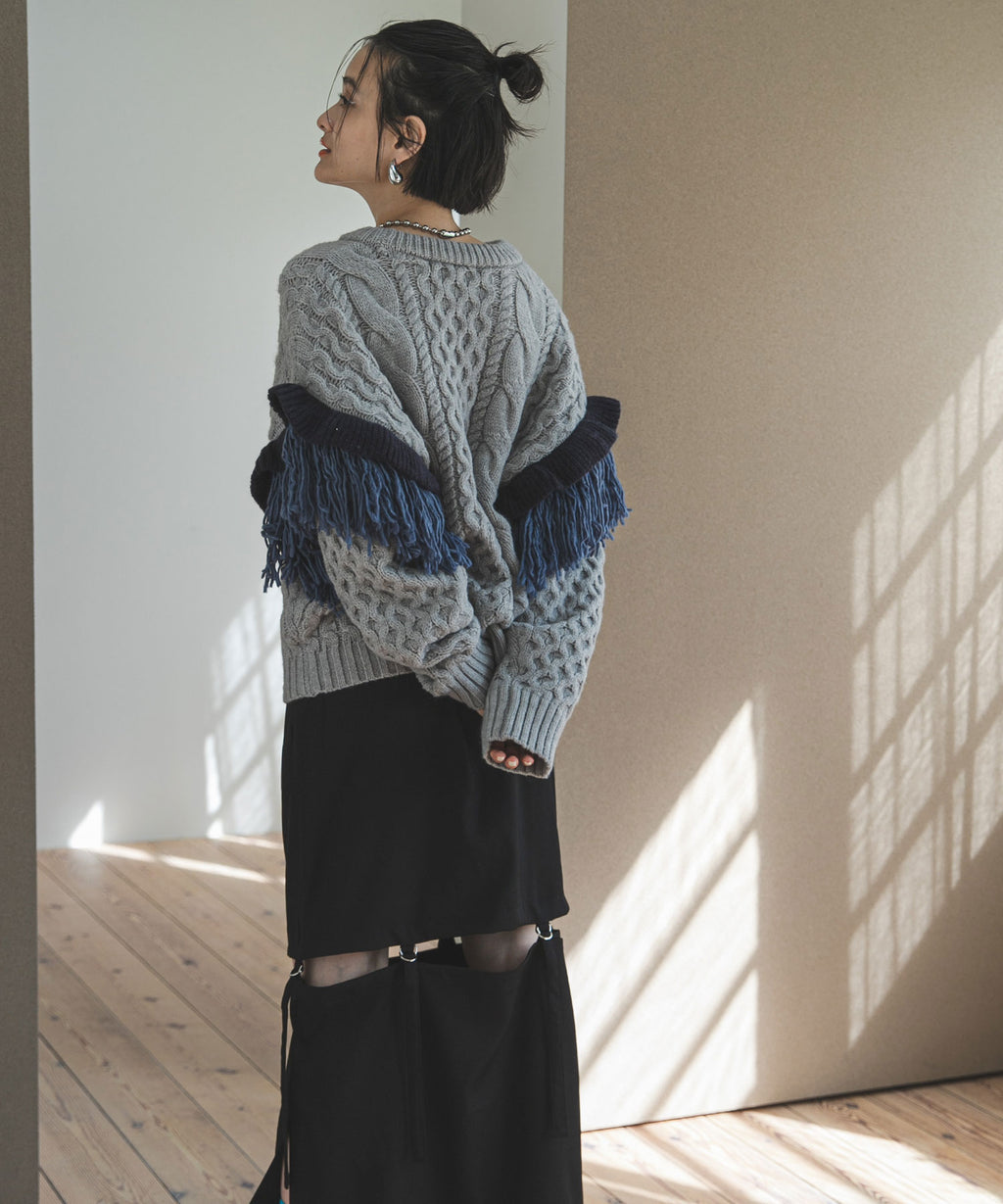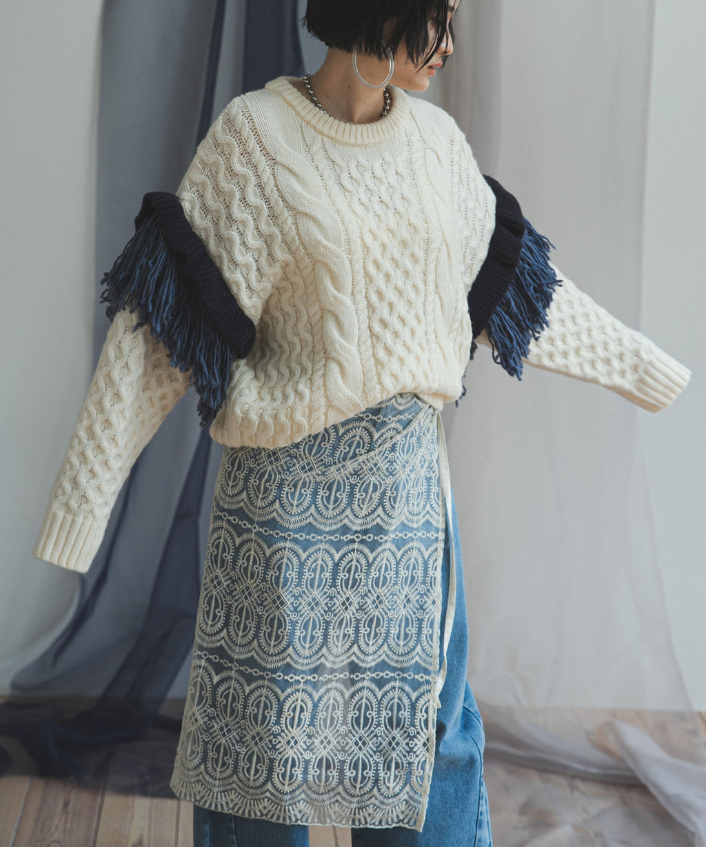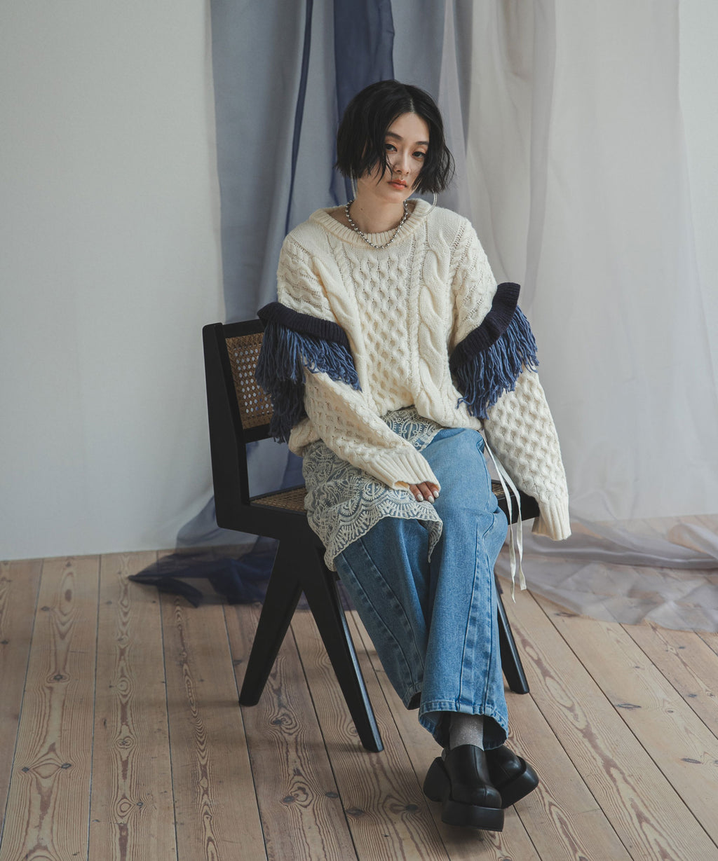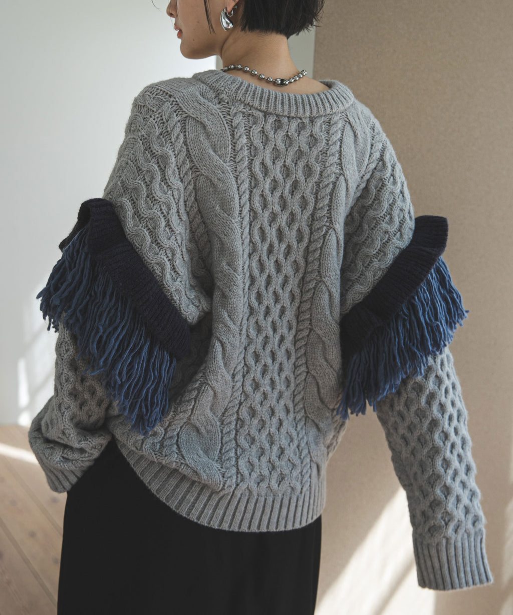 袖のフリンジ&フリルが特徴的なニット。