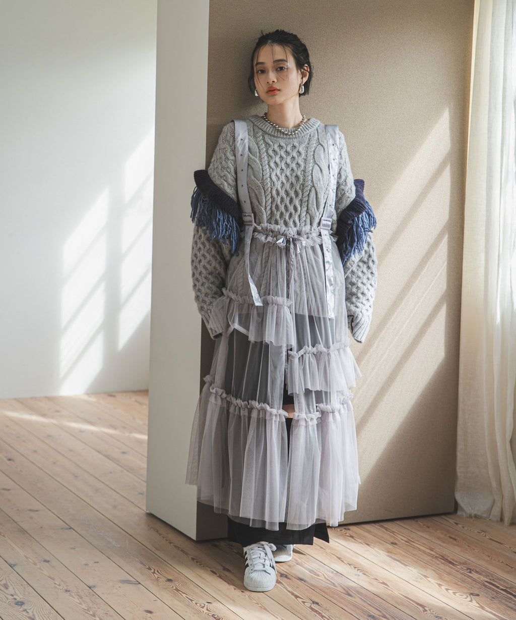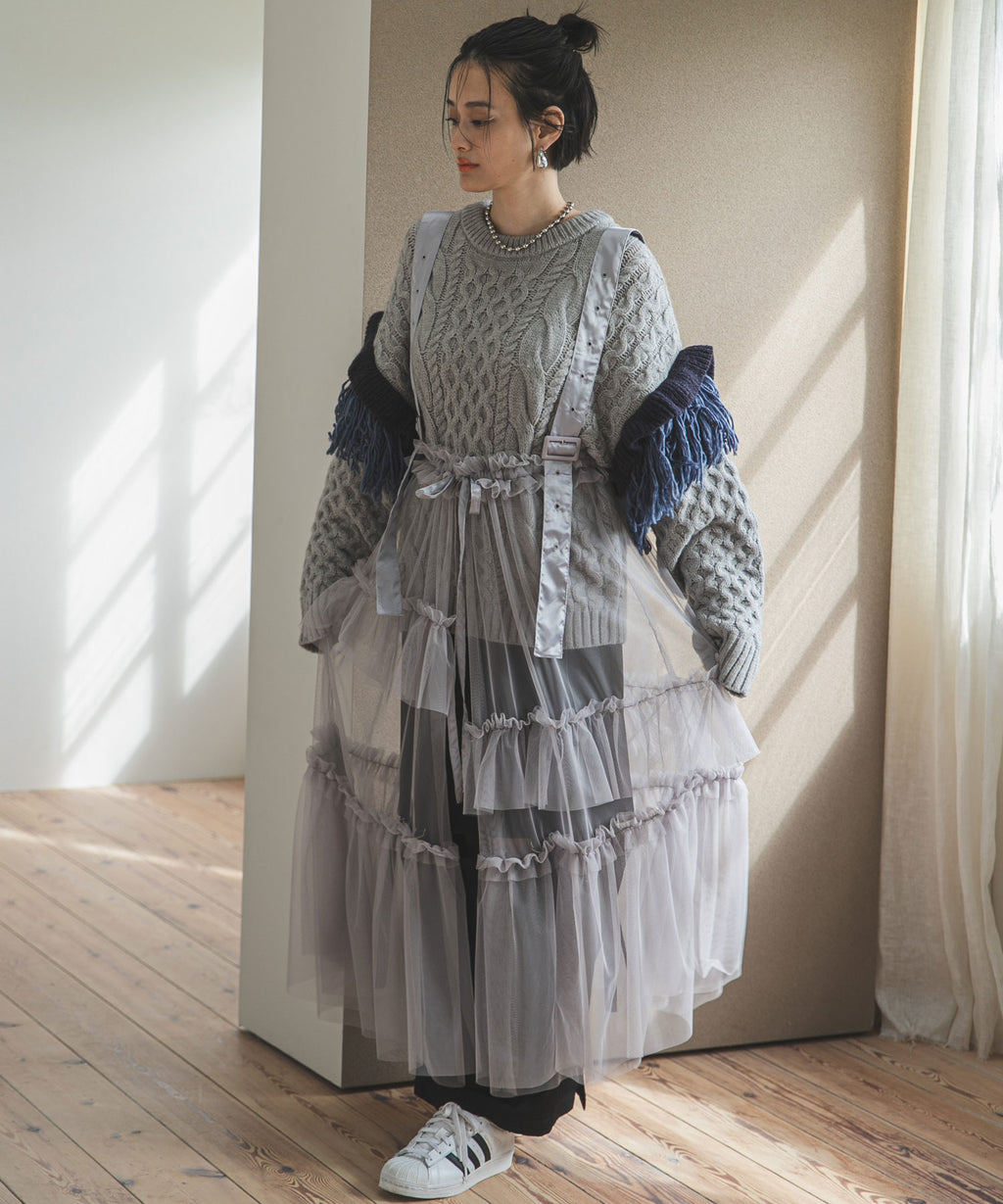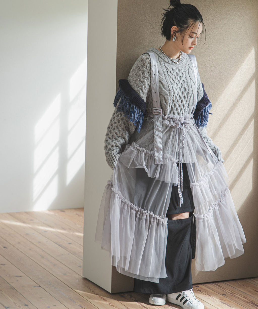 チュールやレースなど軽い素材とのレイヤードはこなれ感をよりUPしてくれます。