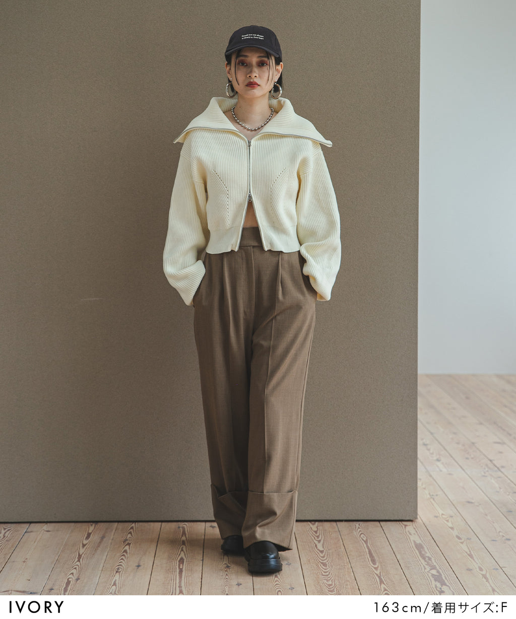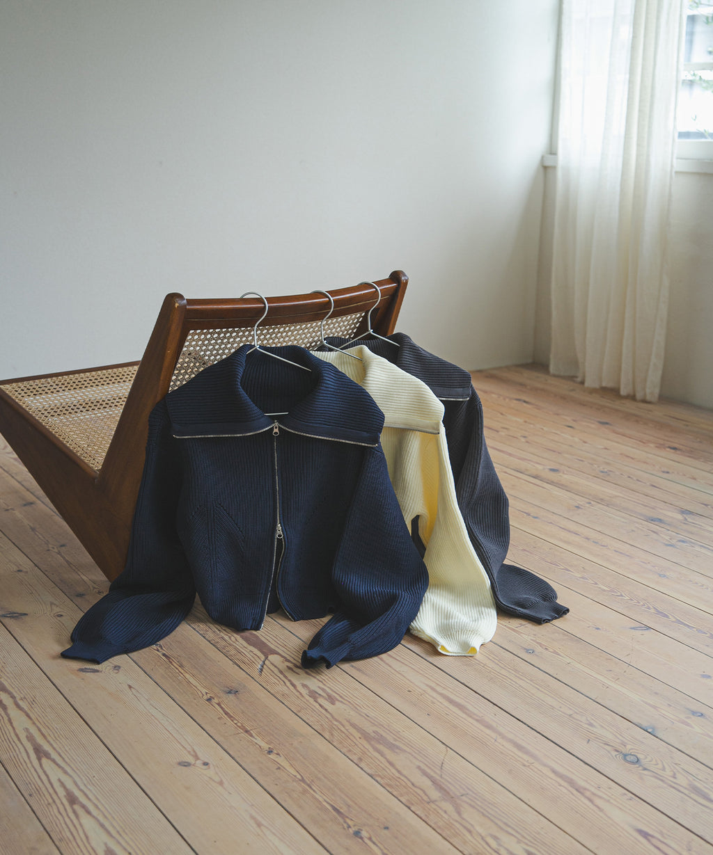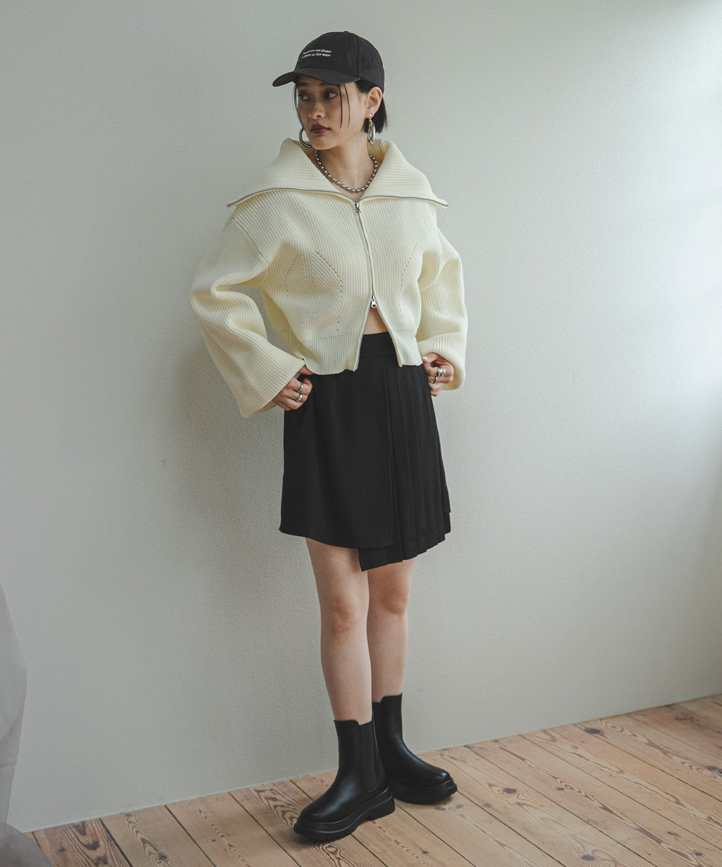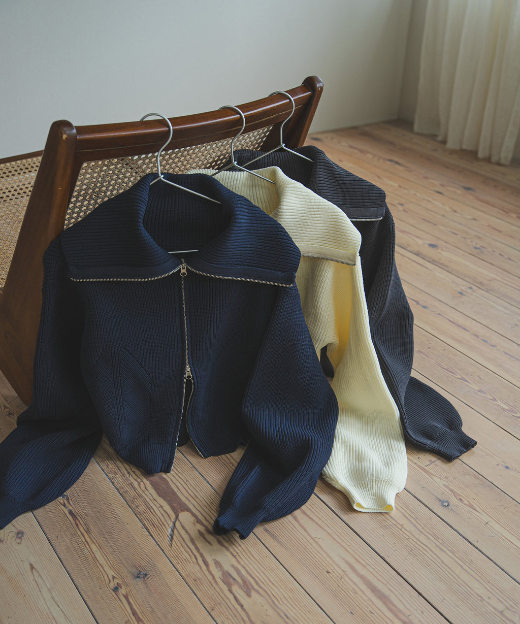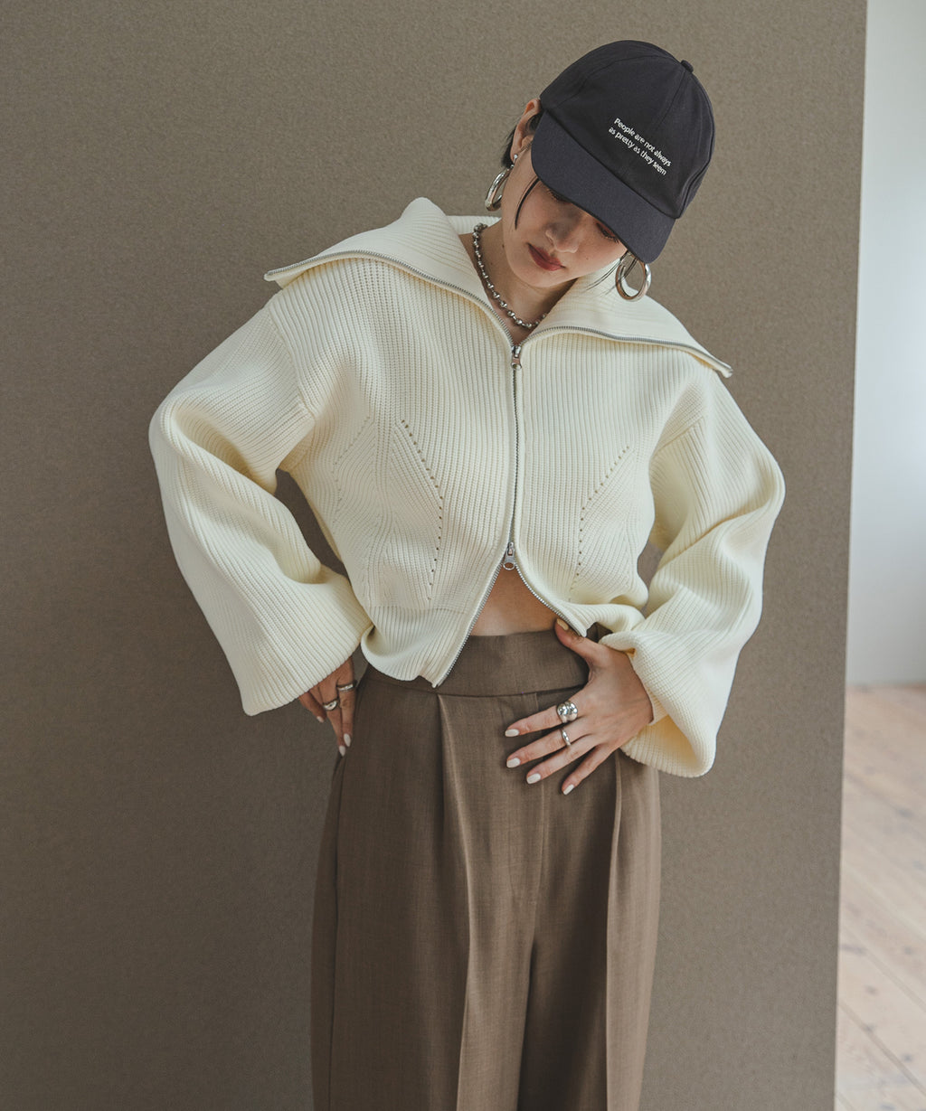 襟部分のみジップをあけて、襟の大きさで見せ方を変えたり、肌見せもできる変形可能なニットです。