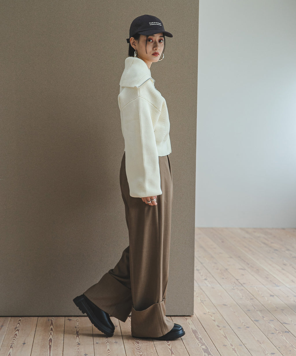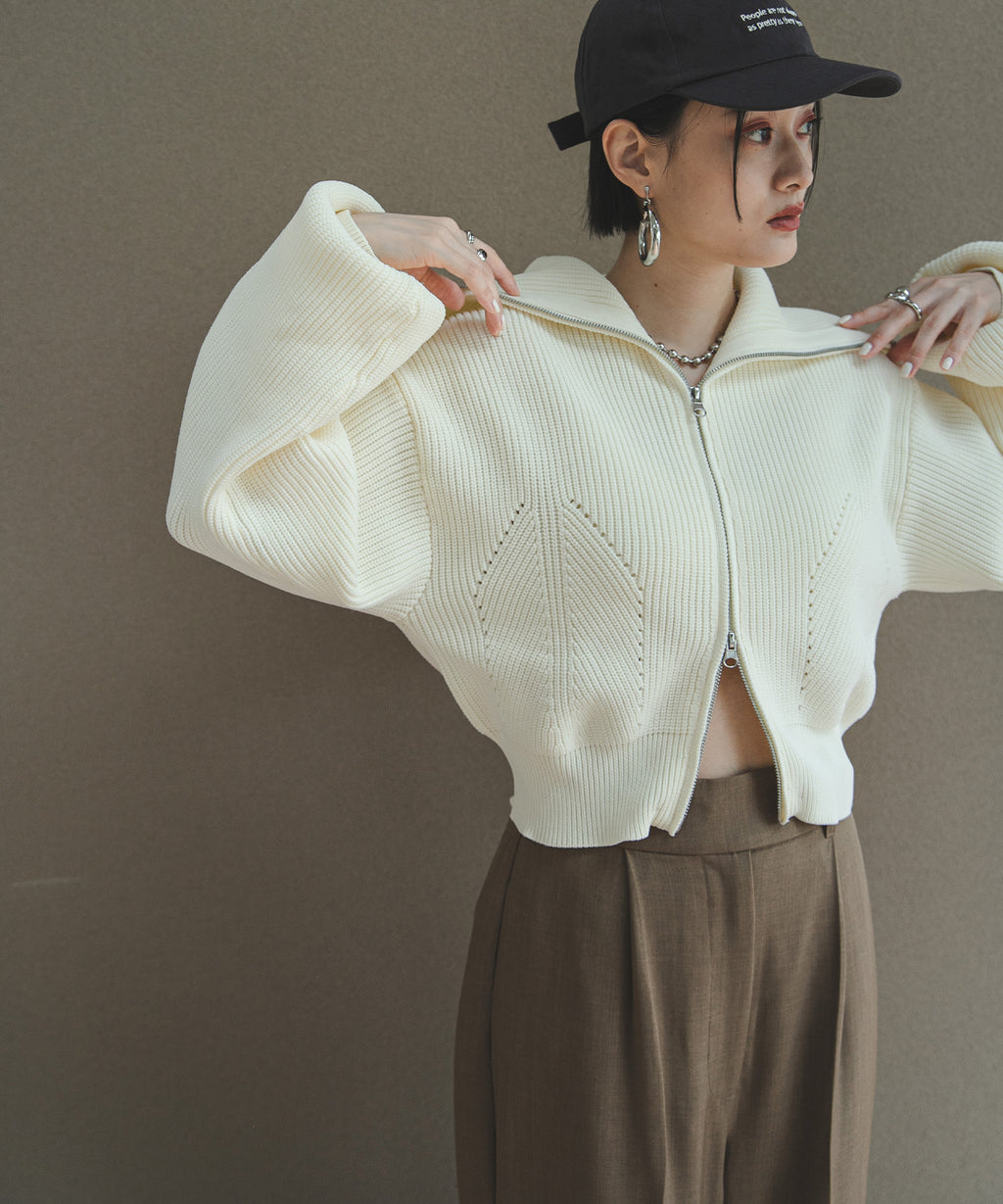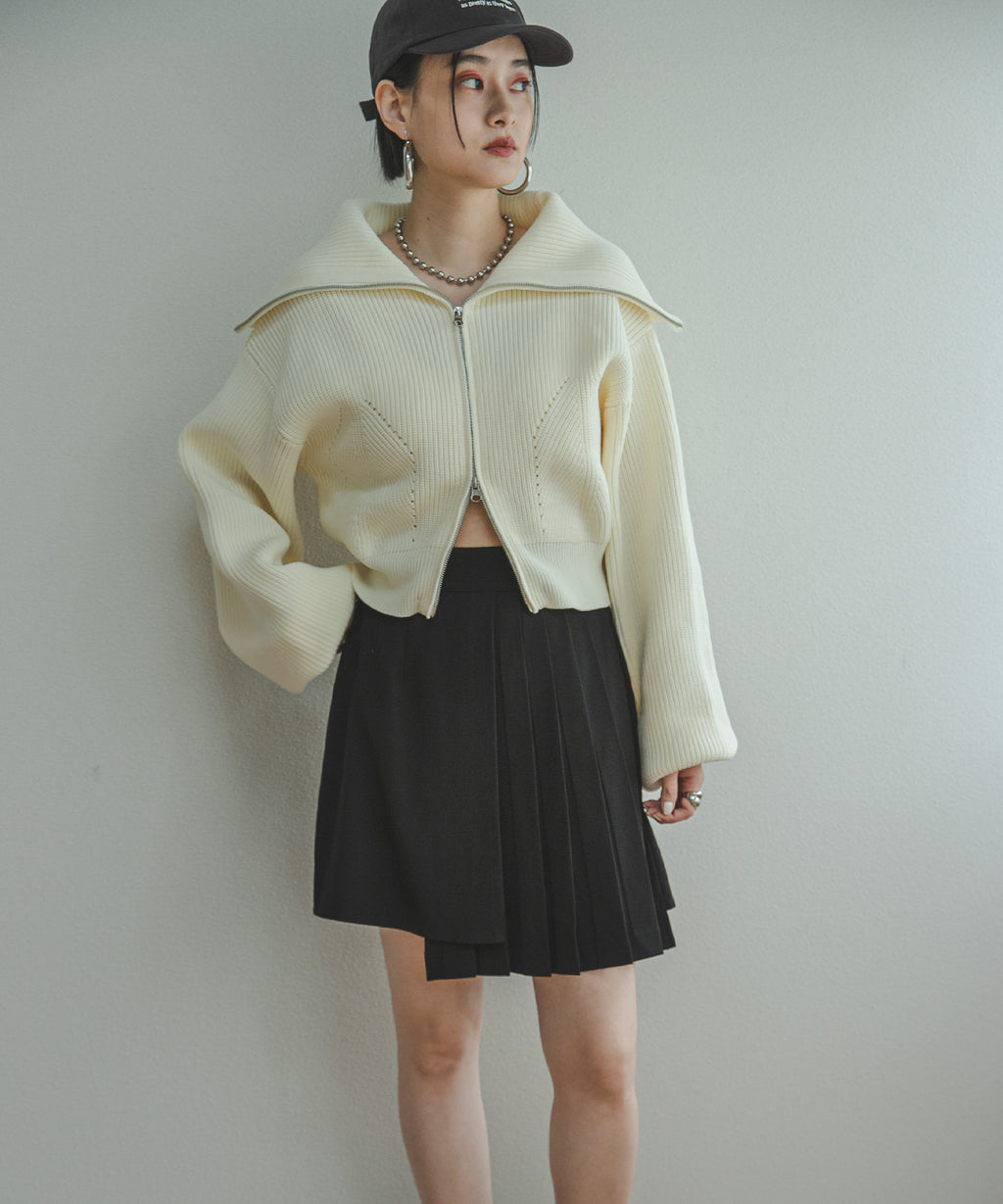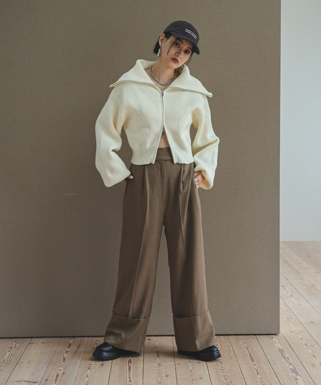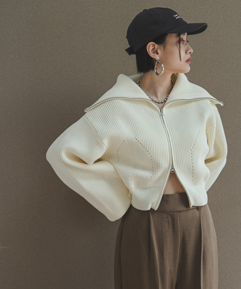 襟部分のみジップをあけて、襟の大きさで見せ方を変えたり、肌見せもできる変形可能なニットです。
