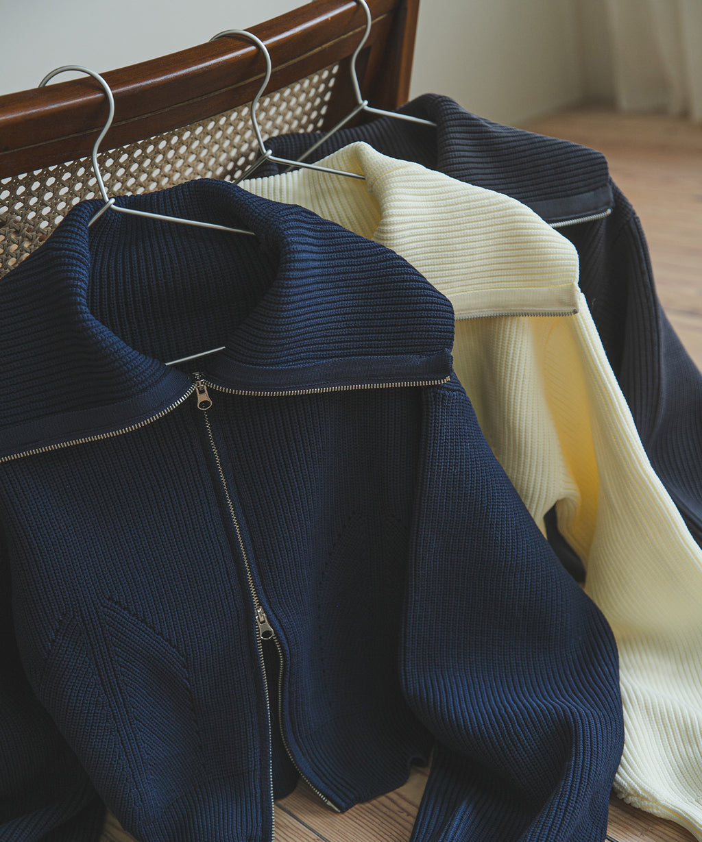 ダブルジップのニットカーディガン。