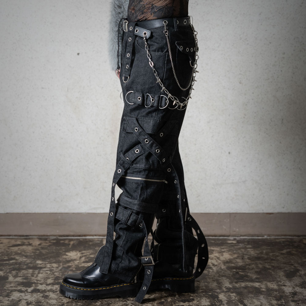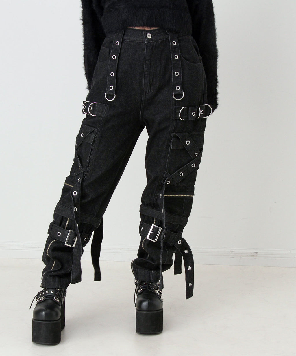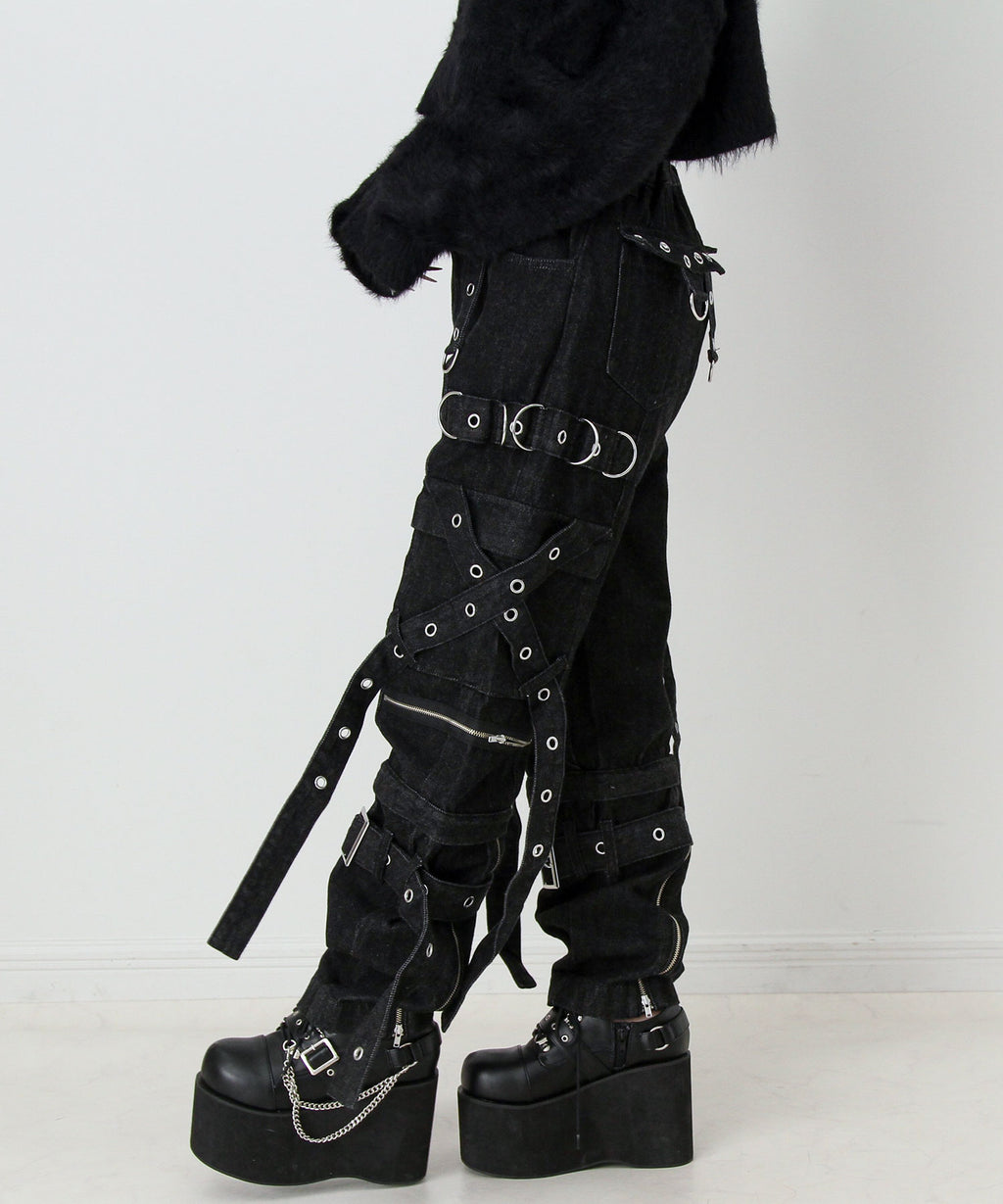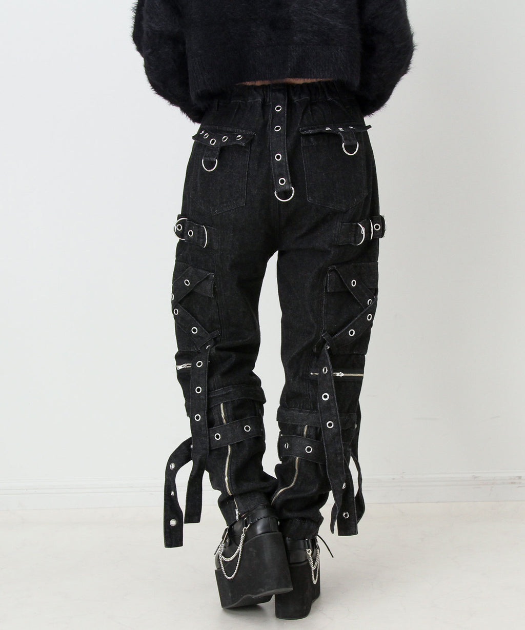 メタルのアイレットや付属がアクセントのデニムパンツ。