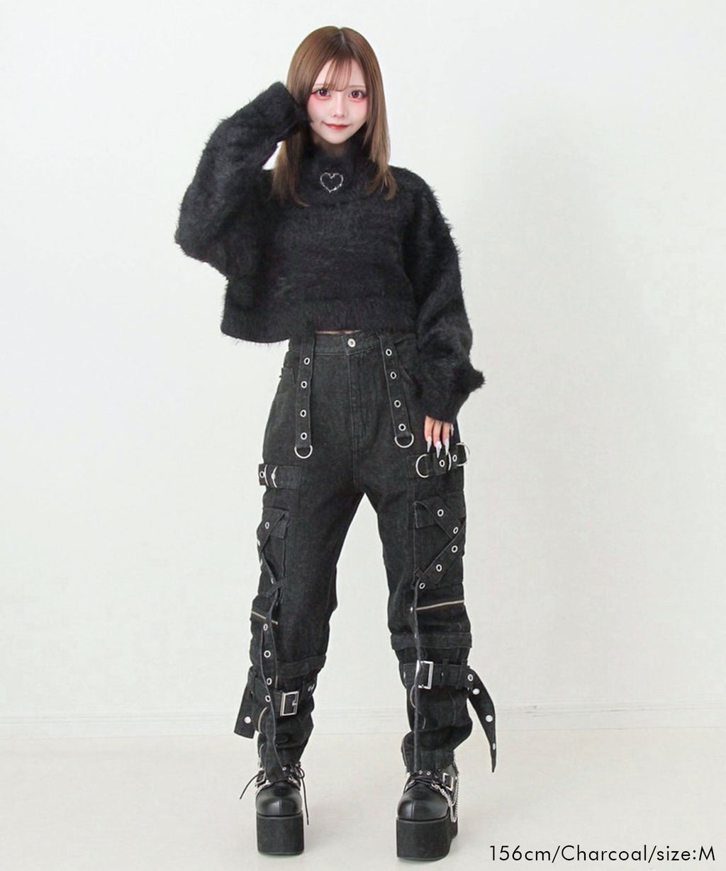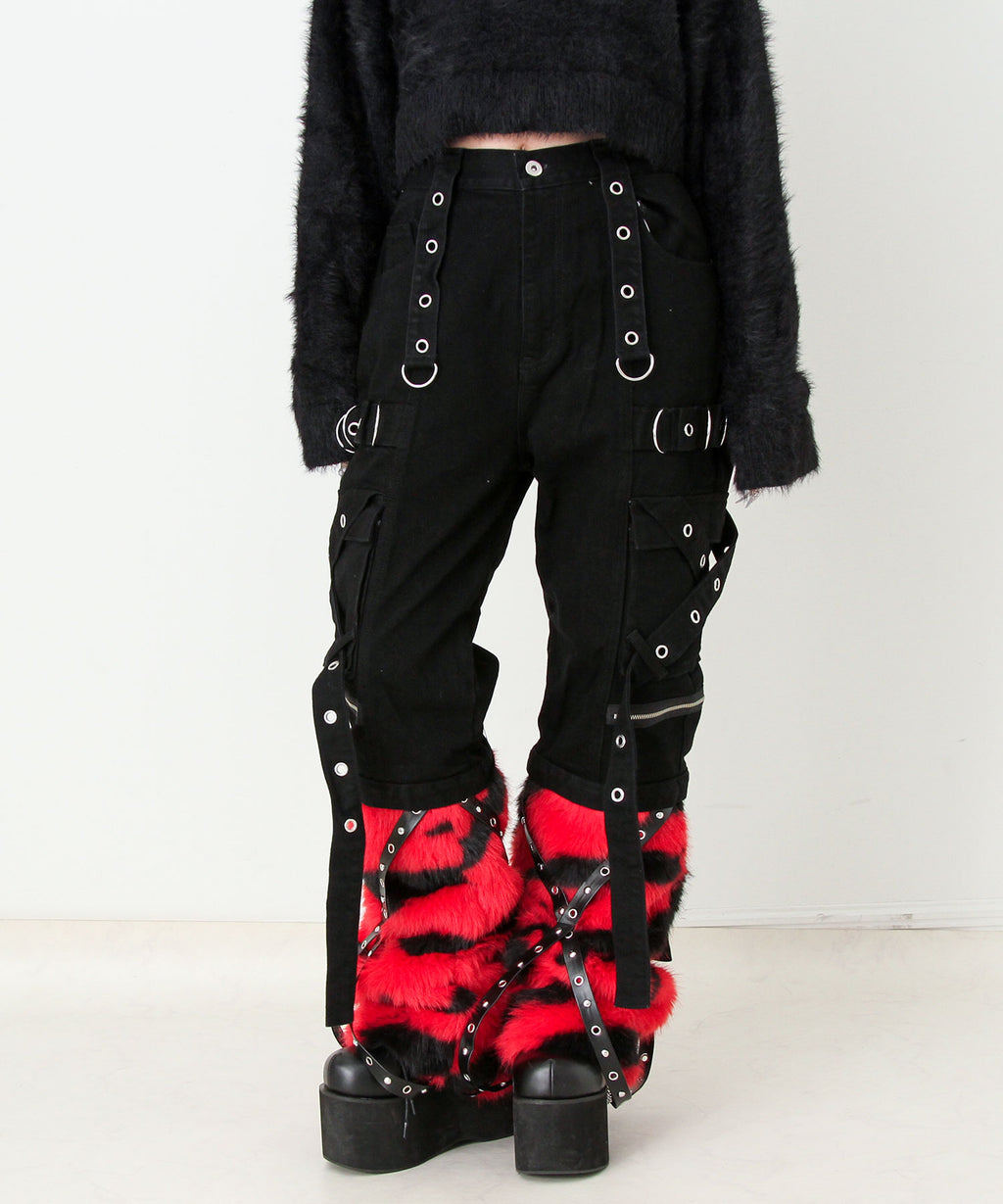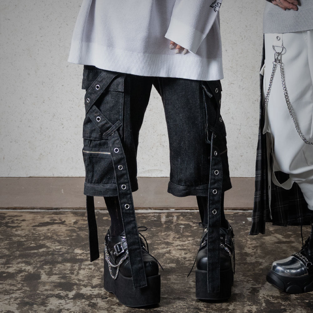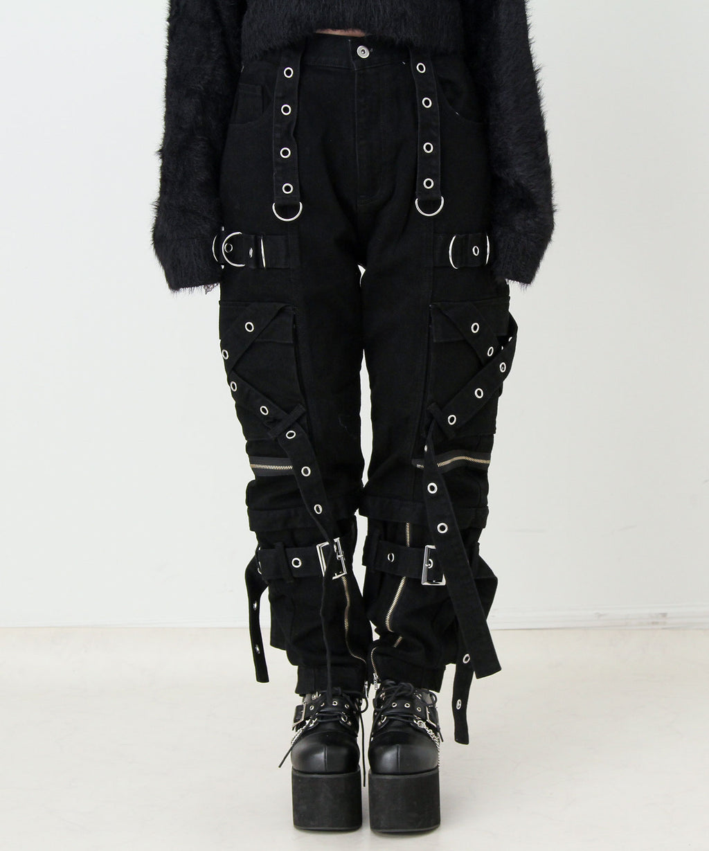 メタルのアイレットや付属がアクセントのデニムパンツ。