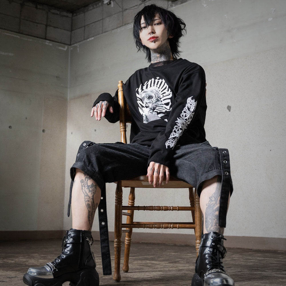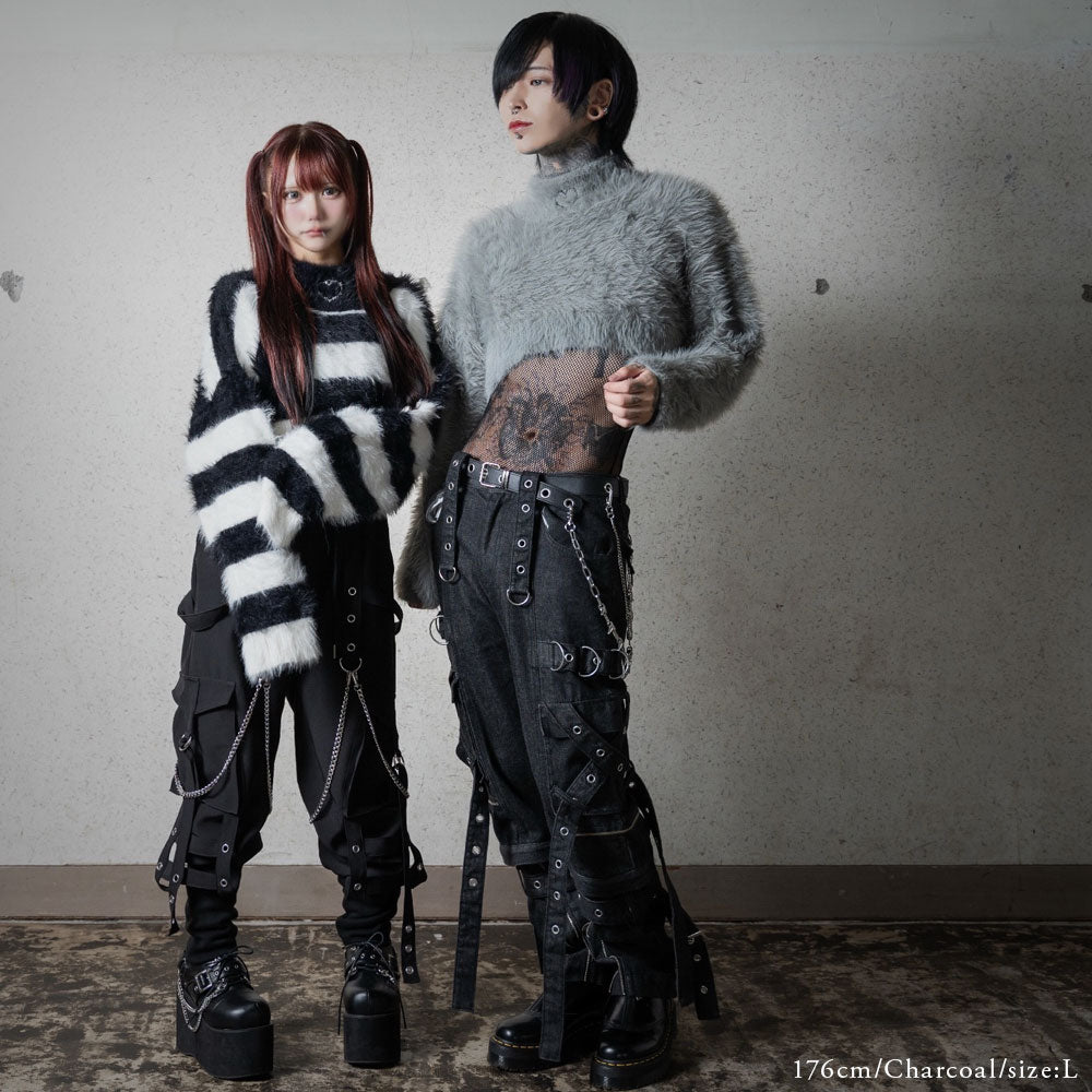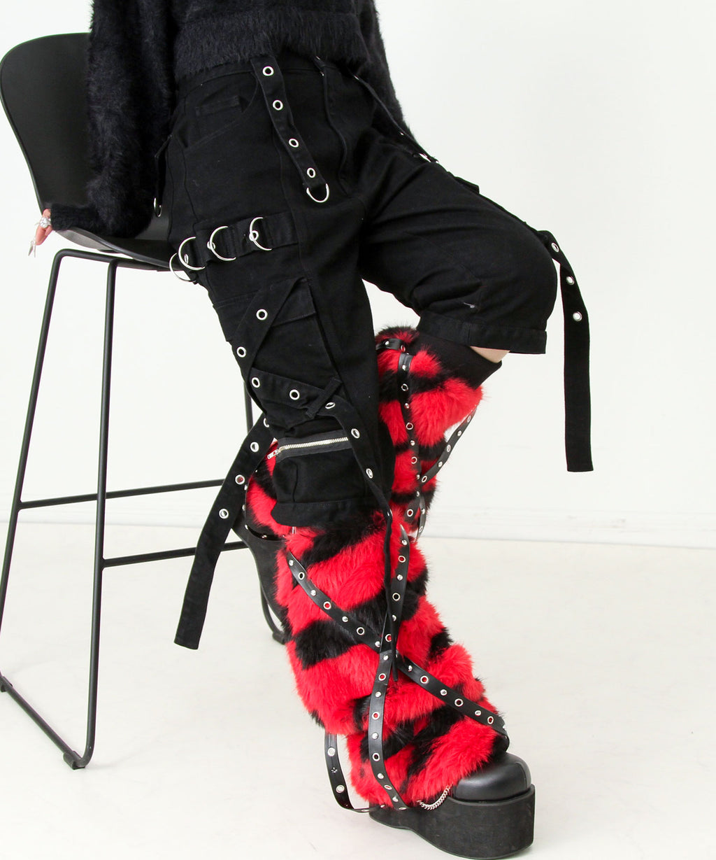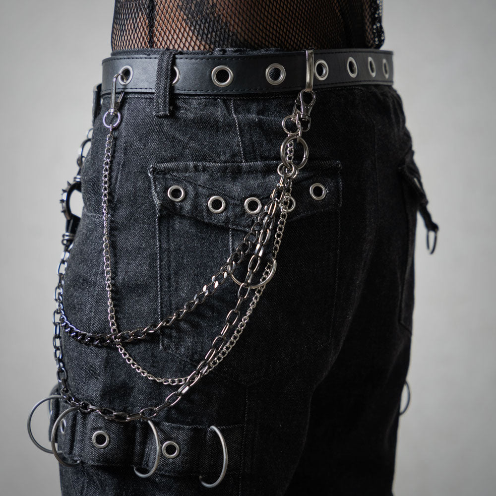 メタルのアイレットや付属がアクセントのデニムパンツ。