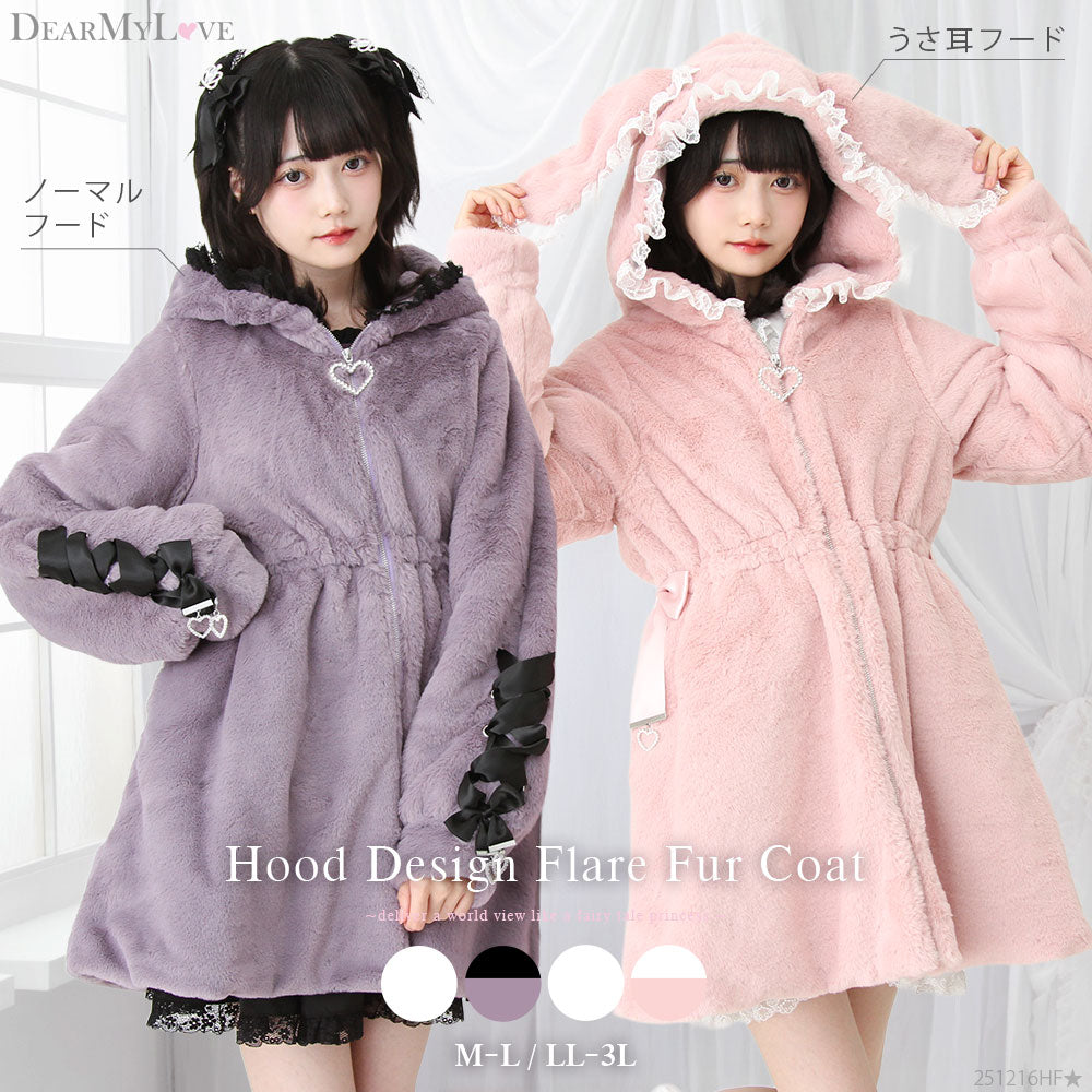かわいいレースたっぷりのうさみみ付きフードデザインから選べるファーコートです。