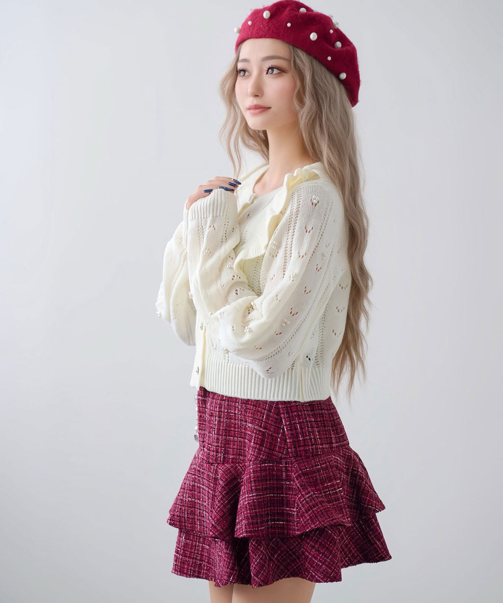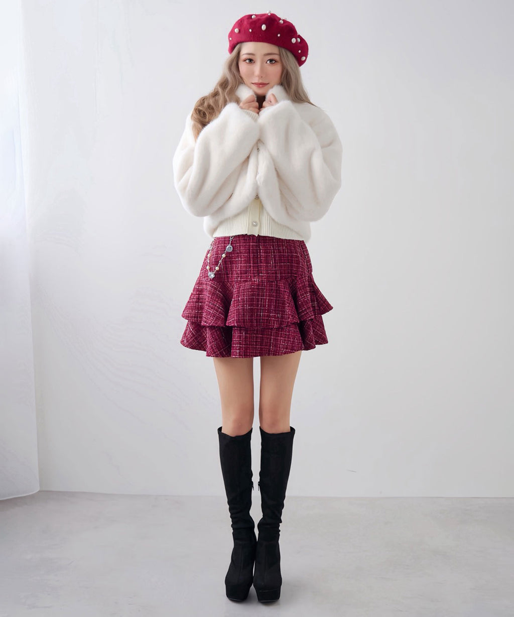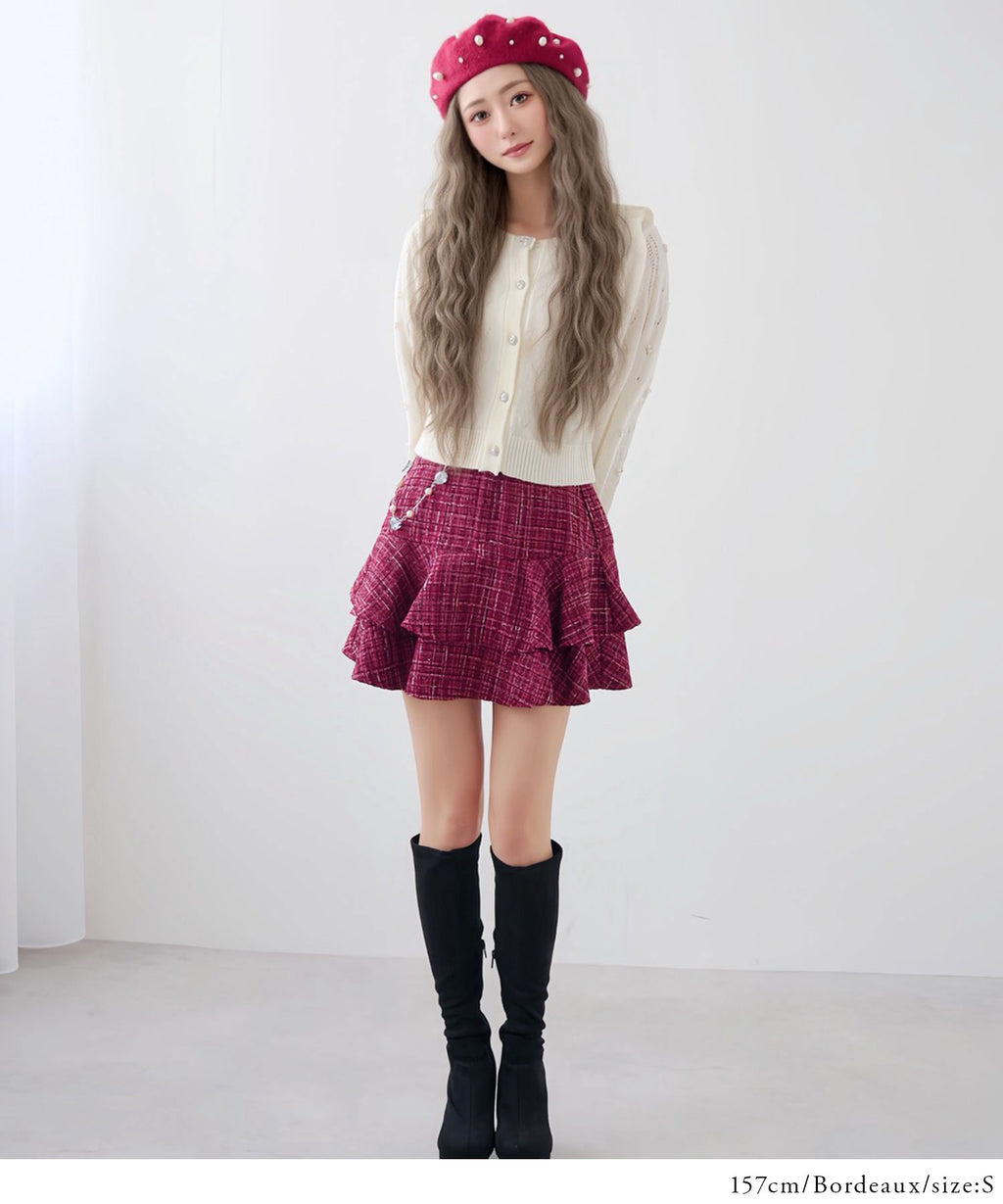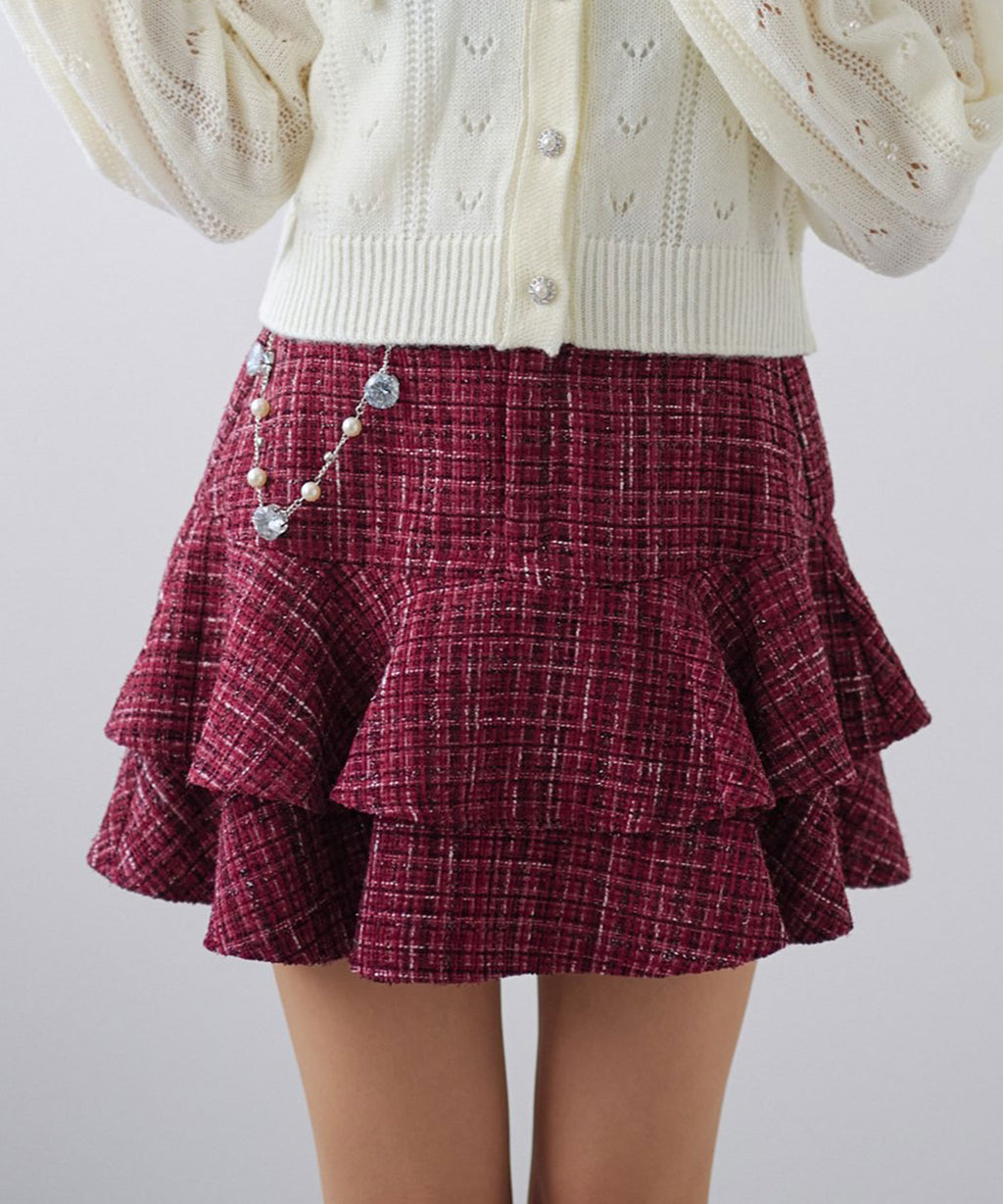 裾だけのティアードデザインの柔らかさとツイード素材のクラシカルな雰囲気が組み合わさることで、