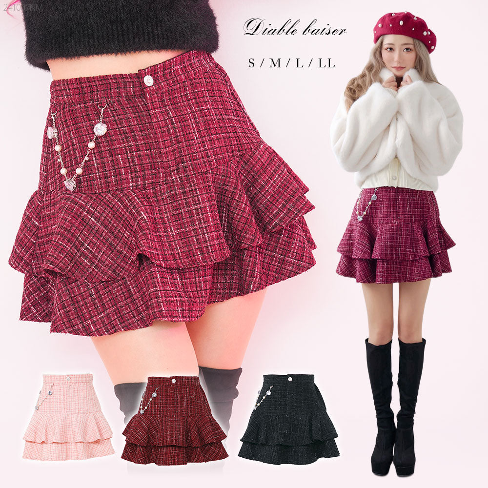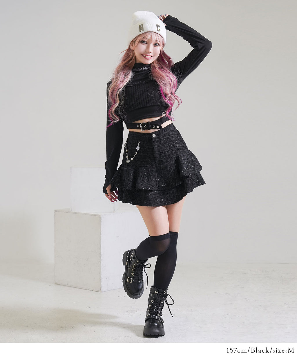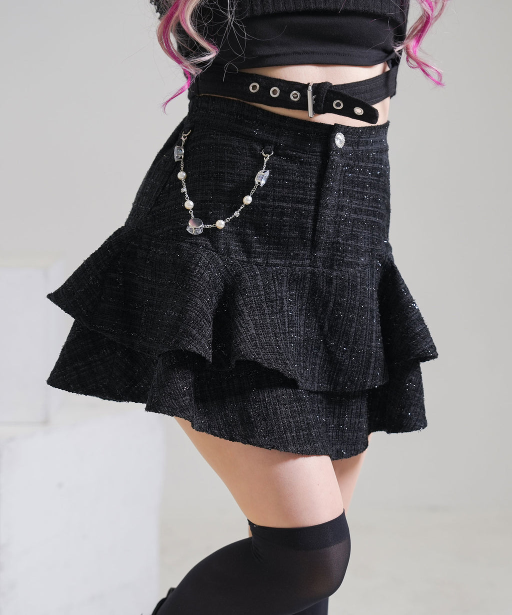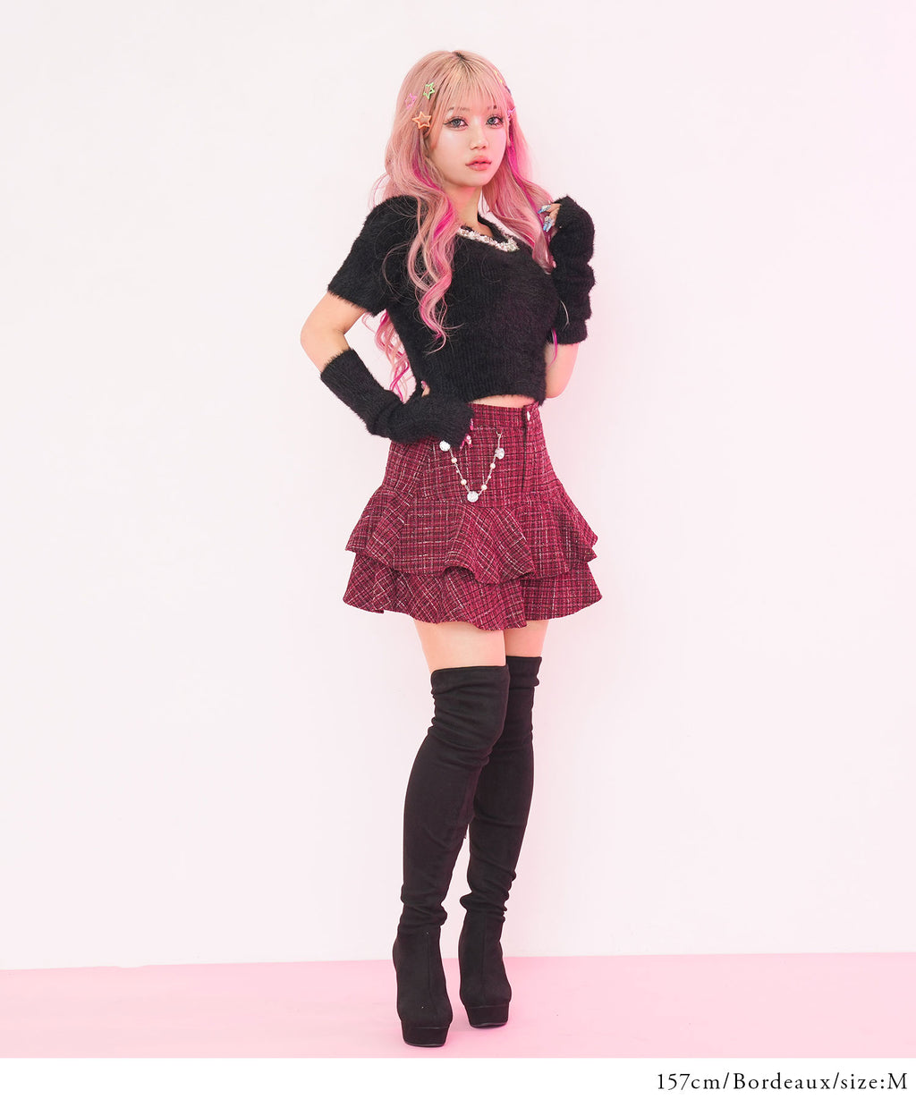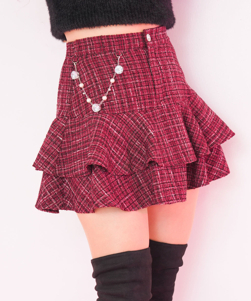 裾だけのティアードデザインの柔らかさとツイード素材のクラシカルな雰囲気が組み合わさることで、