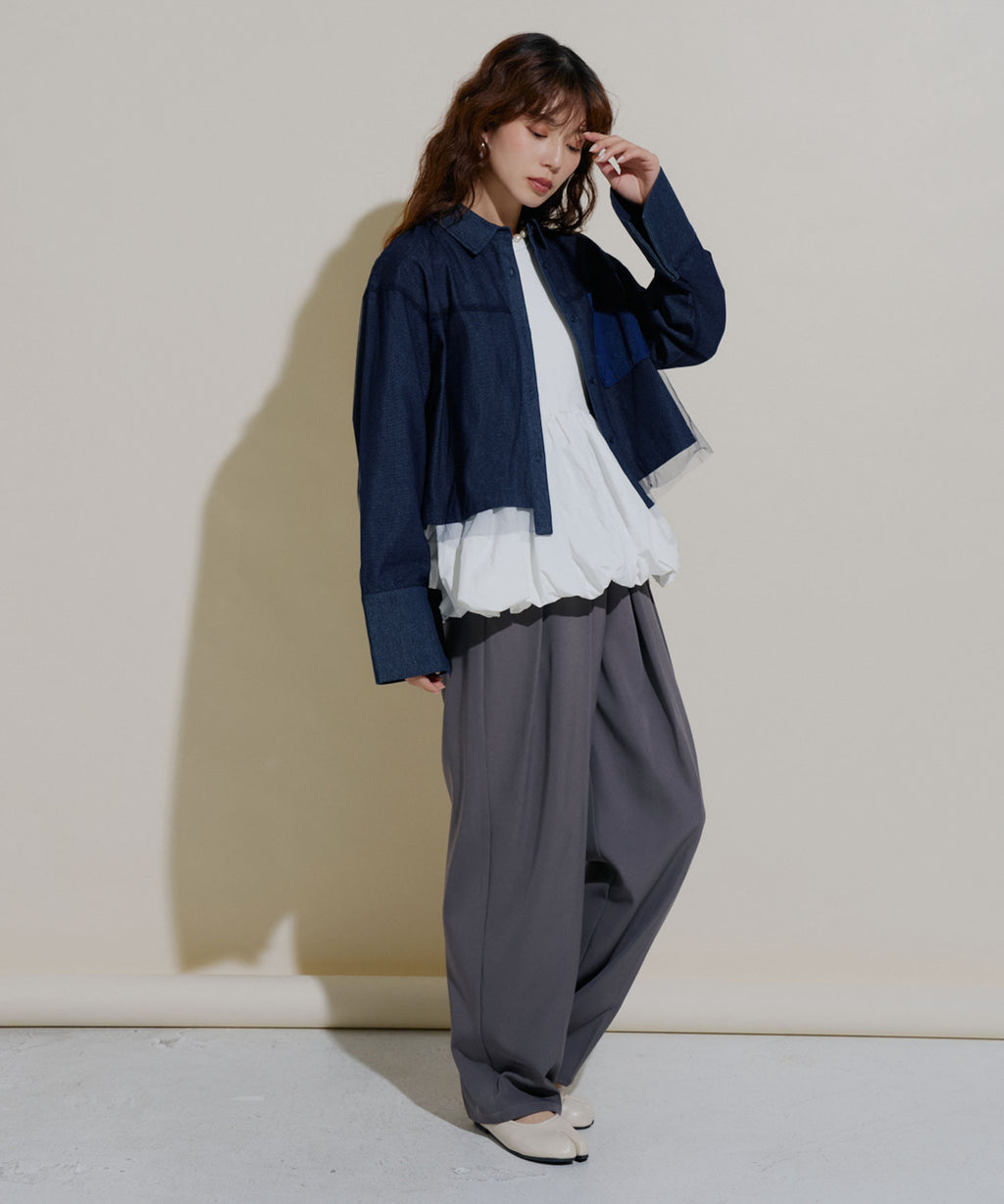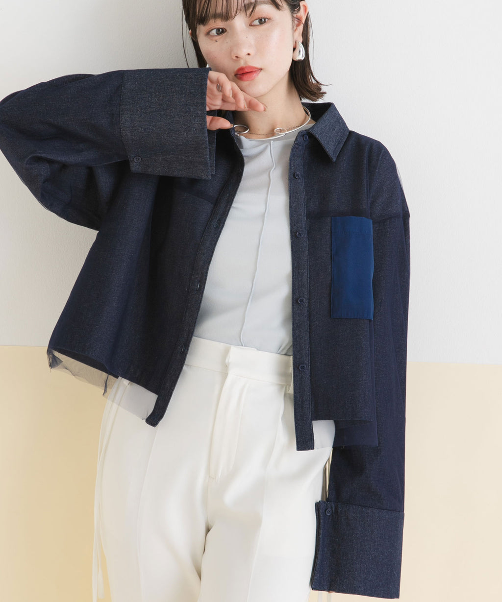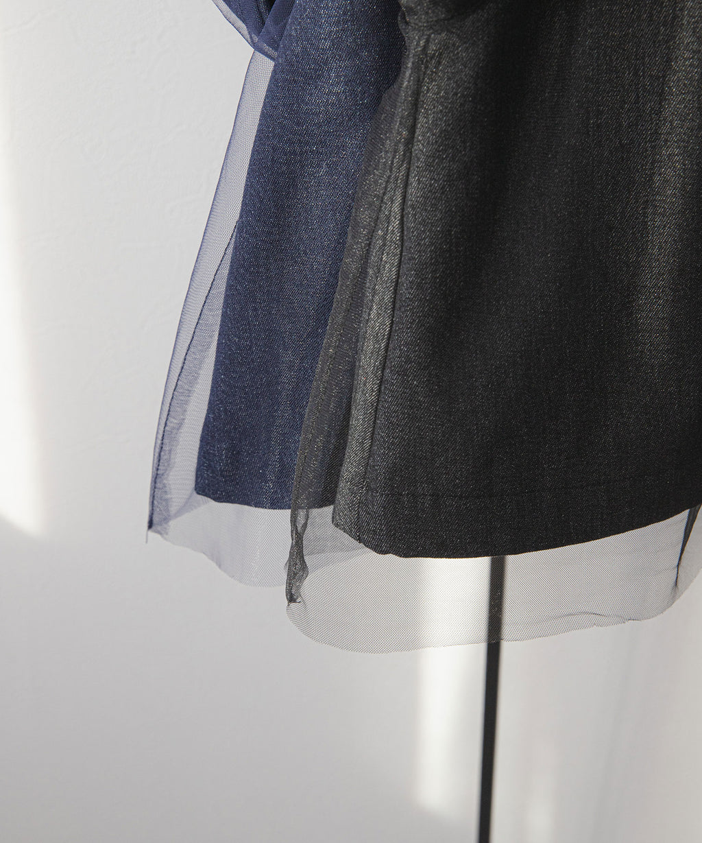 クールなデニム素材と柔らかなチュールの絶妙な組み合わせが、トレンド感あふれる一着。