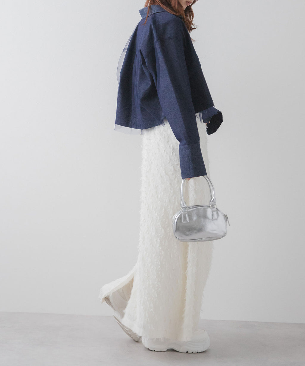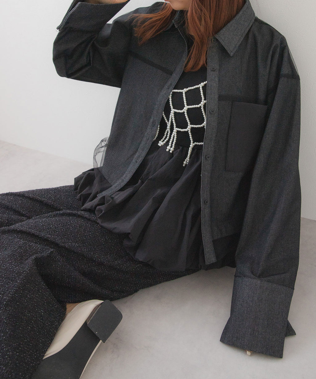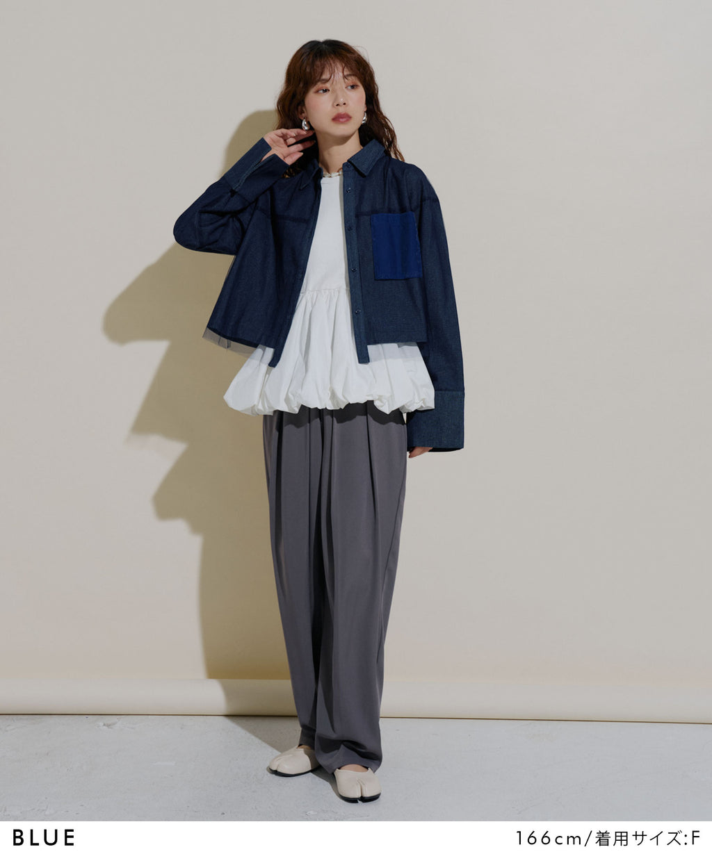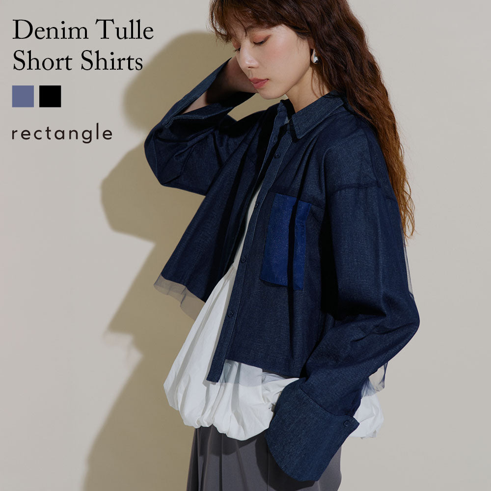 クールなデニム素材と柔らかなチュールの絶妙な組み合わせが、トレンド感あふれる一着。