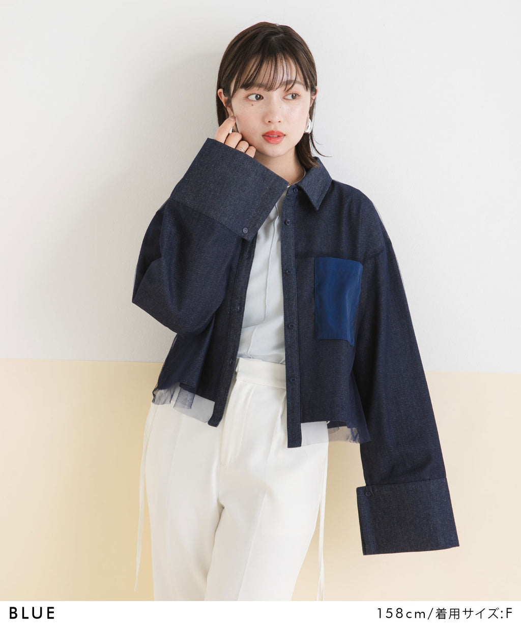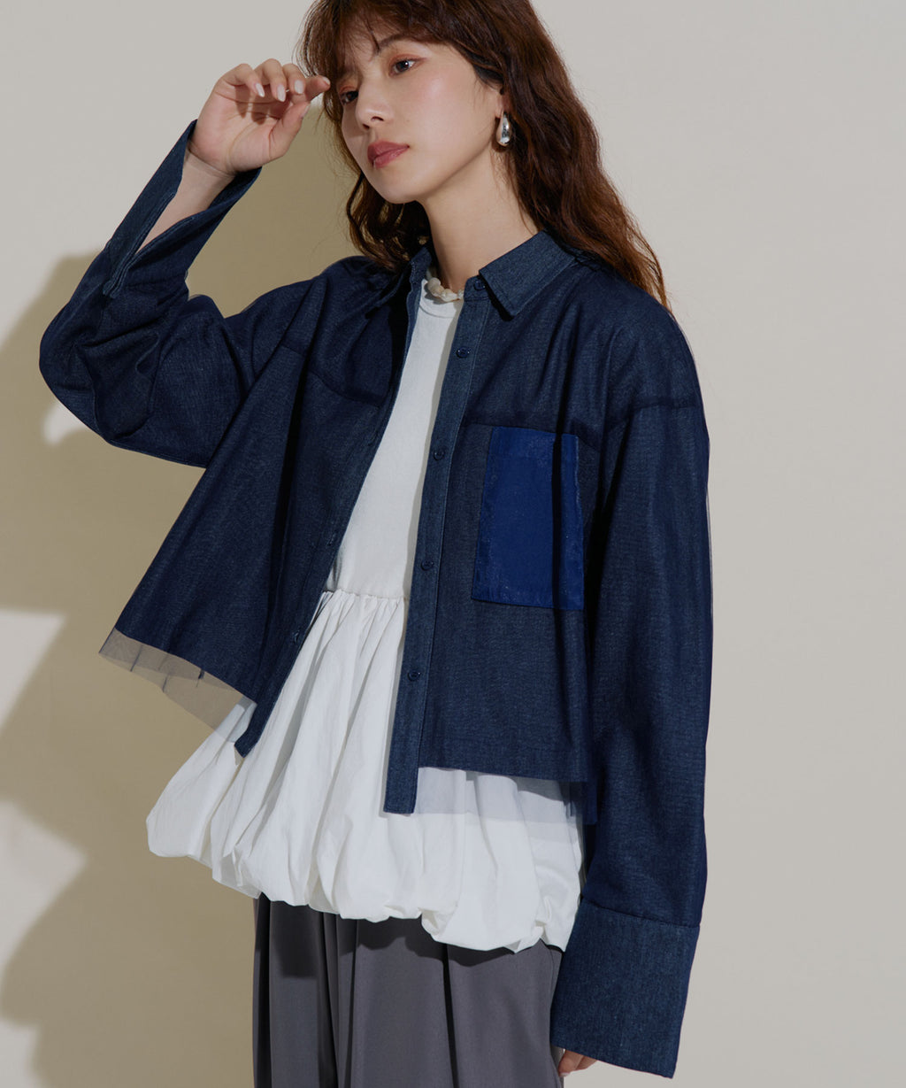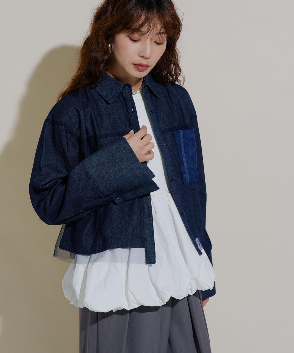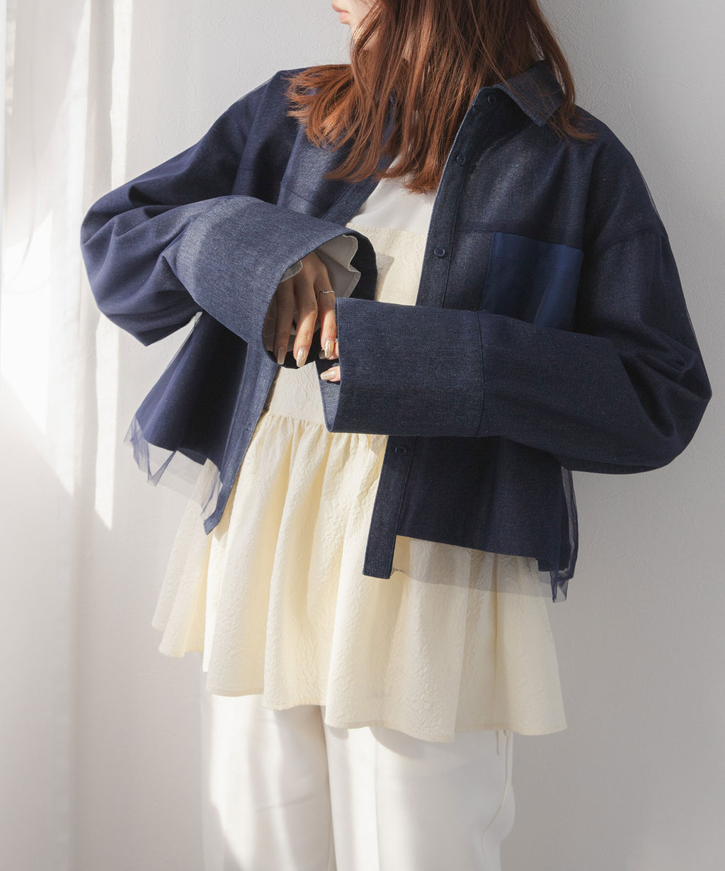 繊細なチュールがレイヤードされたデニムショートジャケット。