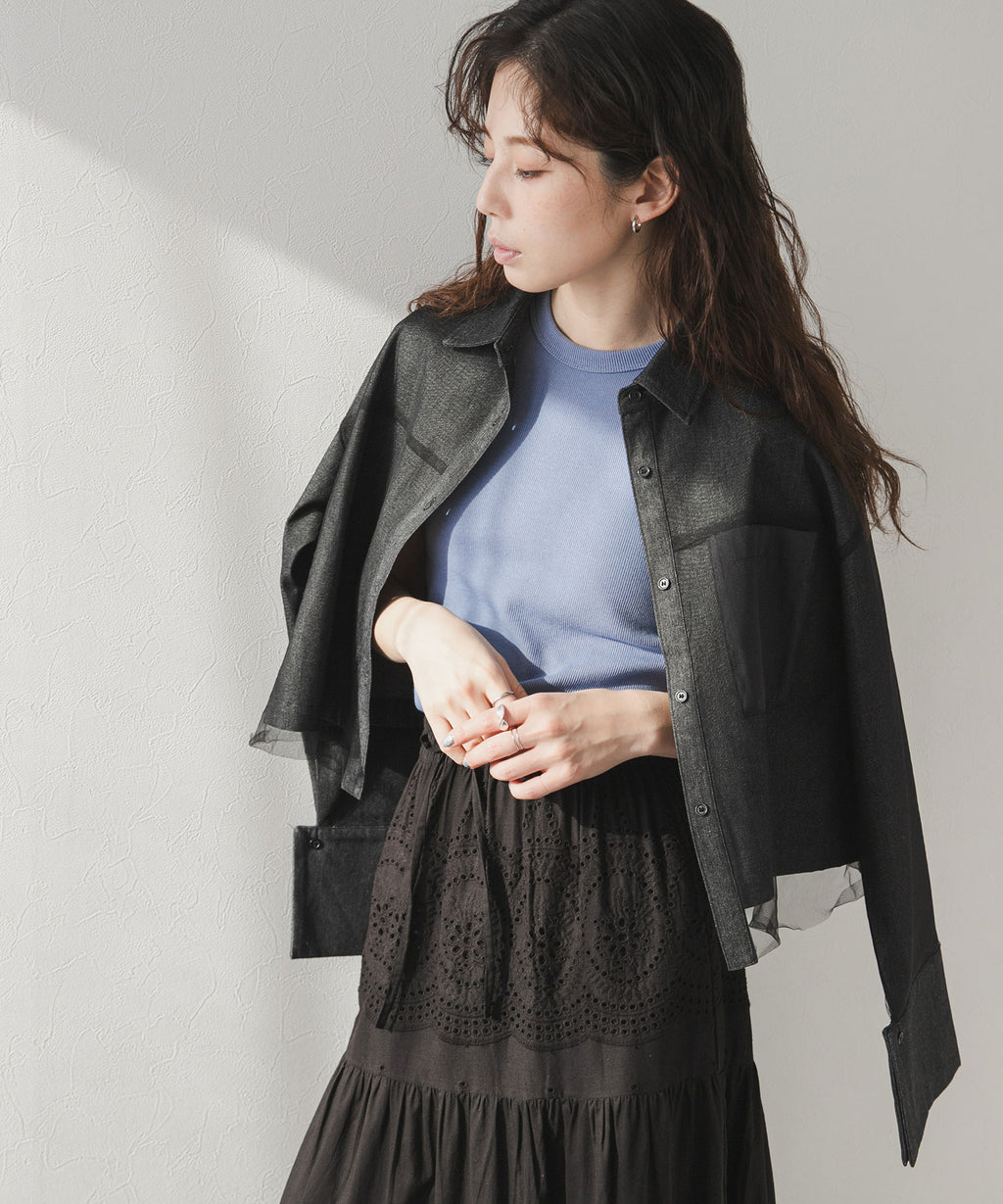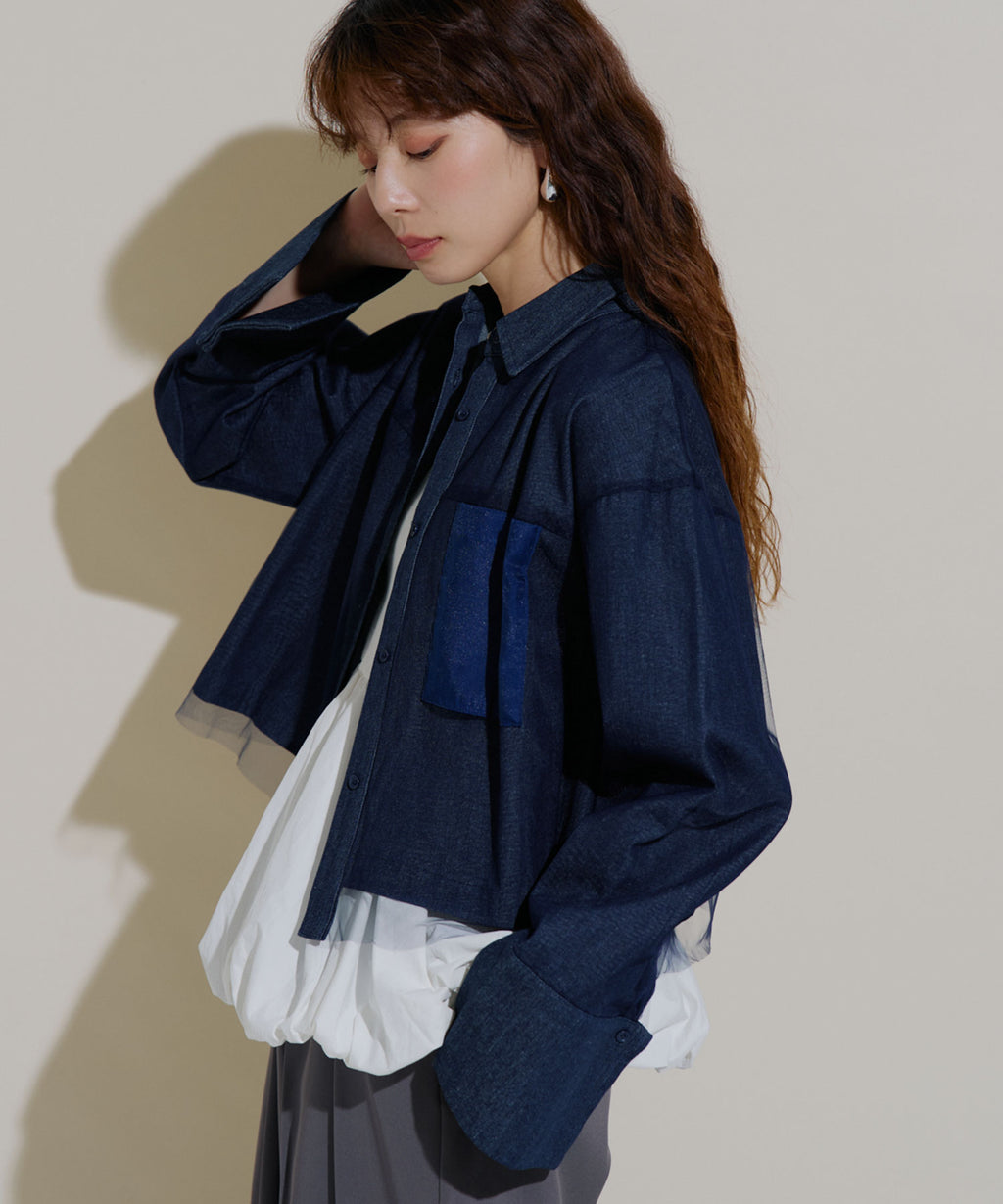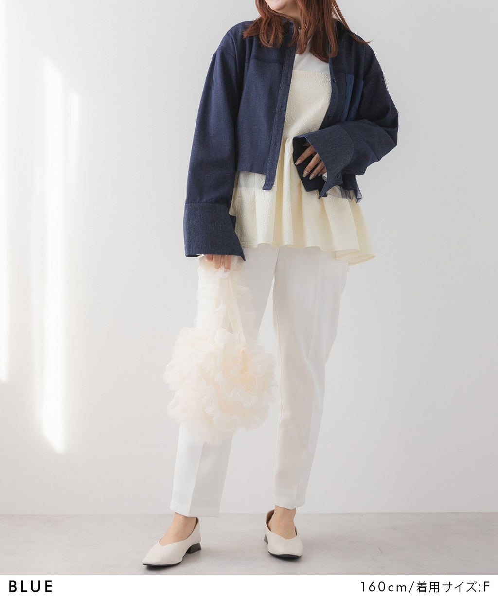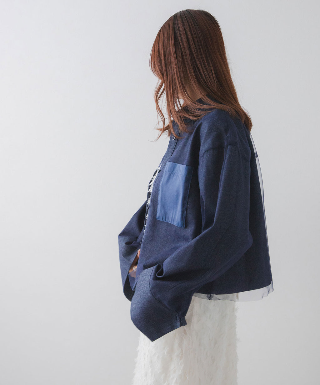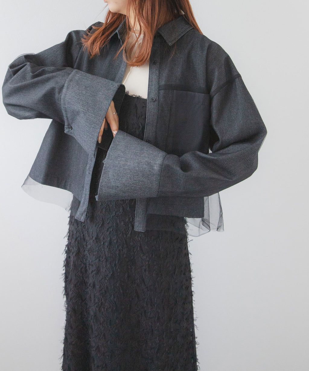 繊細なチュールがレイヤードされたデニムショートジャケット。