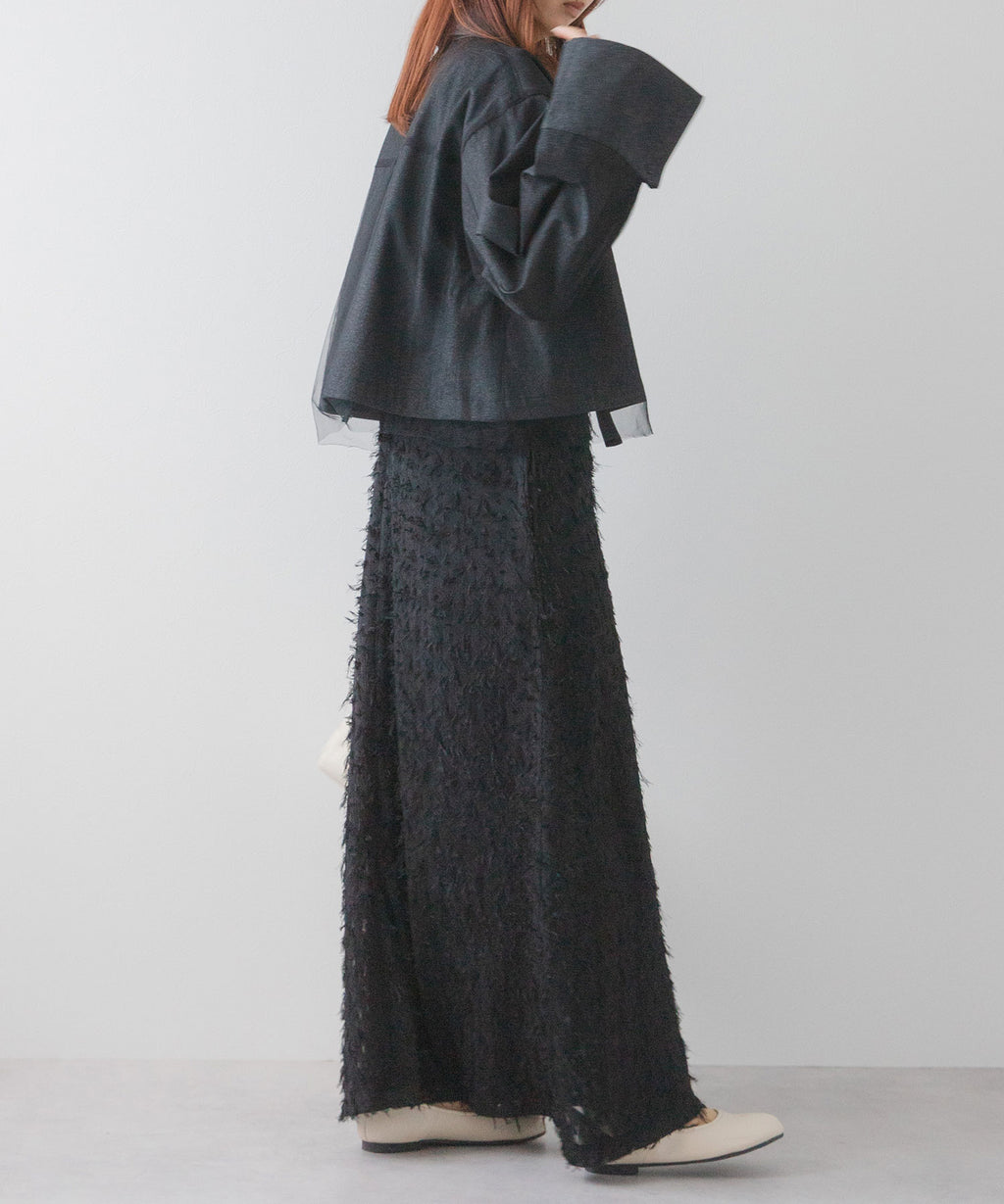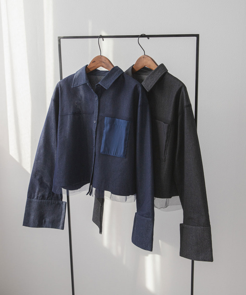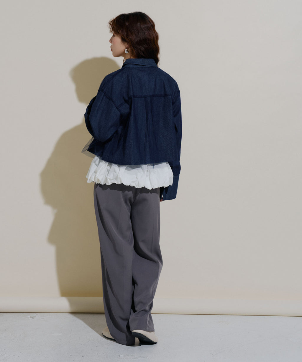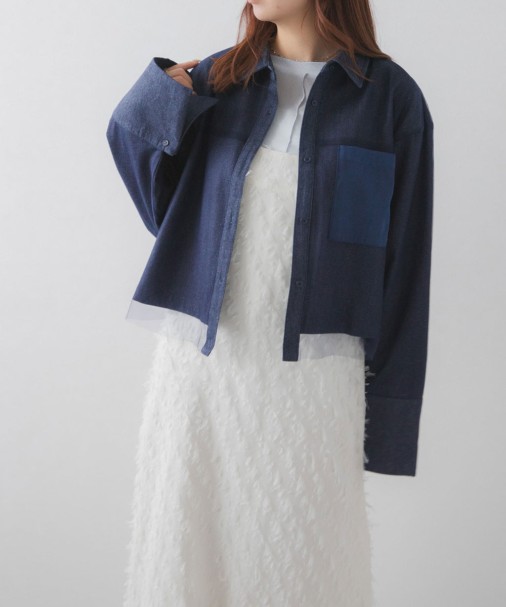 繊細なチュールがレイヤードされたデニムショートジャケット。