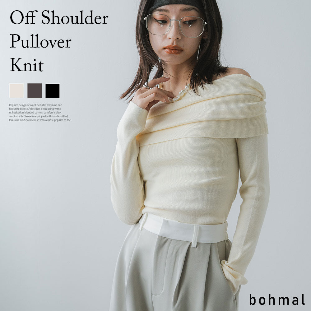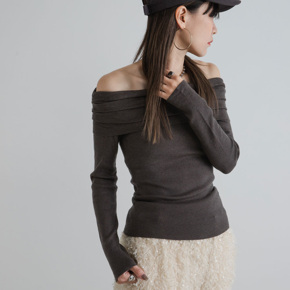 トレンド感あふれる、オフショルダーのニットです。