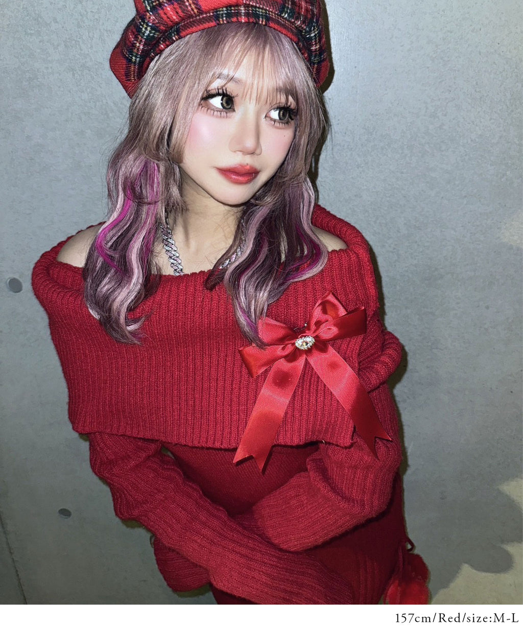 デコルテを美しく見せるオフショルダーデザインで、女性らしい雰囲気を引き立てます。