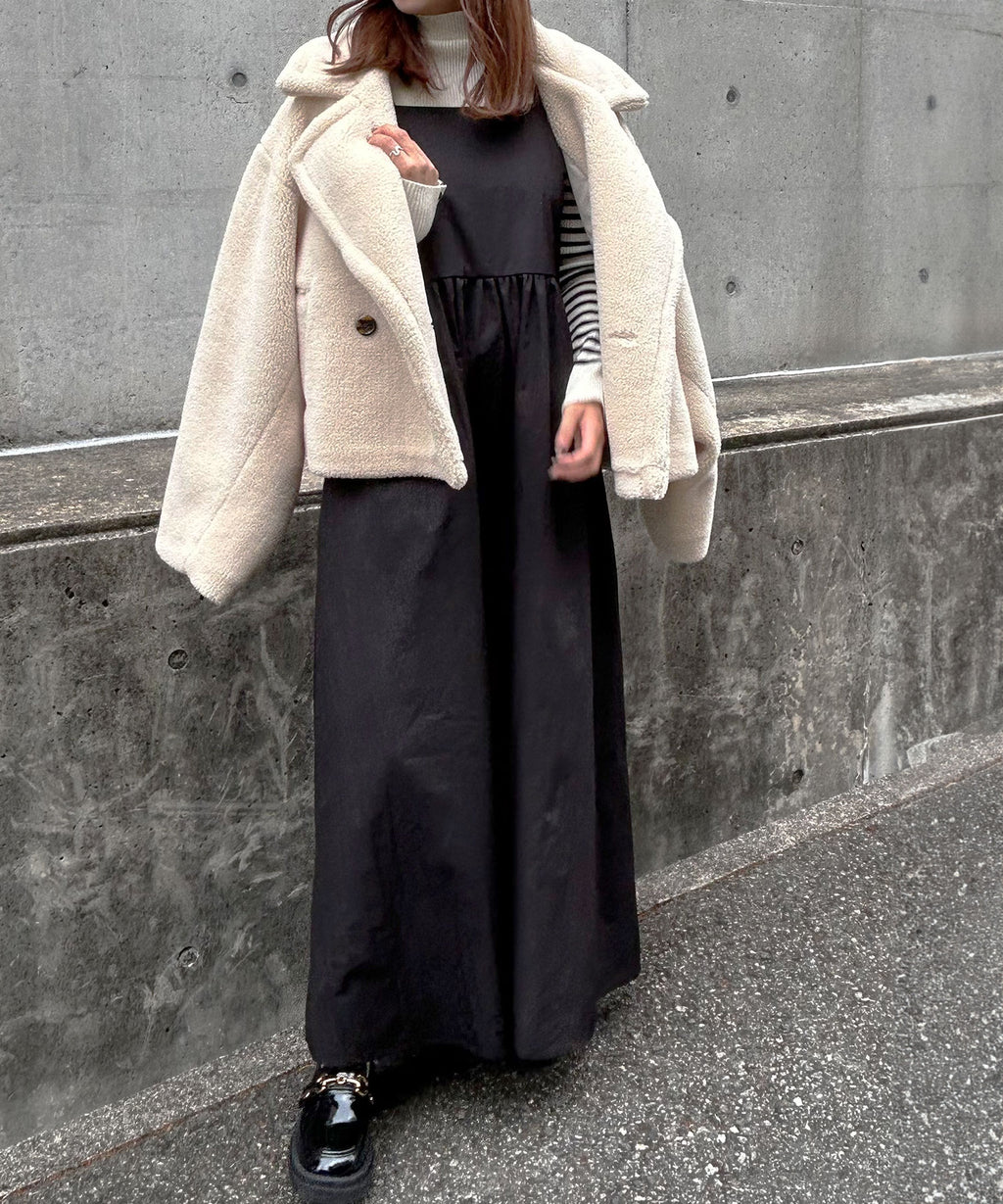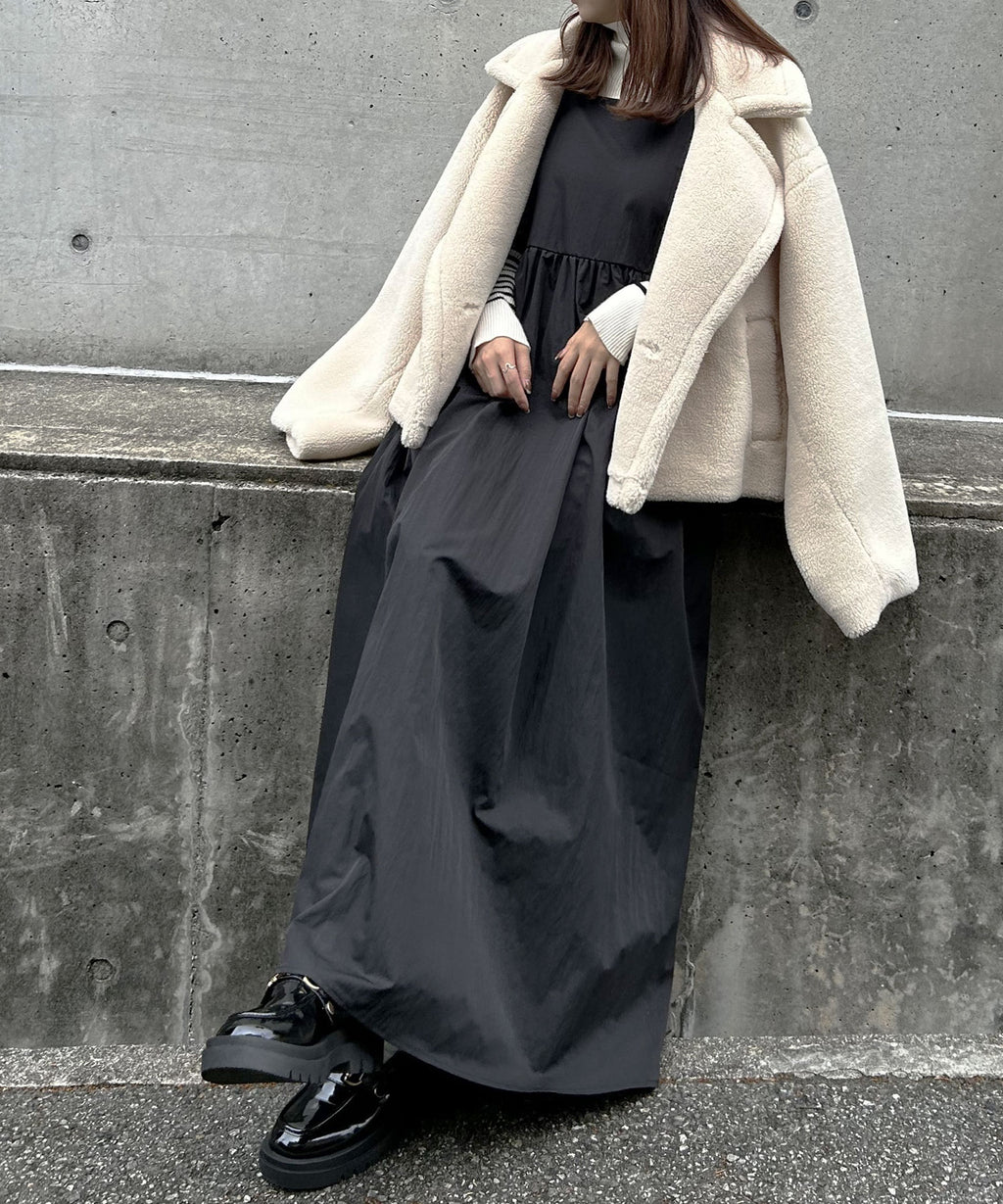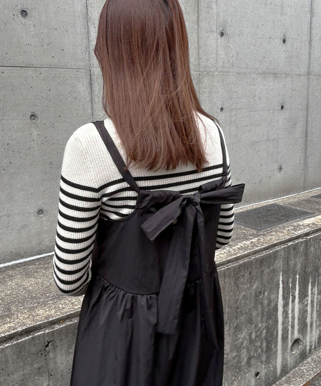 ワンピースの上からハイゲージニットを着たコーデも◎