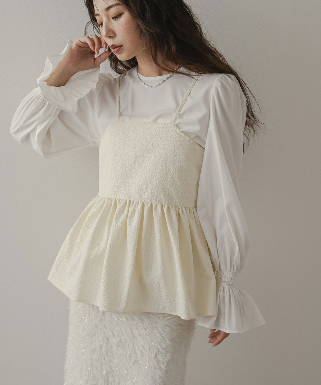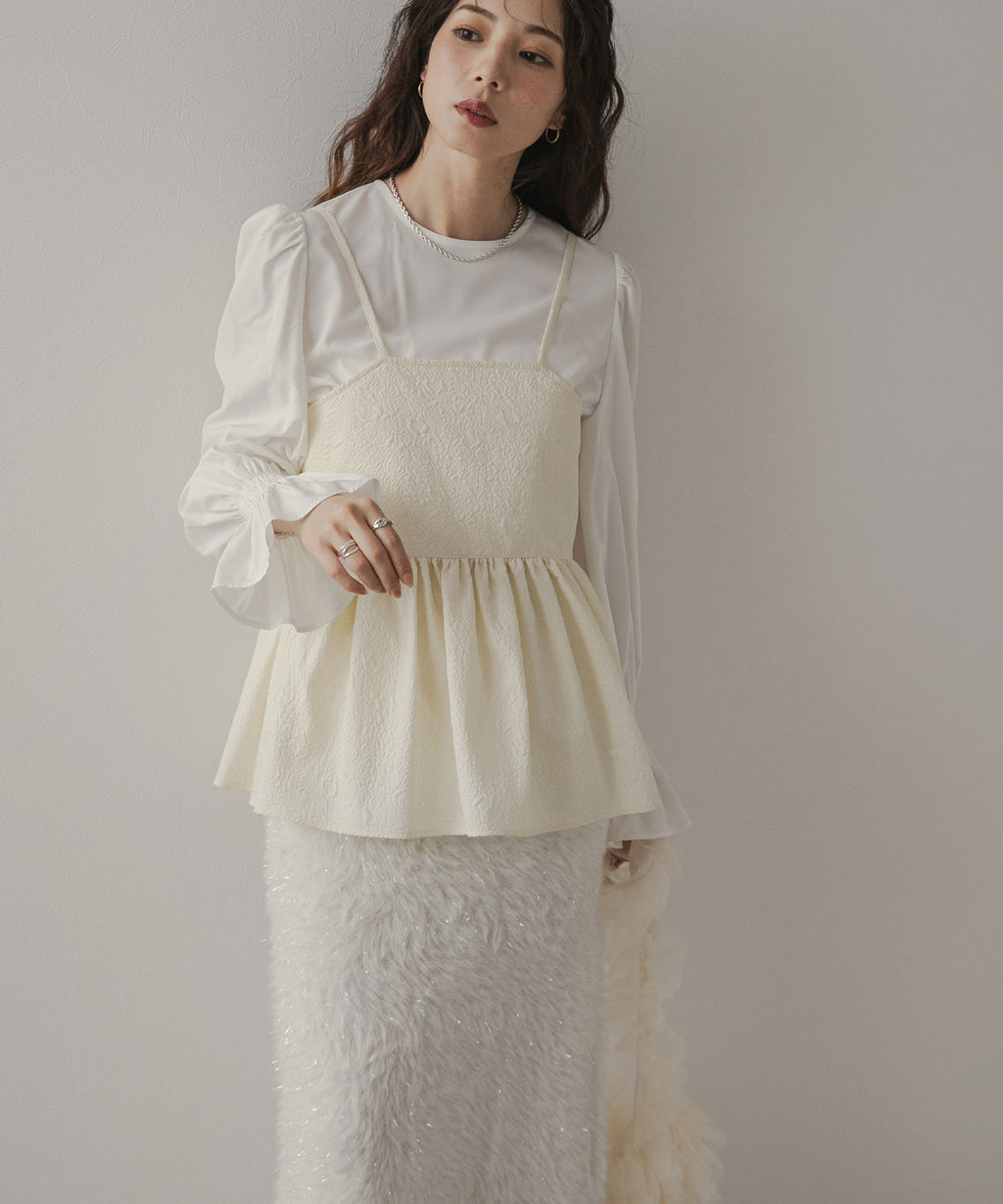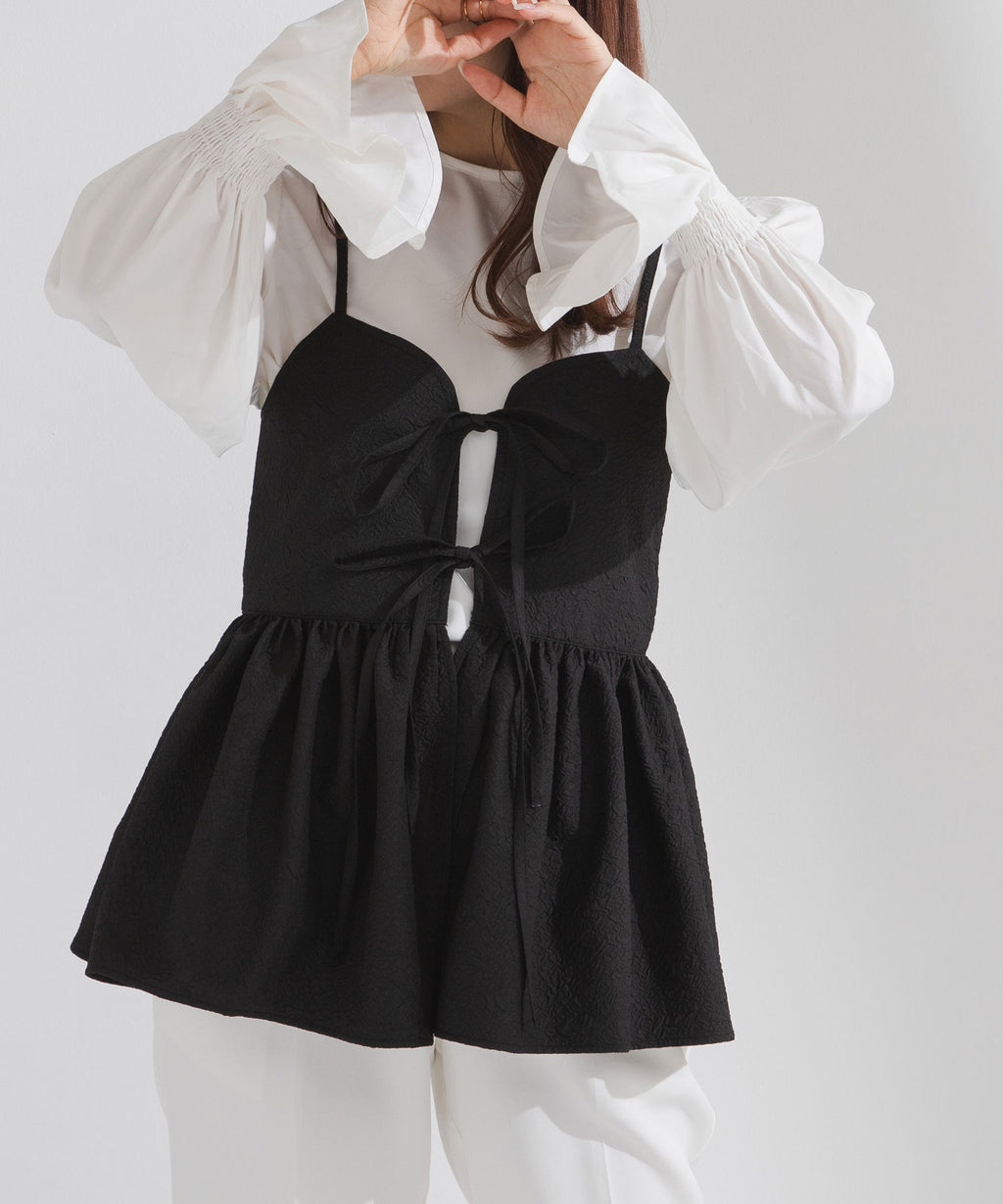 立体感のあるジャガードデザインで前後2wayやたすき掛け、ビスチェなどマルチな着こなしが叶うキャミソール。