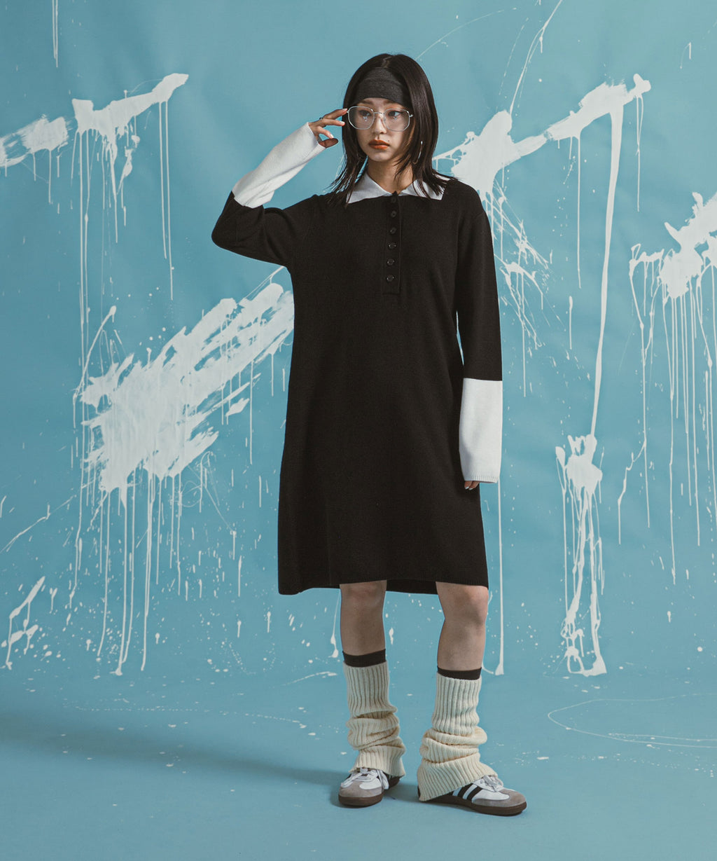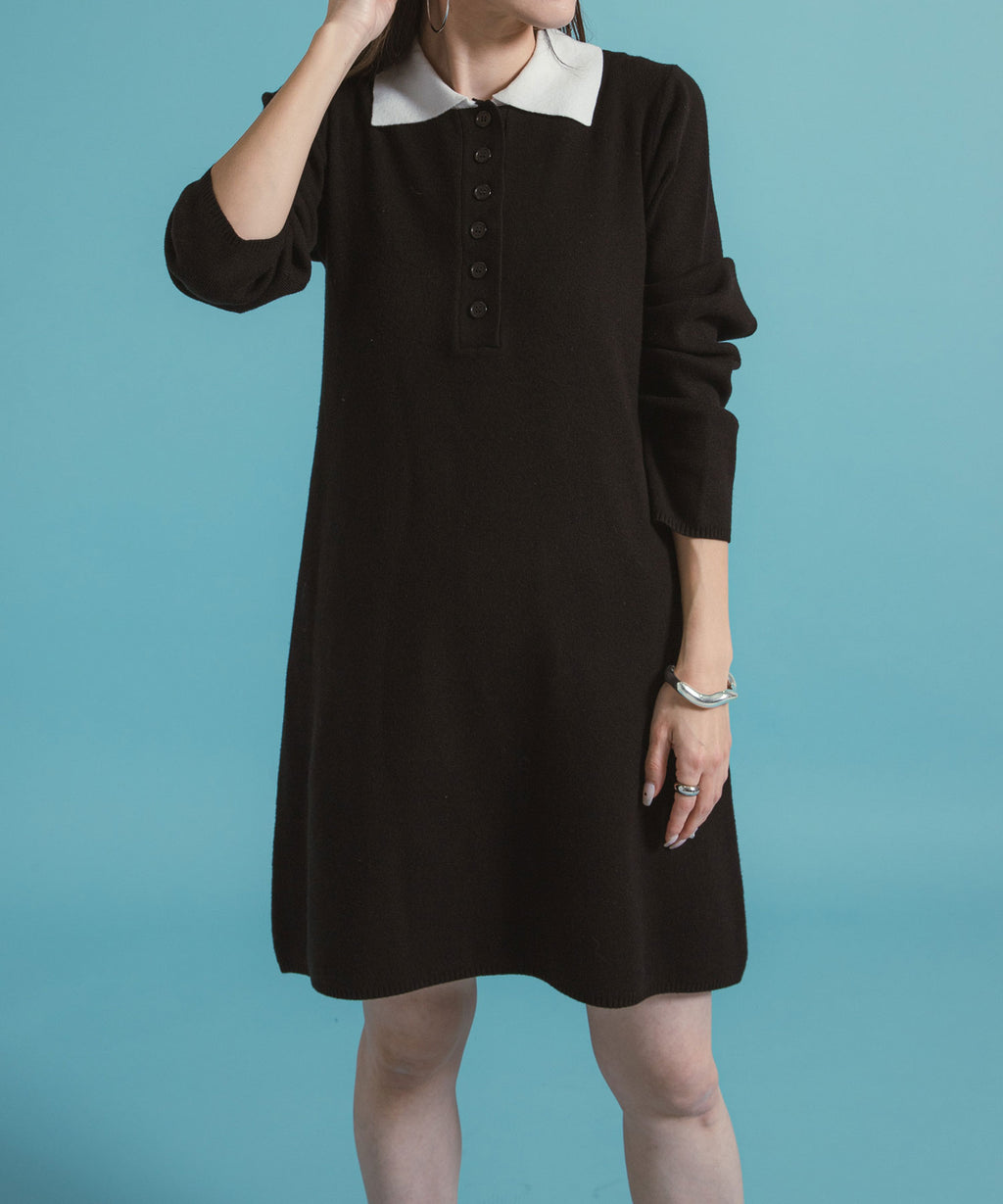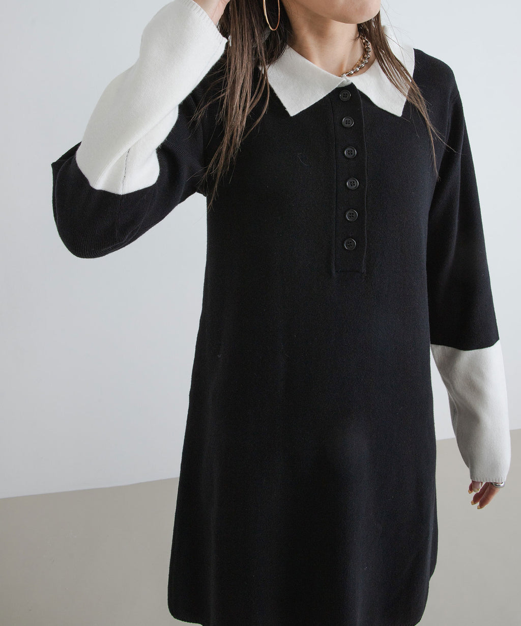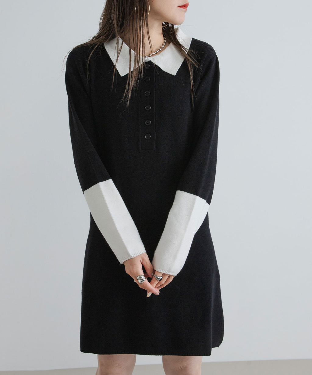 襟の配色や、袖の配色が魅力的なポロニットワンピース。