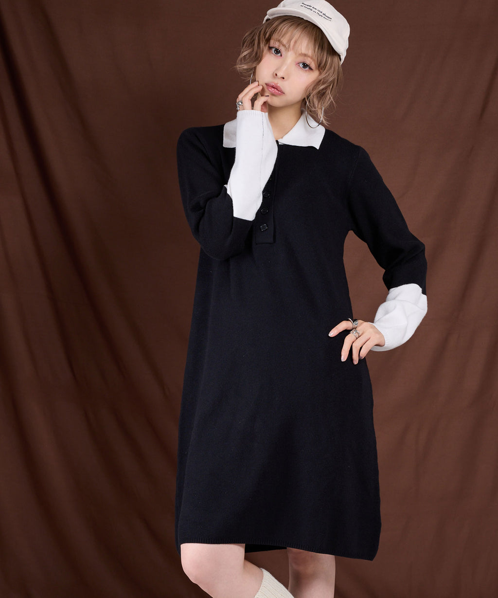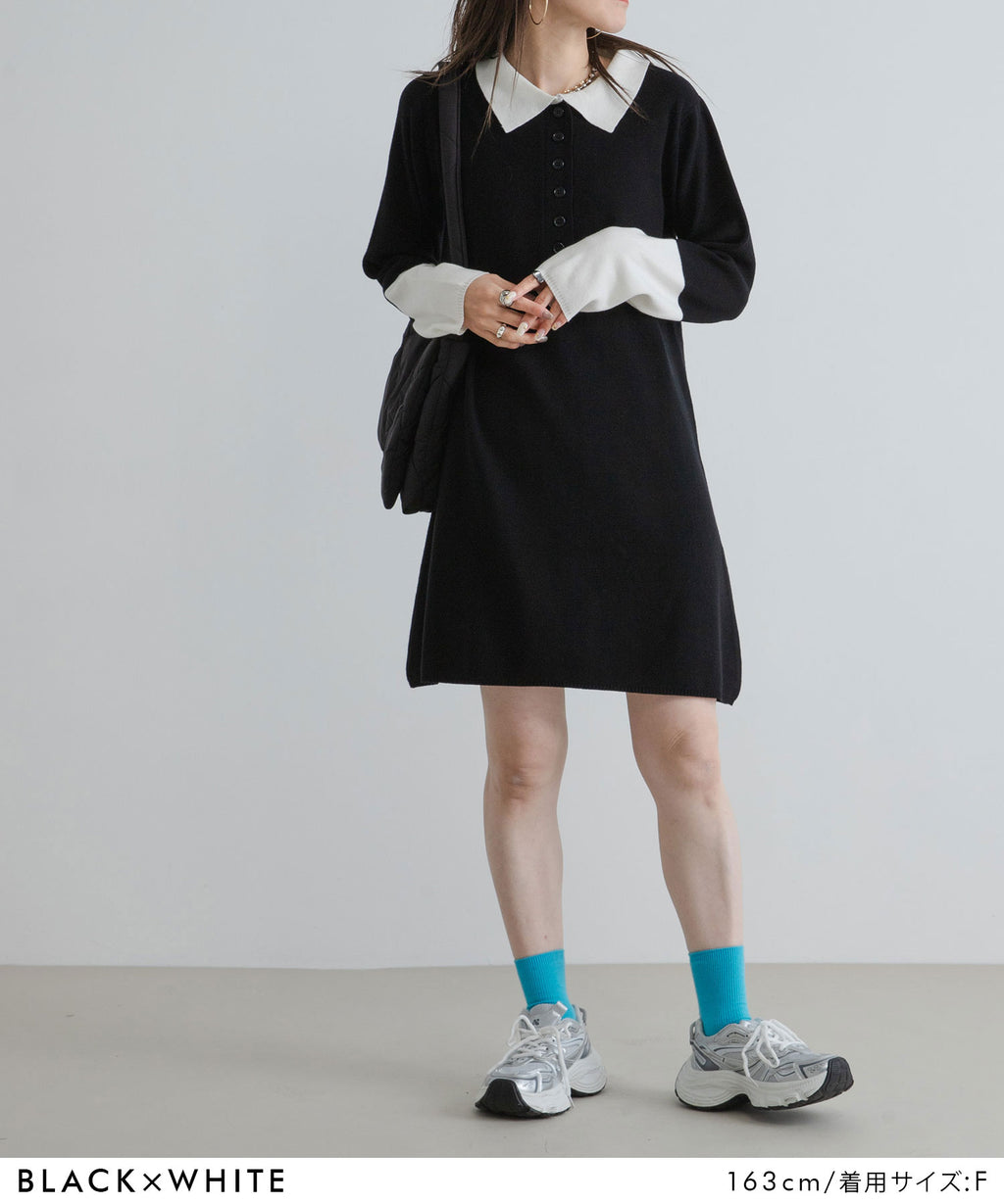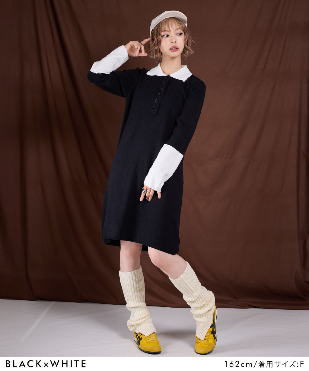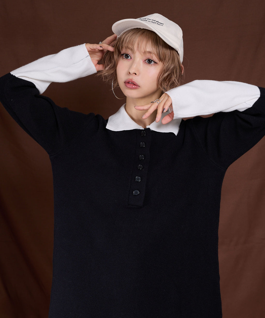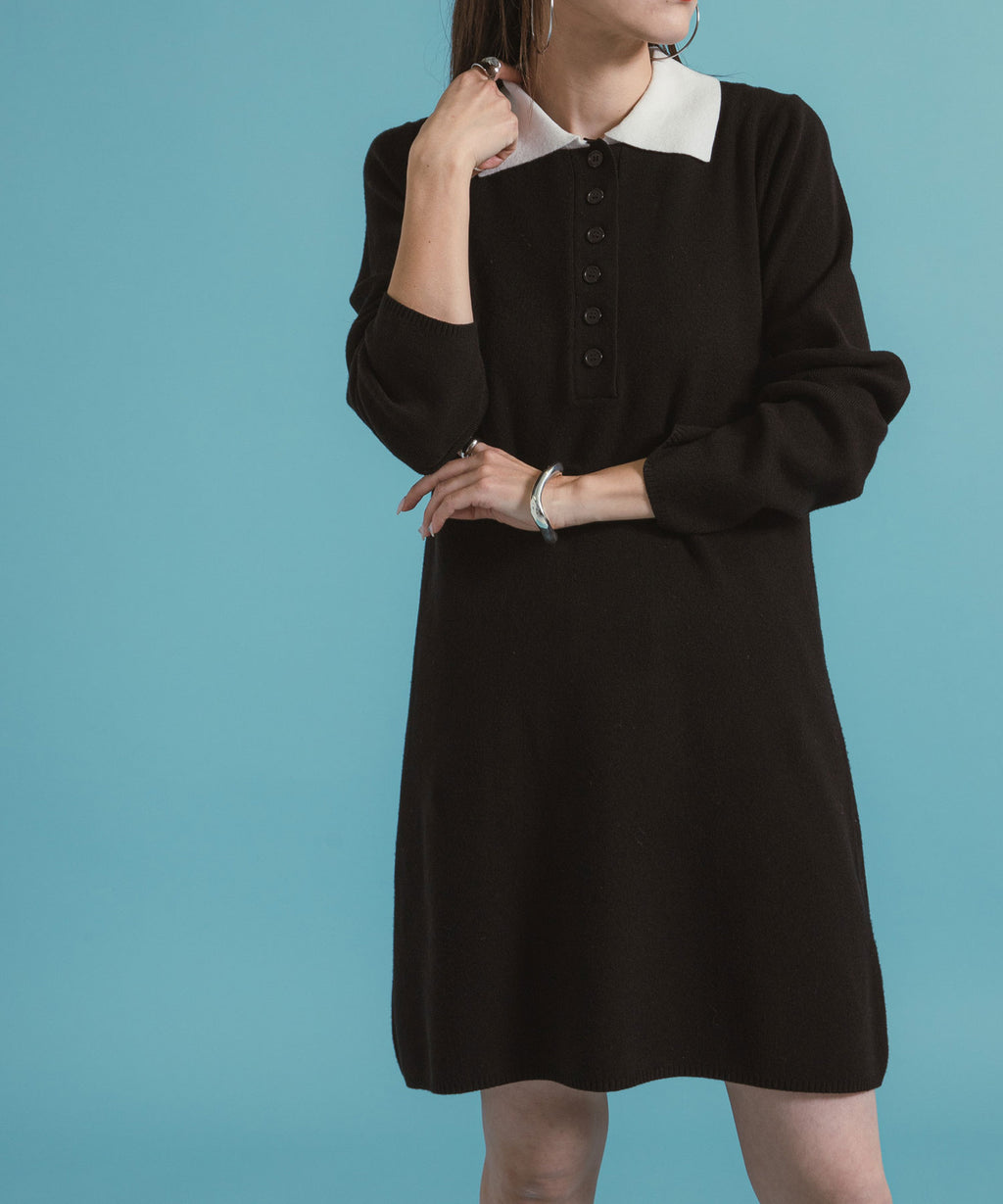 襟の配色や、袖の配色が魅力的なポロニットワンピース。