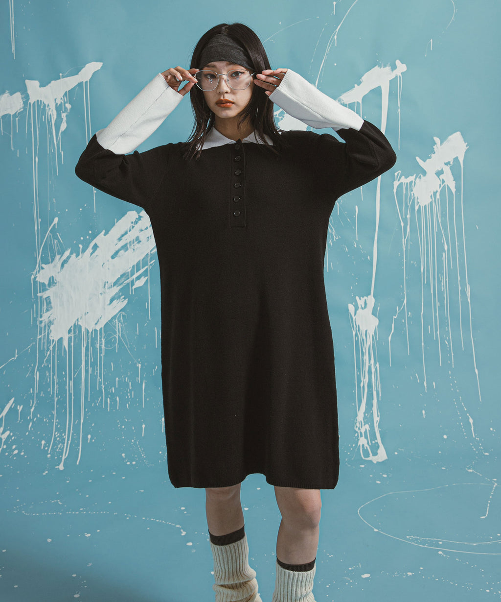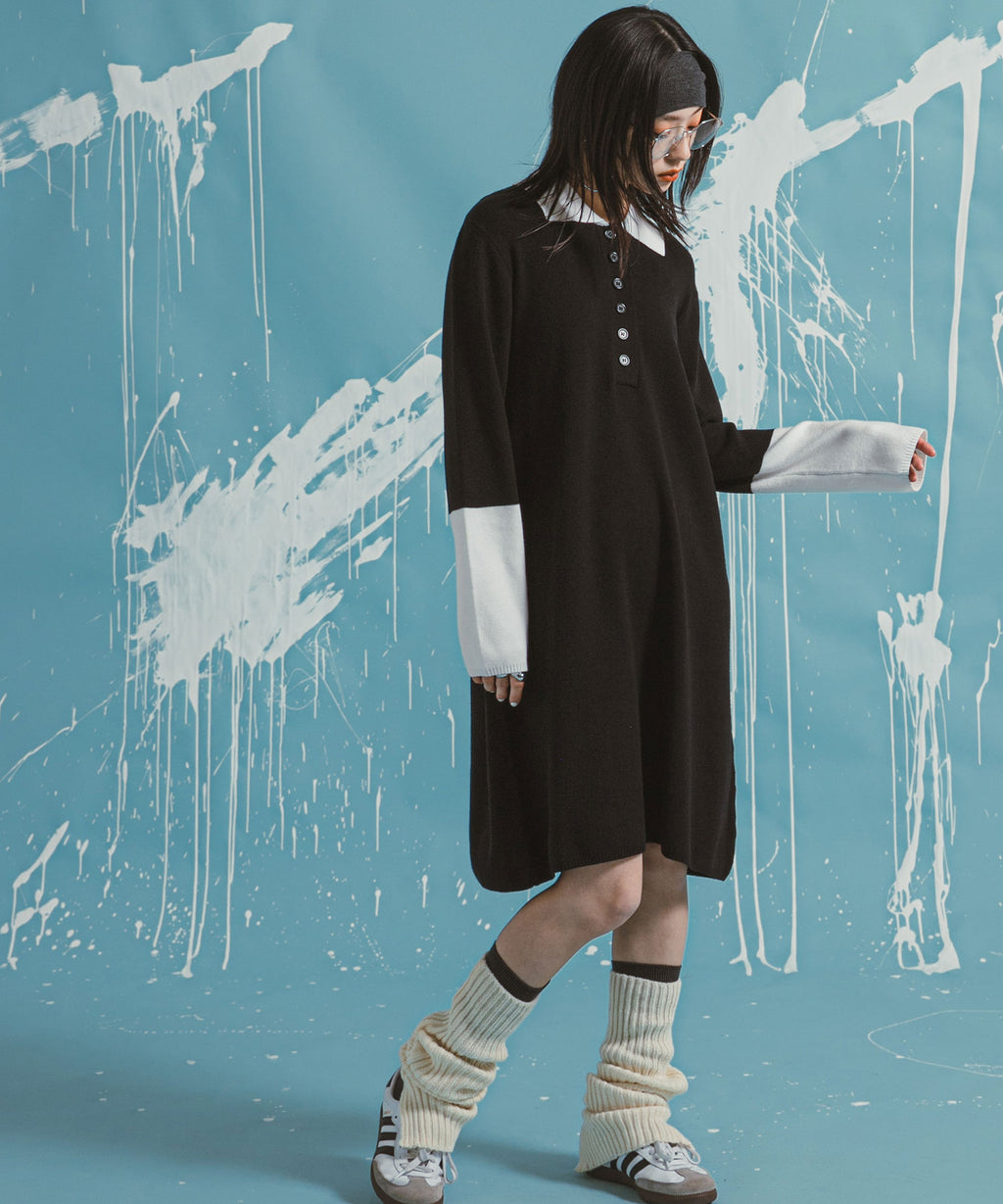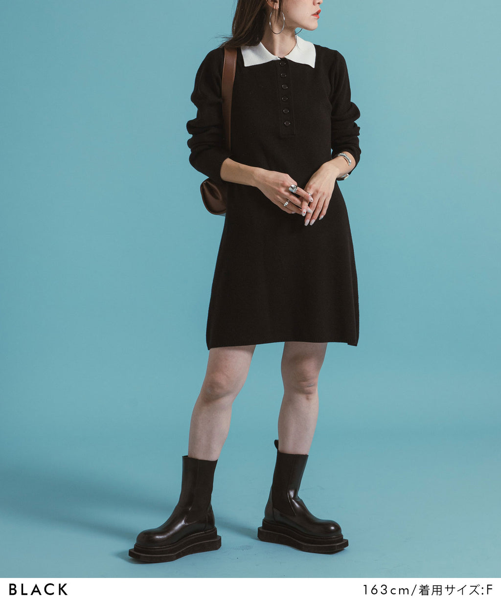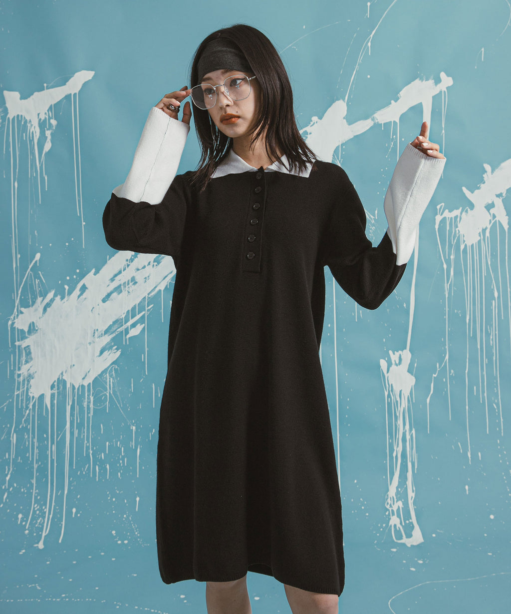 襟の配色や、袖の配色が魅力的なポロニットワンピース。