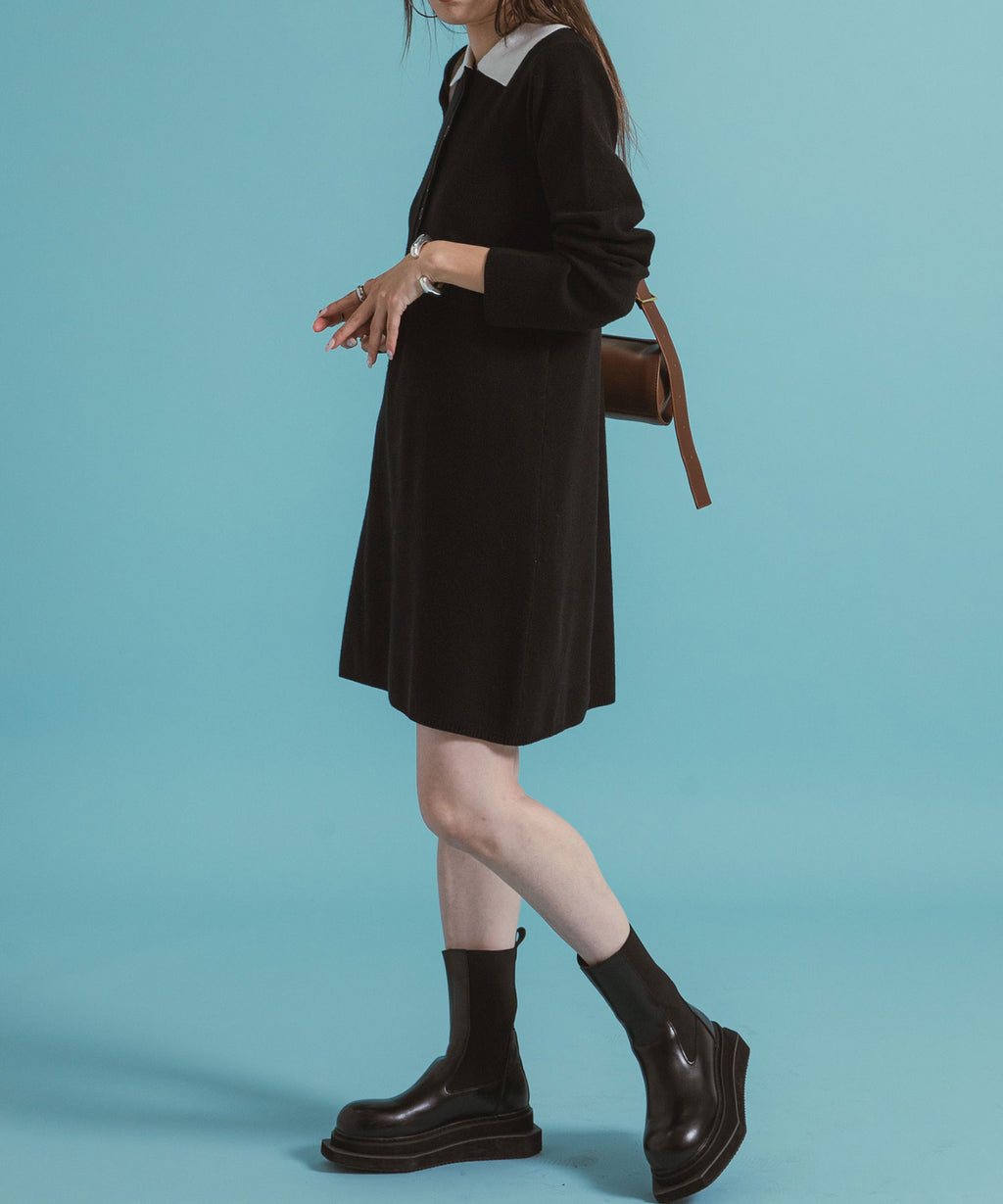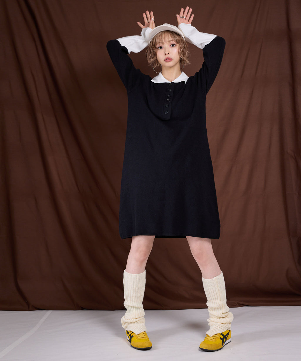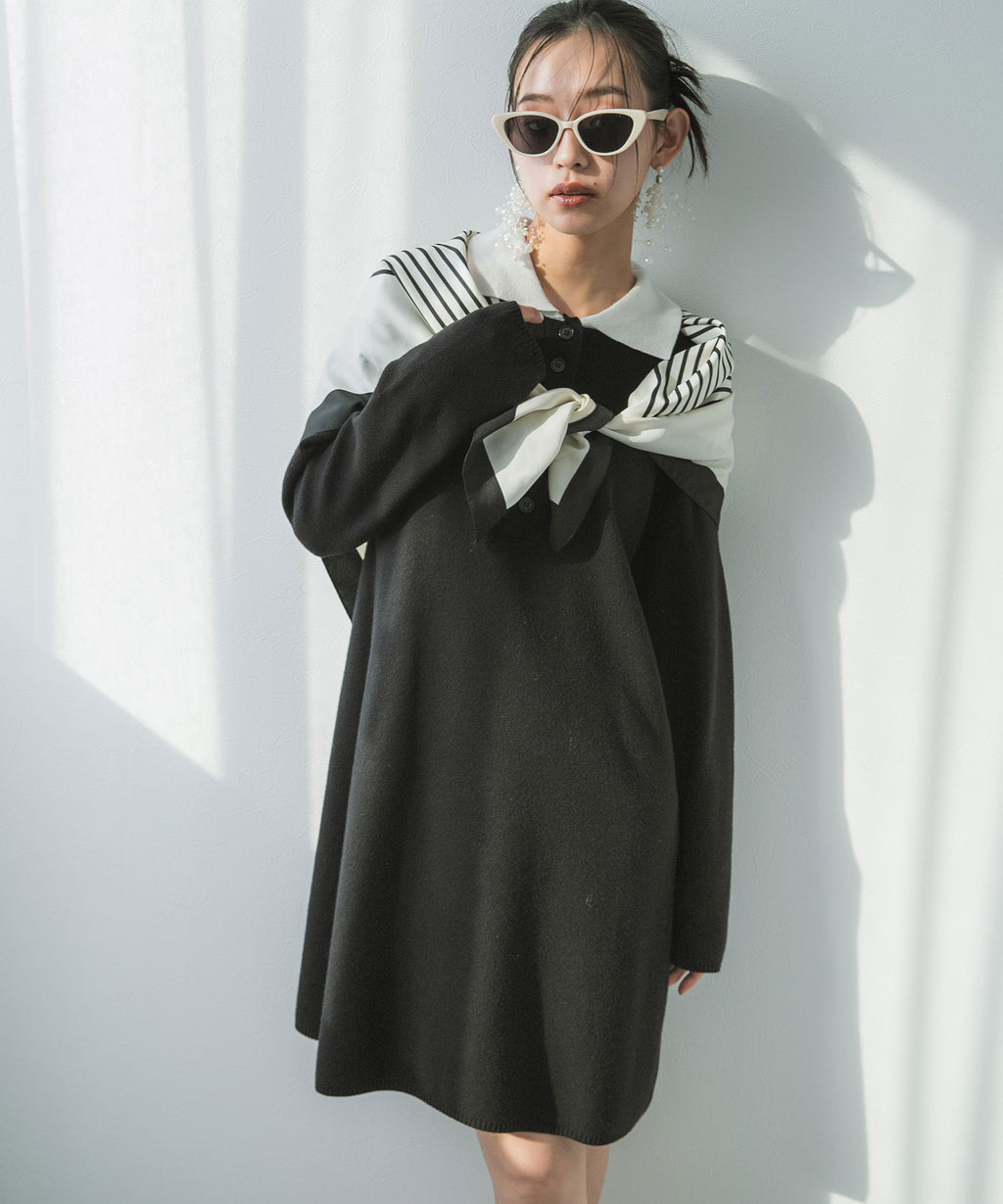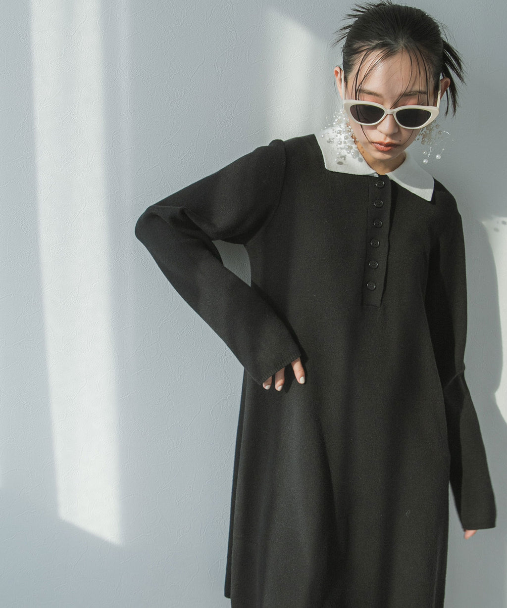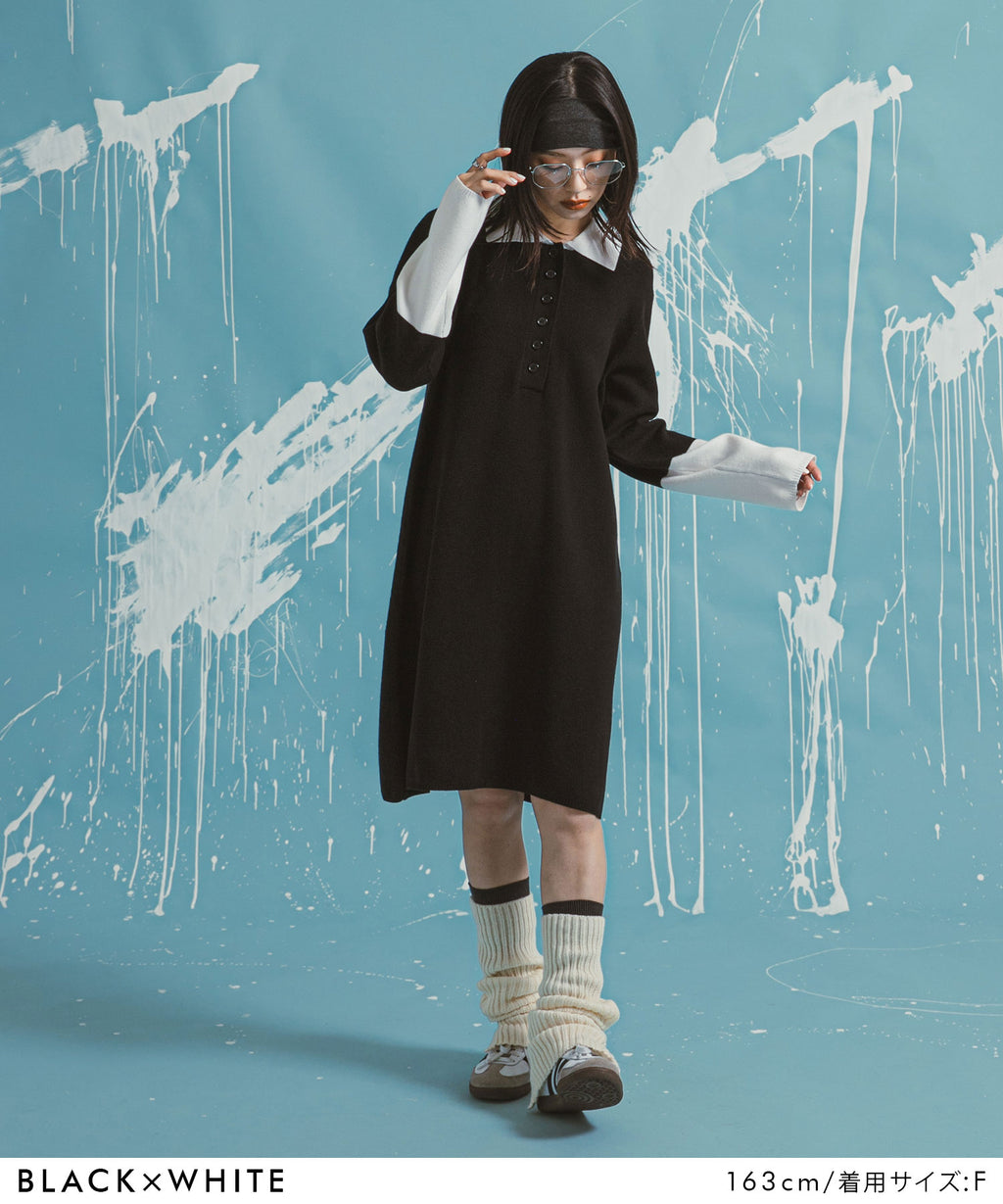 襟の配色や、袖の配色が魅力的なポロニットワンピース。