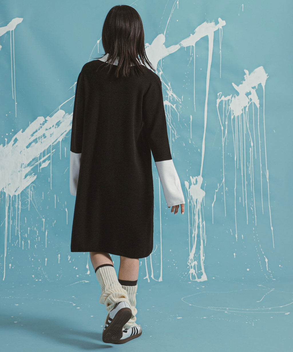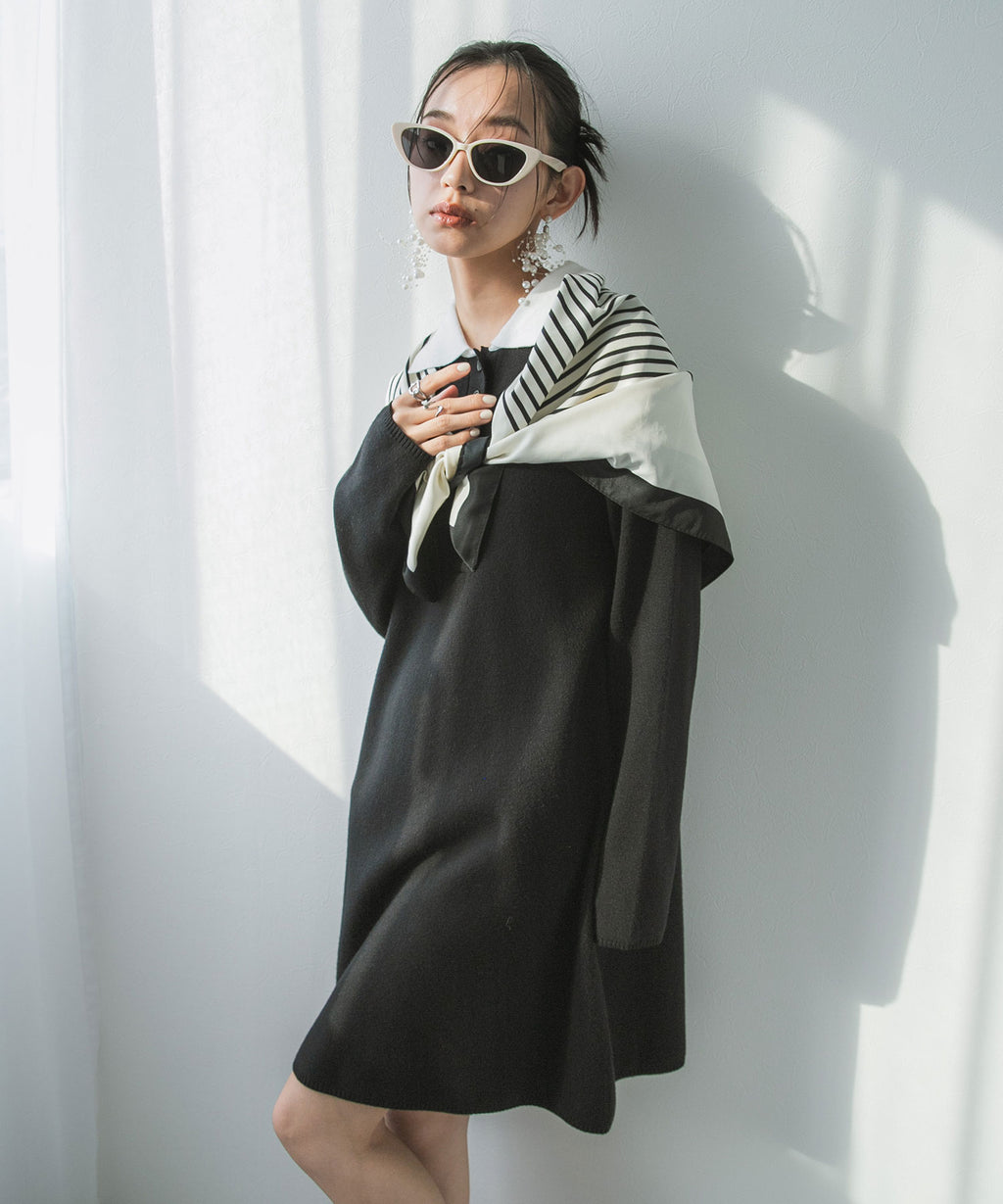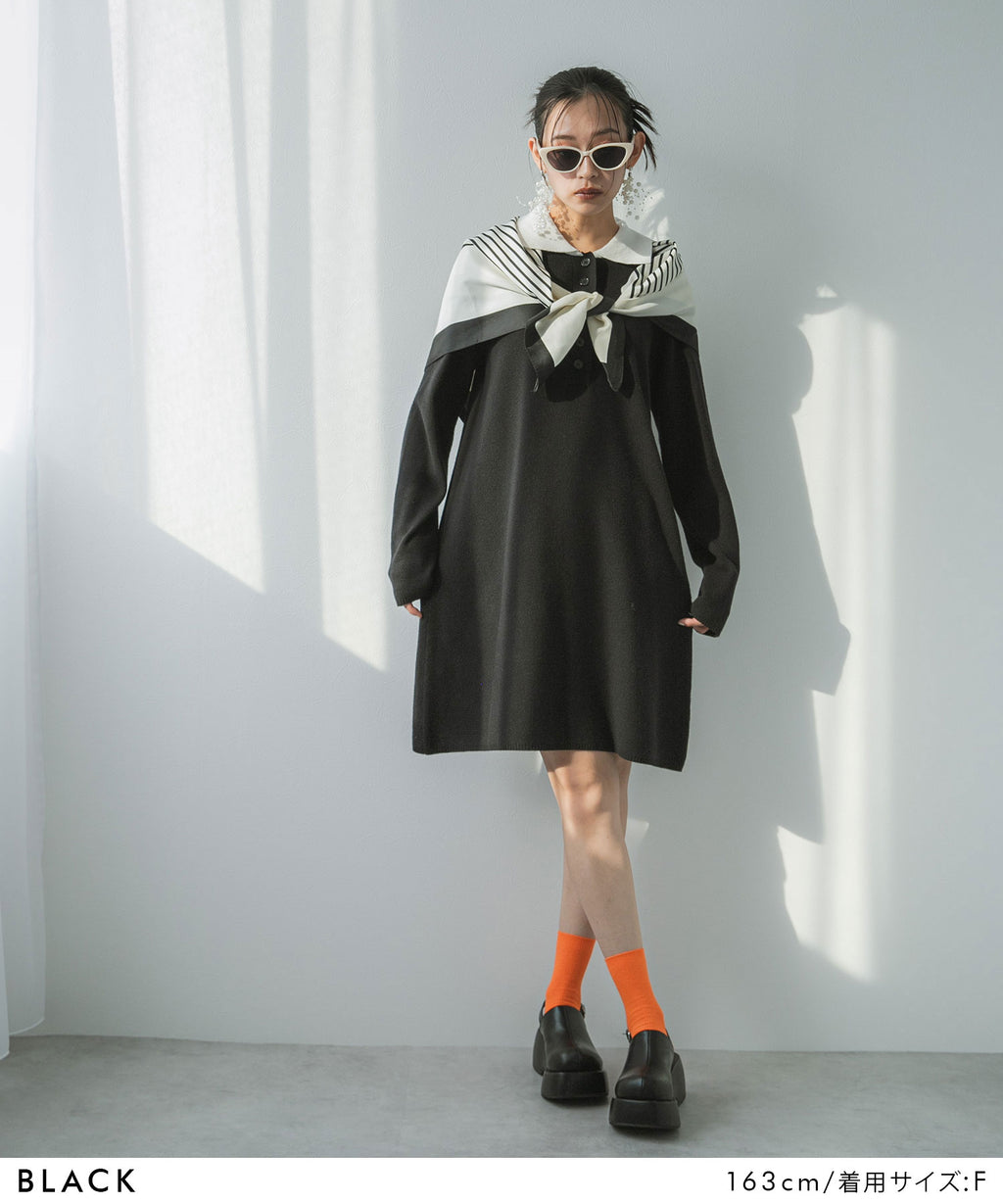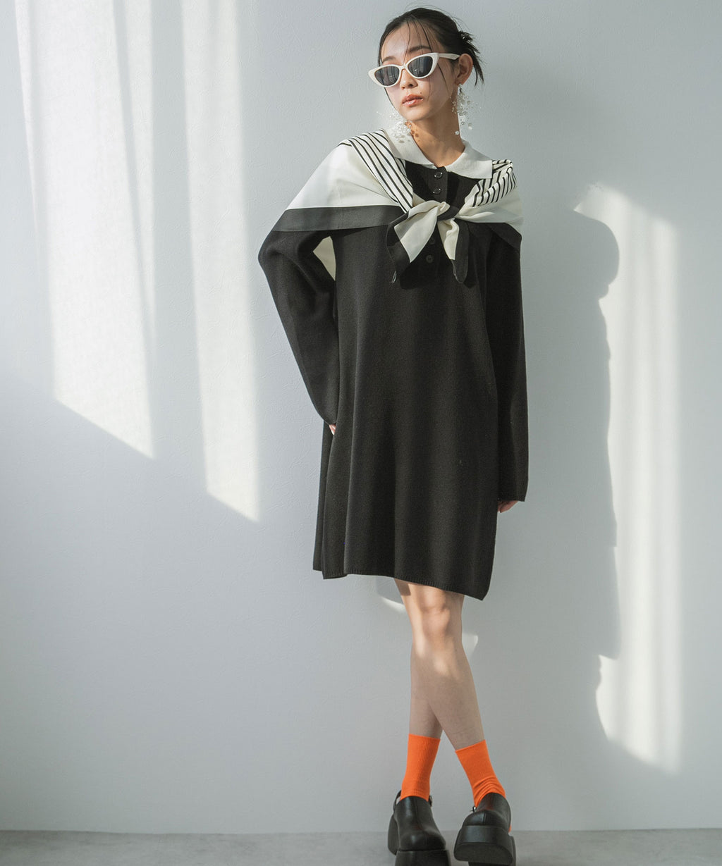 襟の配色や、袖の配色が魅力的なポロニットワンピース。