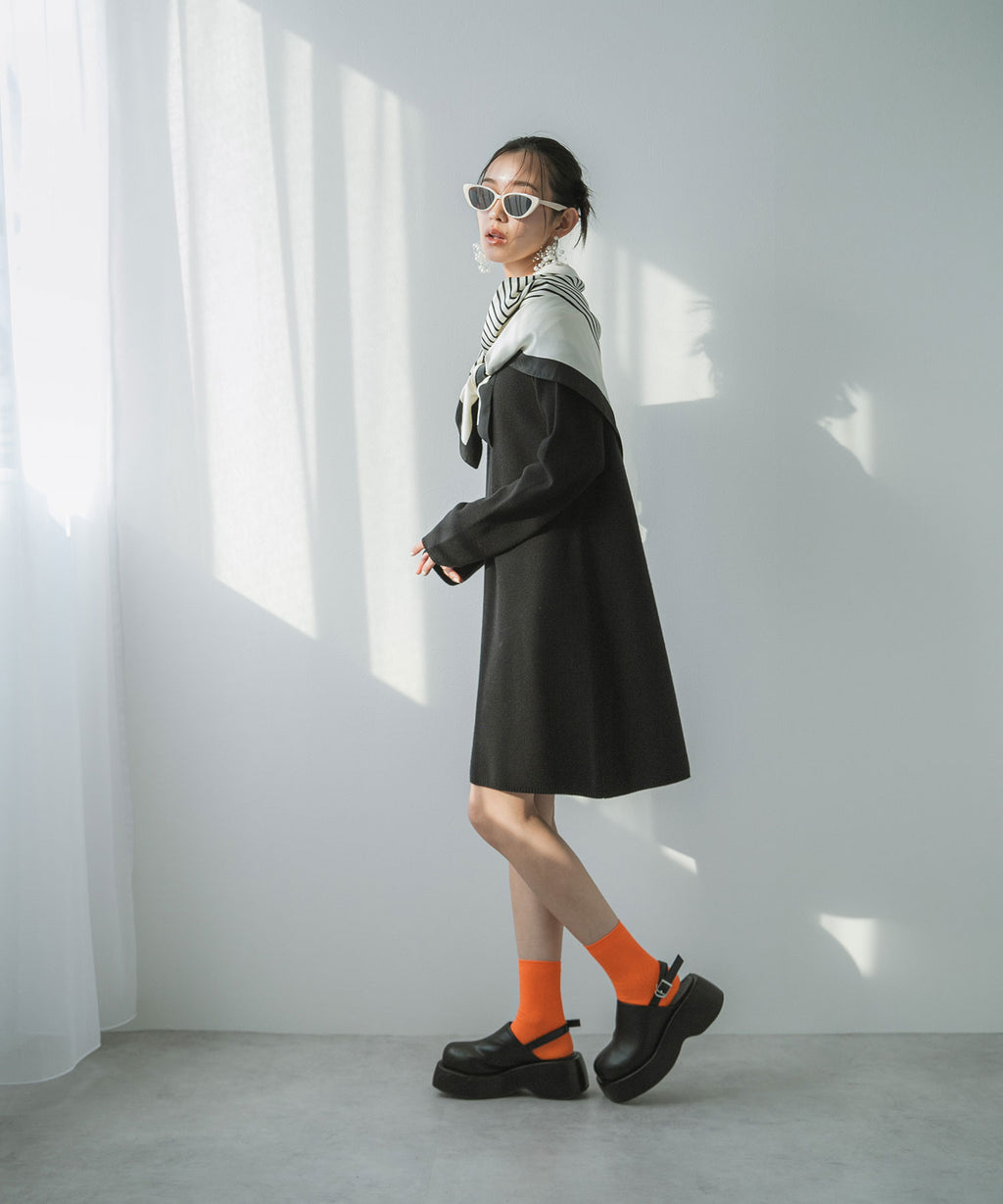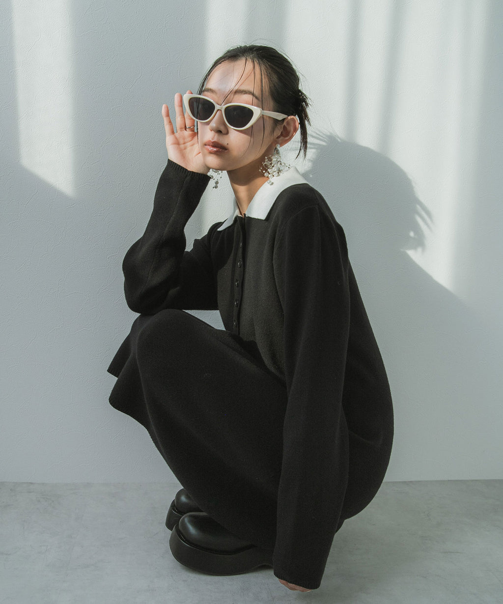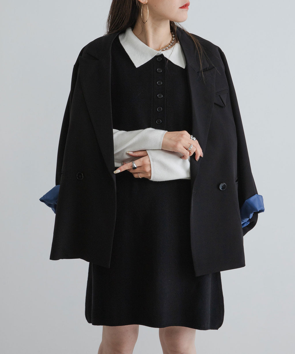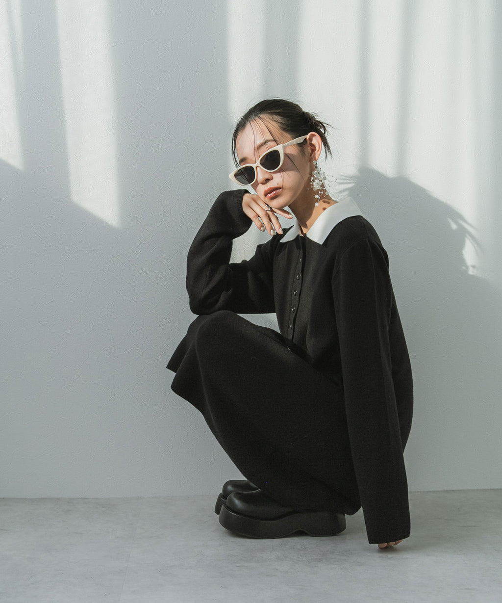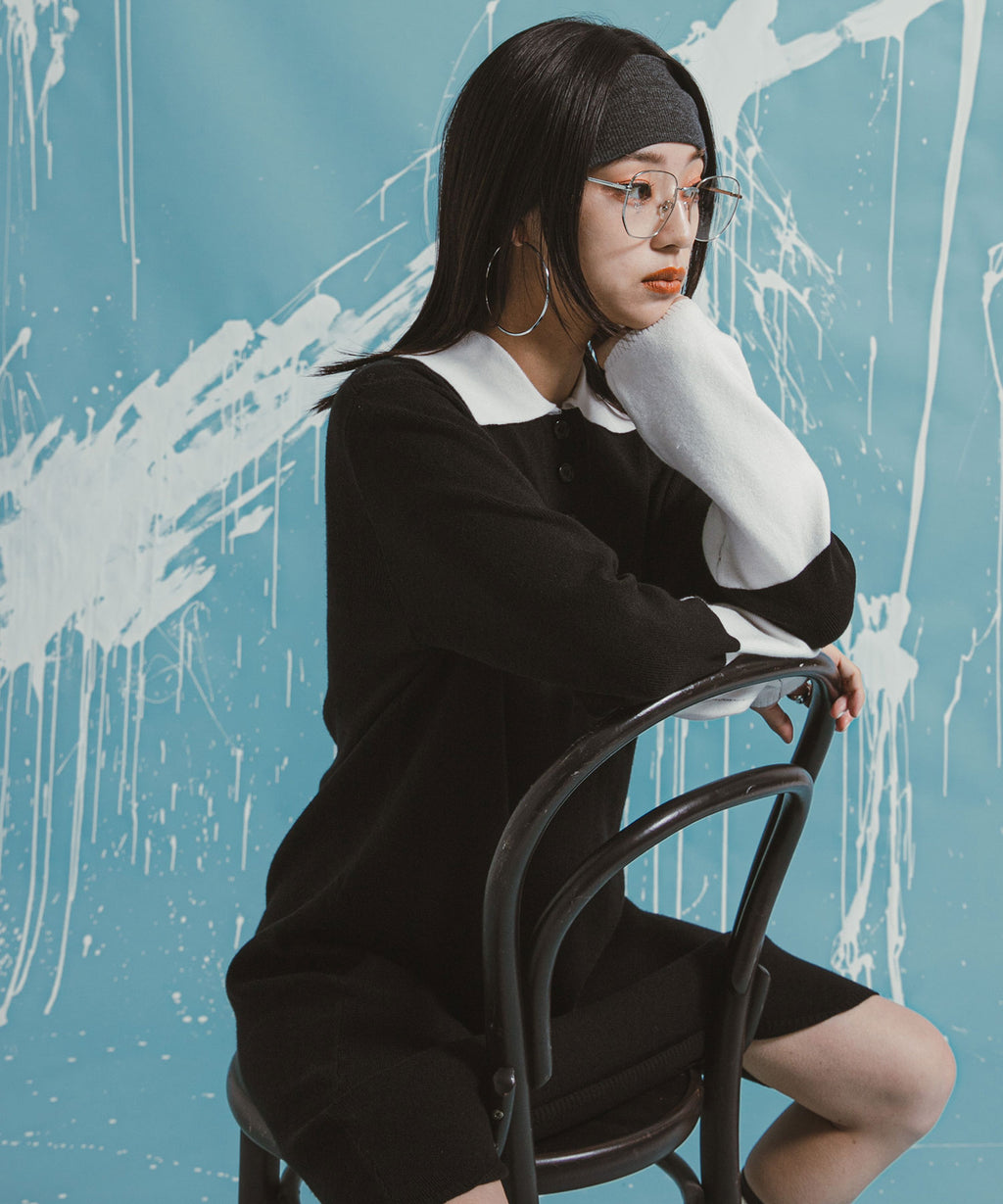 襟の配色や、袖の配色が魅力的なポロニットワンピース。
