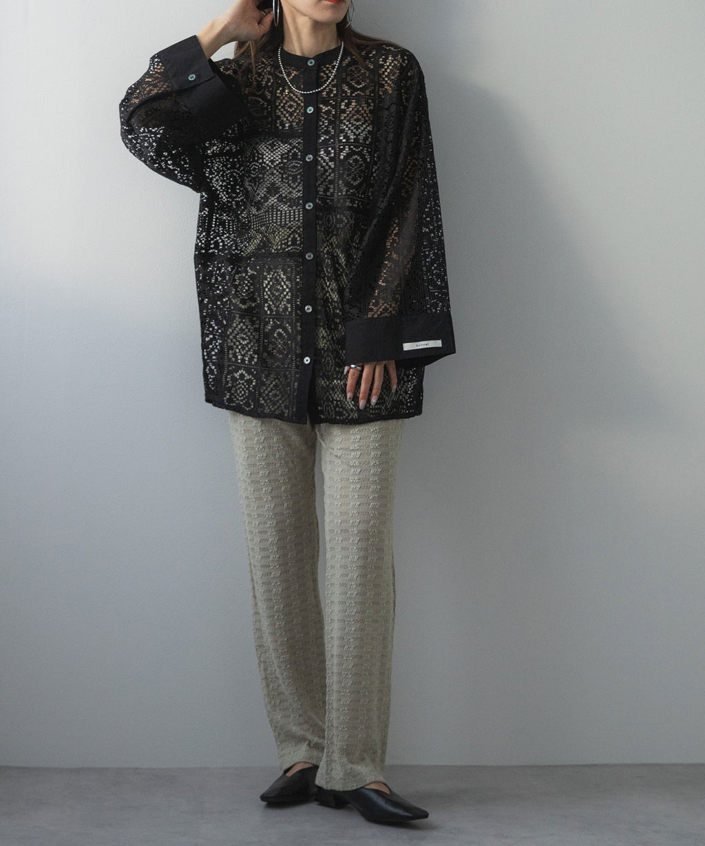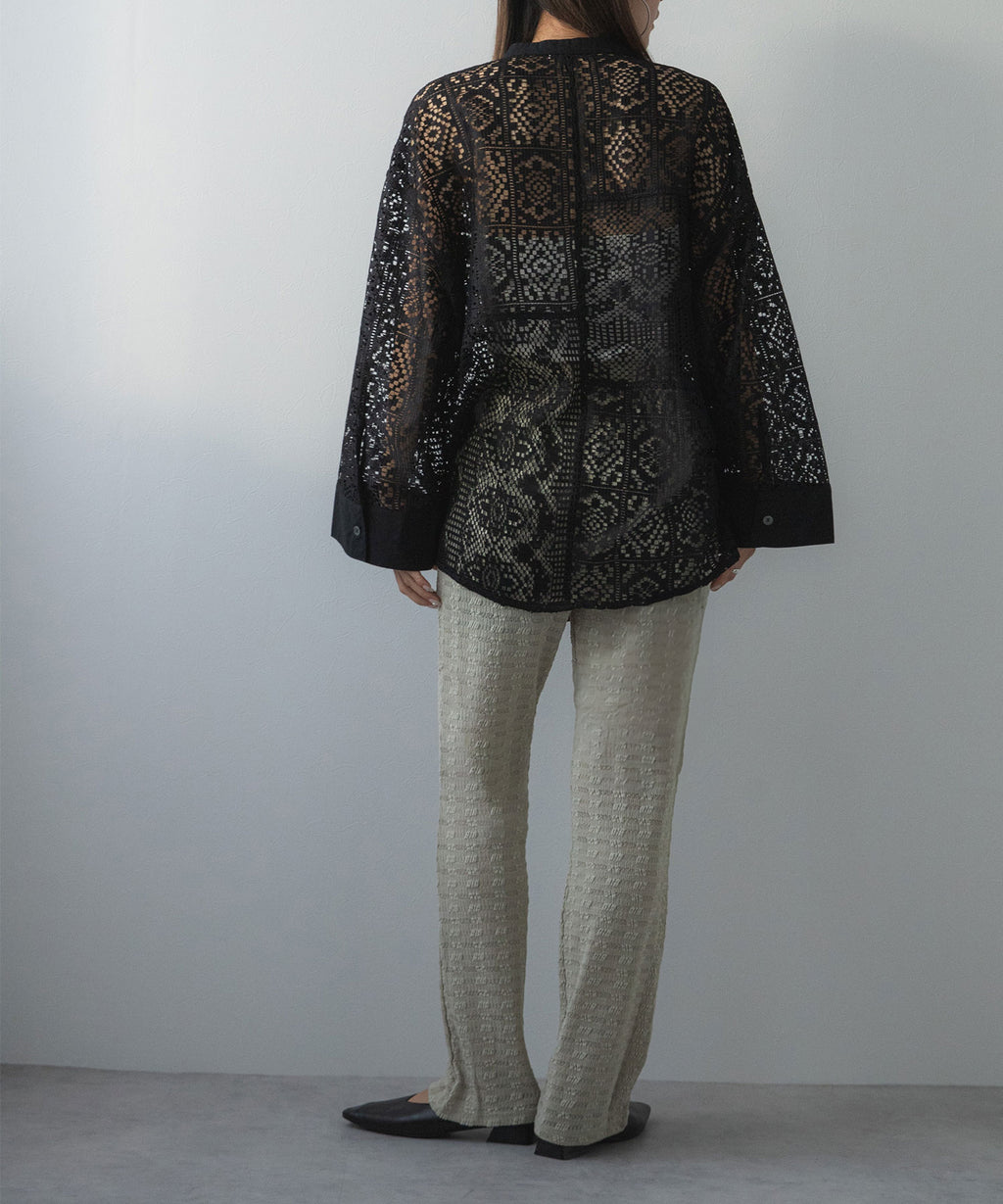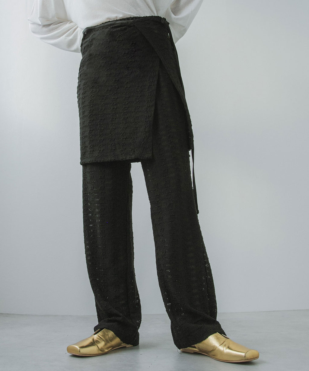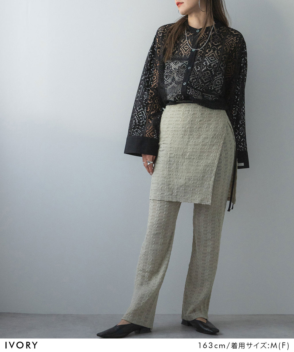 程よいシアー感のあるジャガード生地で仕立てられたパンツは