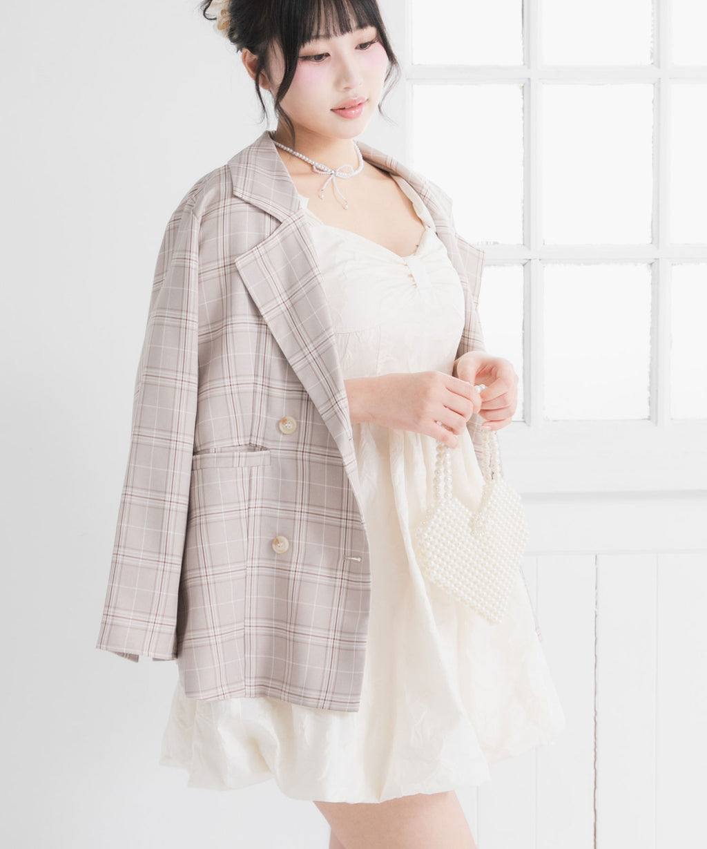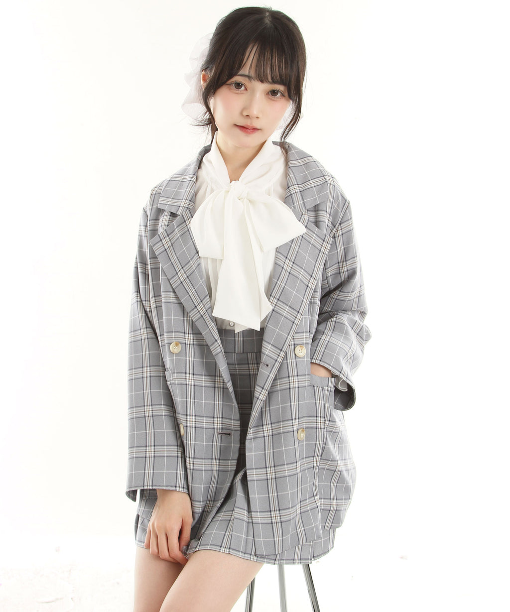 ジャケットは前がダブルボタンになっており、ゆったりとしたオーバーサイズ感がゆるっとしていて可愛いデザイン。