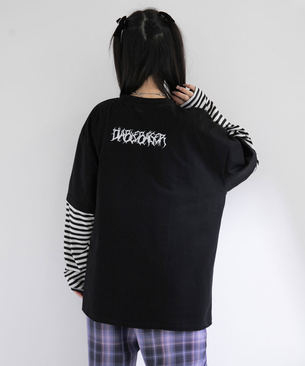 【地雷系ロゴゆるT×ボーダー長袖レイヤード風カットソー、