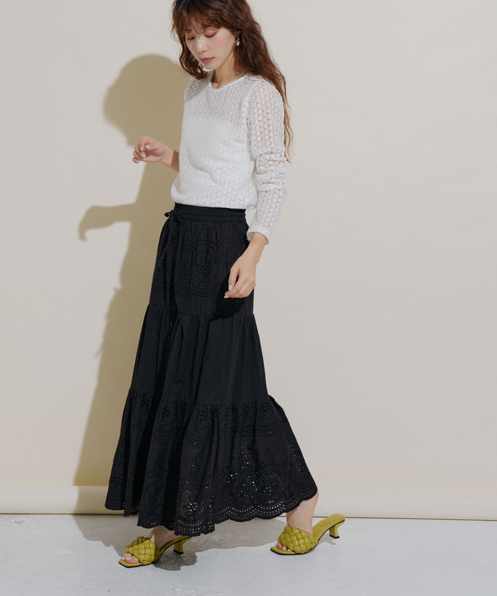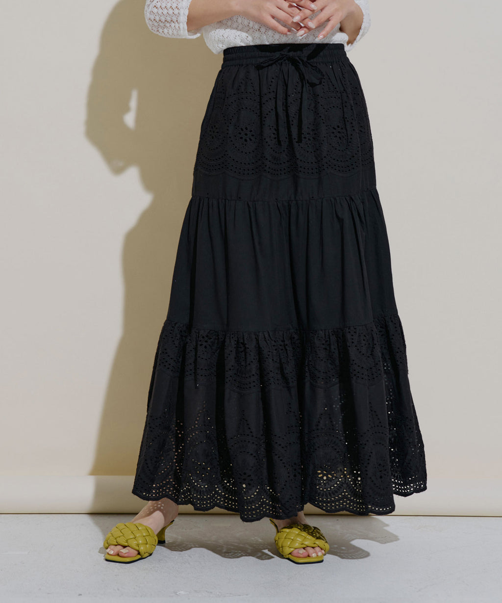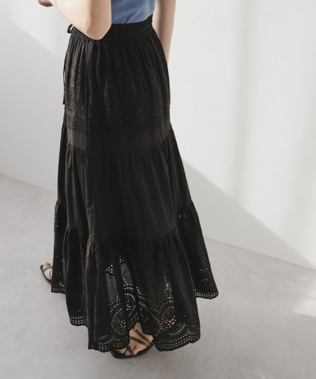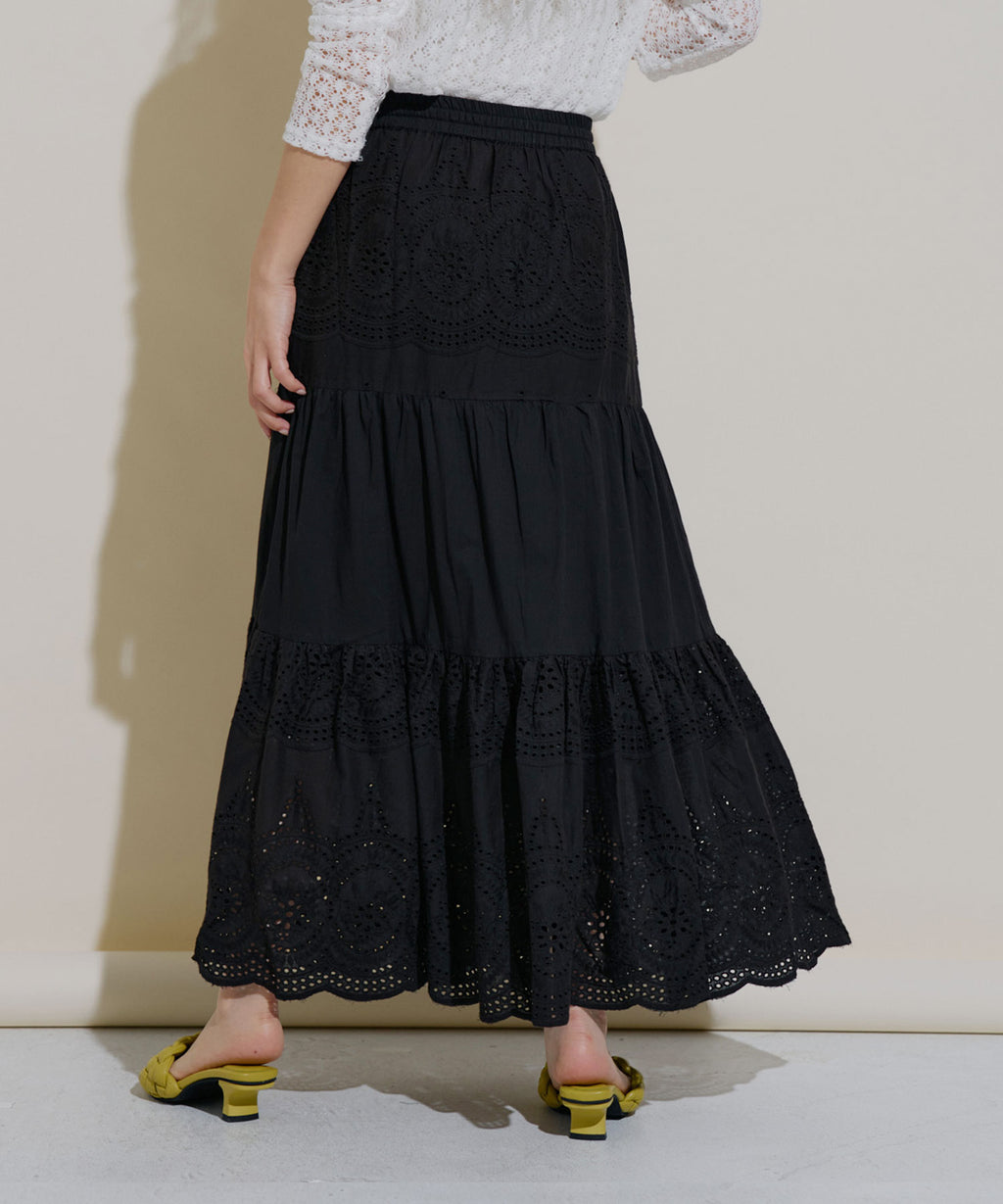 上品なシフリー刺繍と、たっぷりギャザーを施したティアードデザインが魅力のロングスカート。