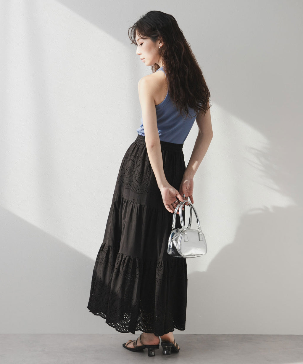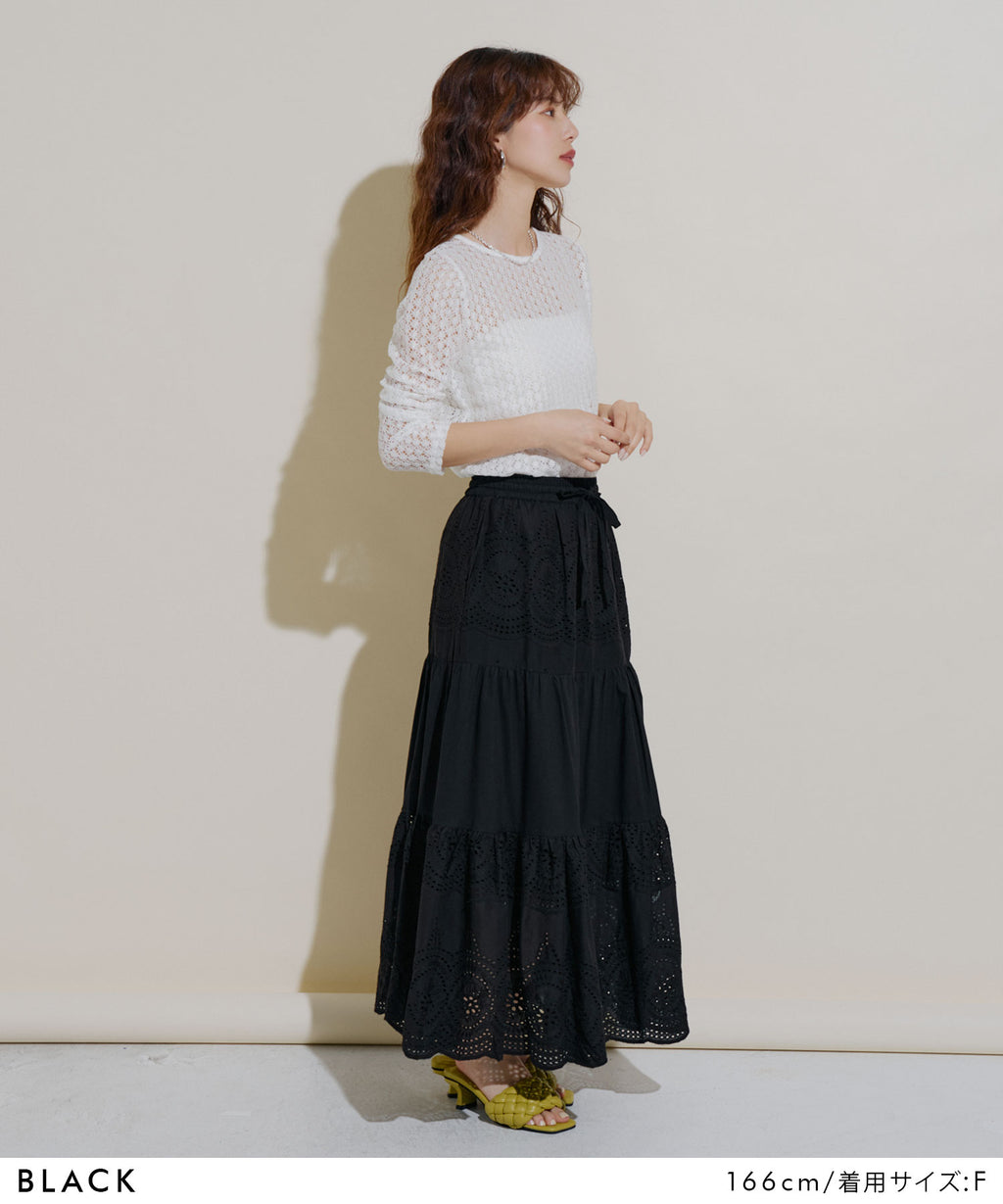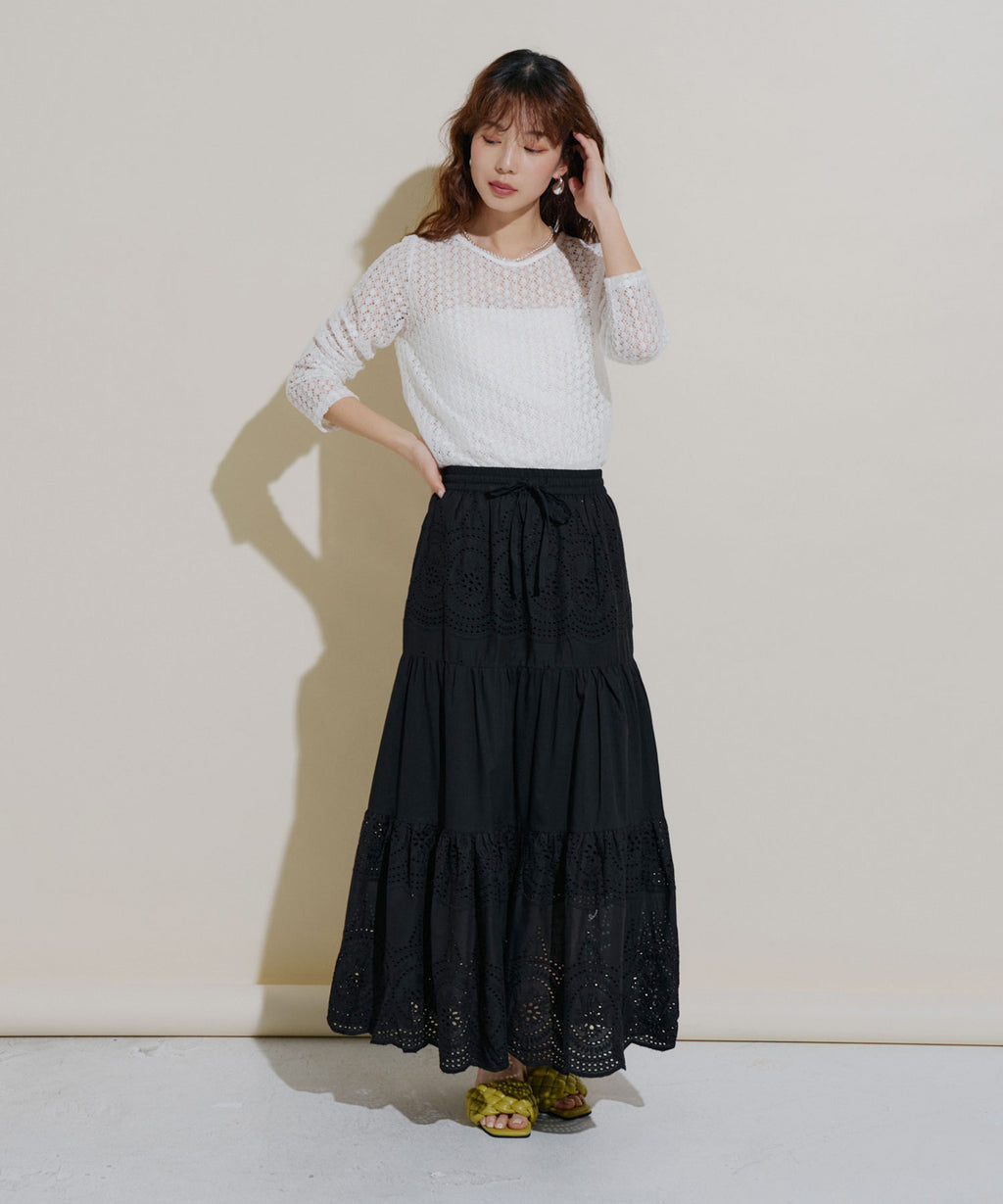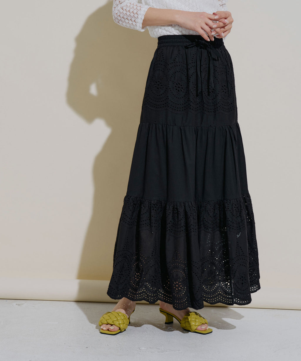上品なシフリー刺繍と、たっぷりギャザーを施したティアードデザインが魅力のロングスカート。