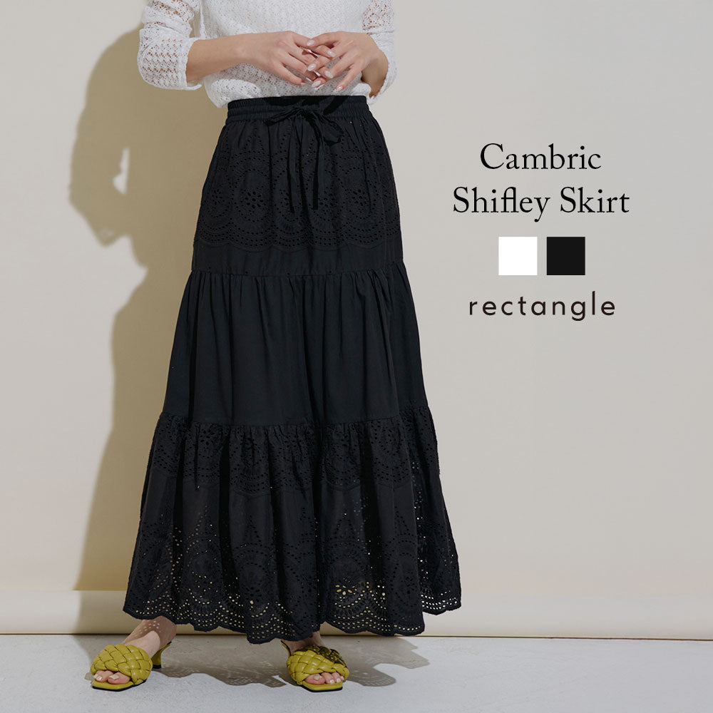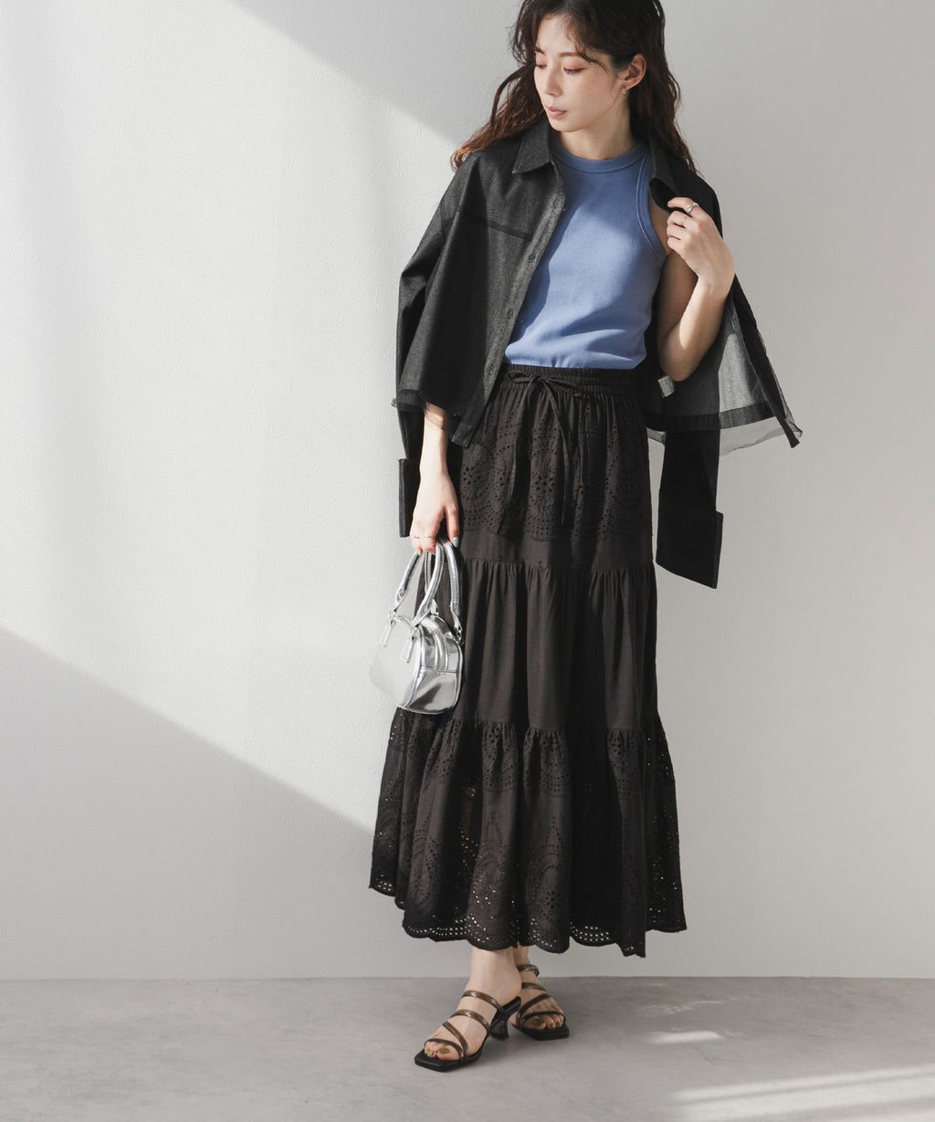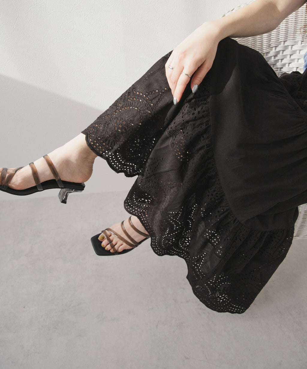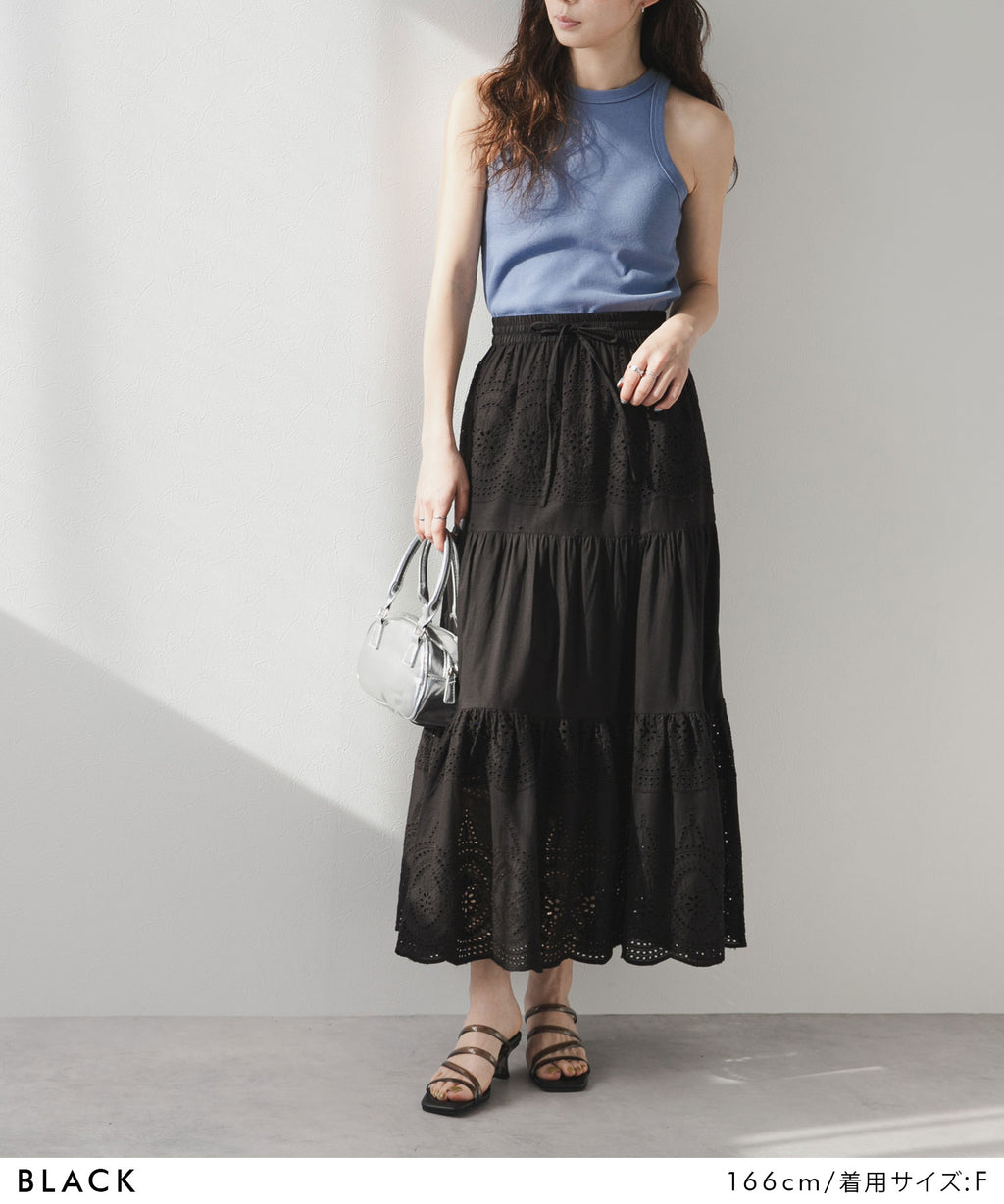 上品なシフリー刺繍と、たっぷりギャザーを施したティアードデザインが魅力のロングスカート。