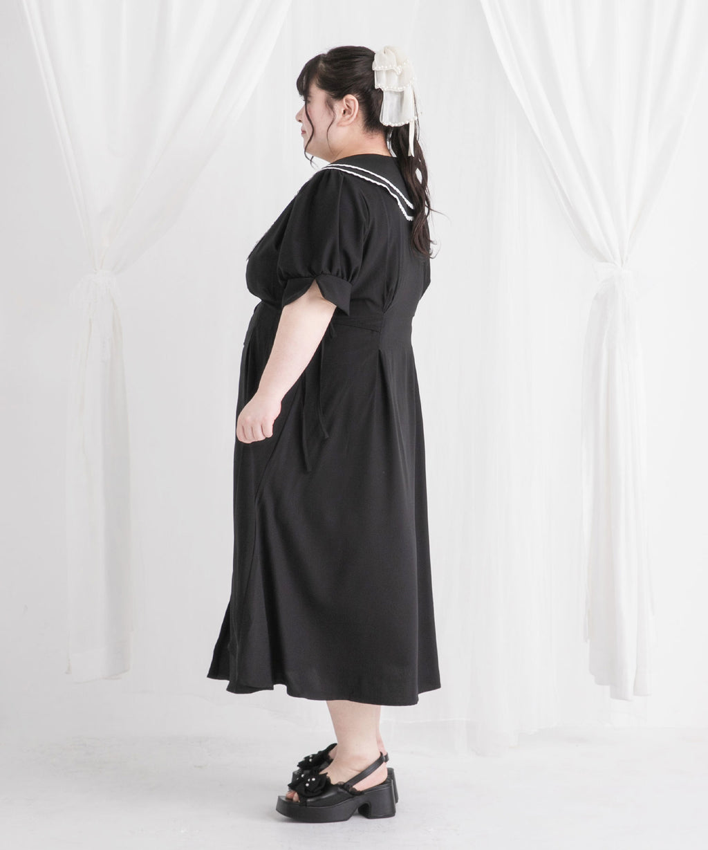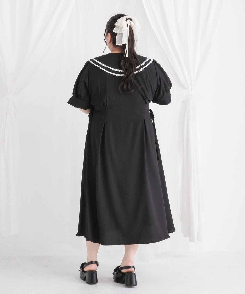 襟の縁にあしらったスカラップレースは、クラシカルなムードを演出します。