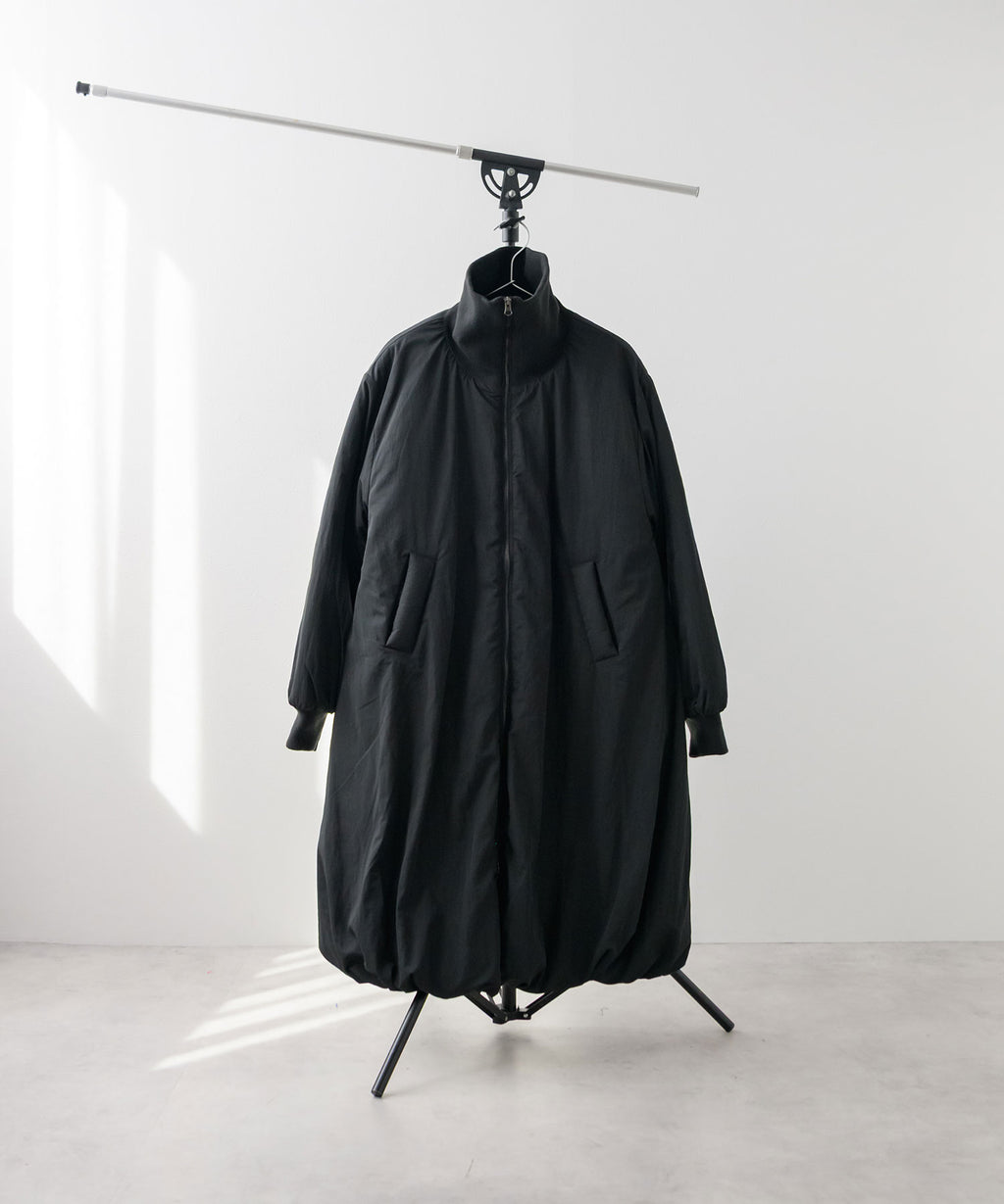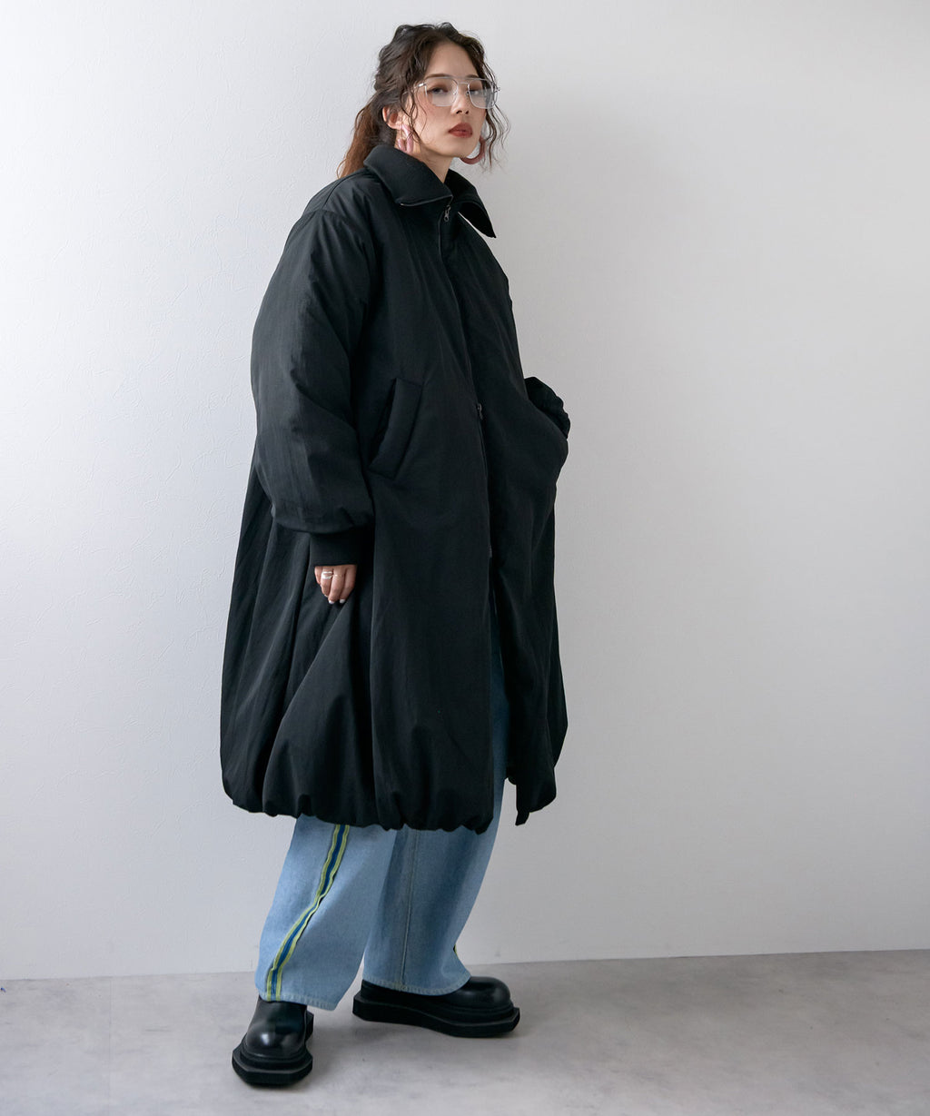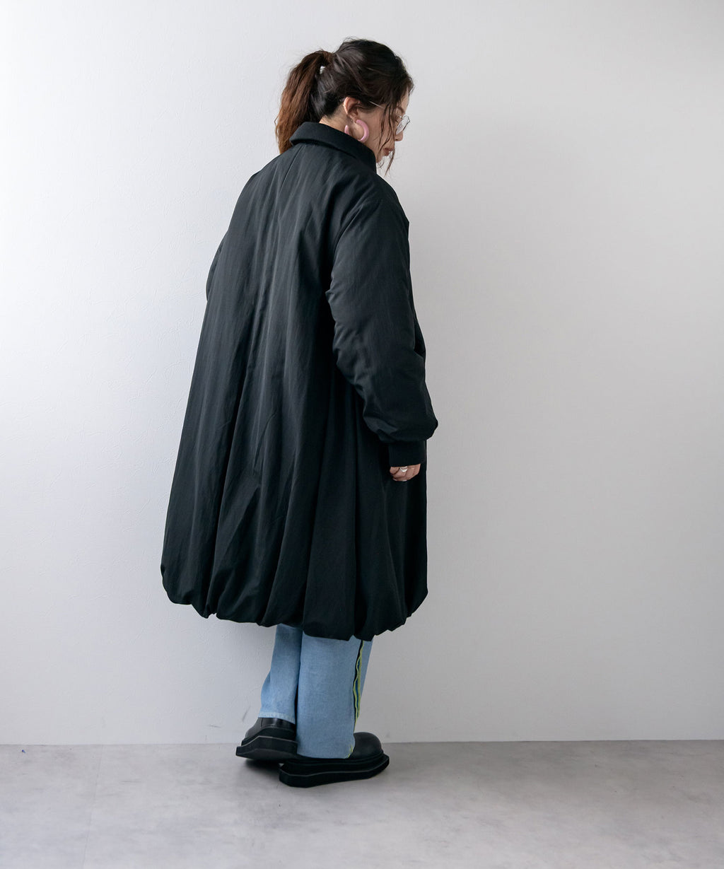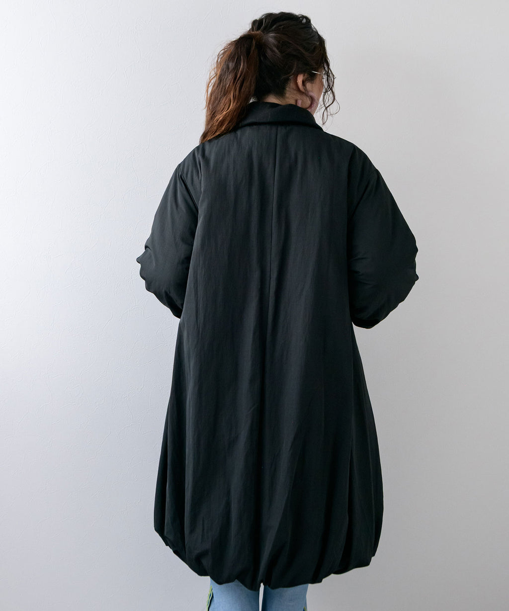 丸みを帯びたバルーンシルエットが、シンプルながら印象的な存在感を放つロングコート。
