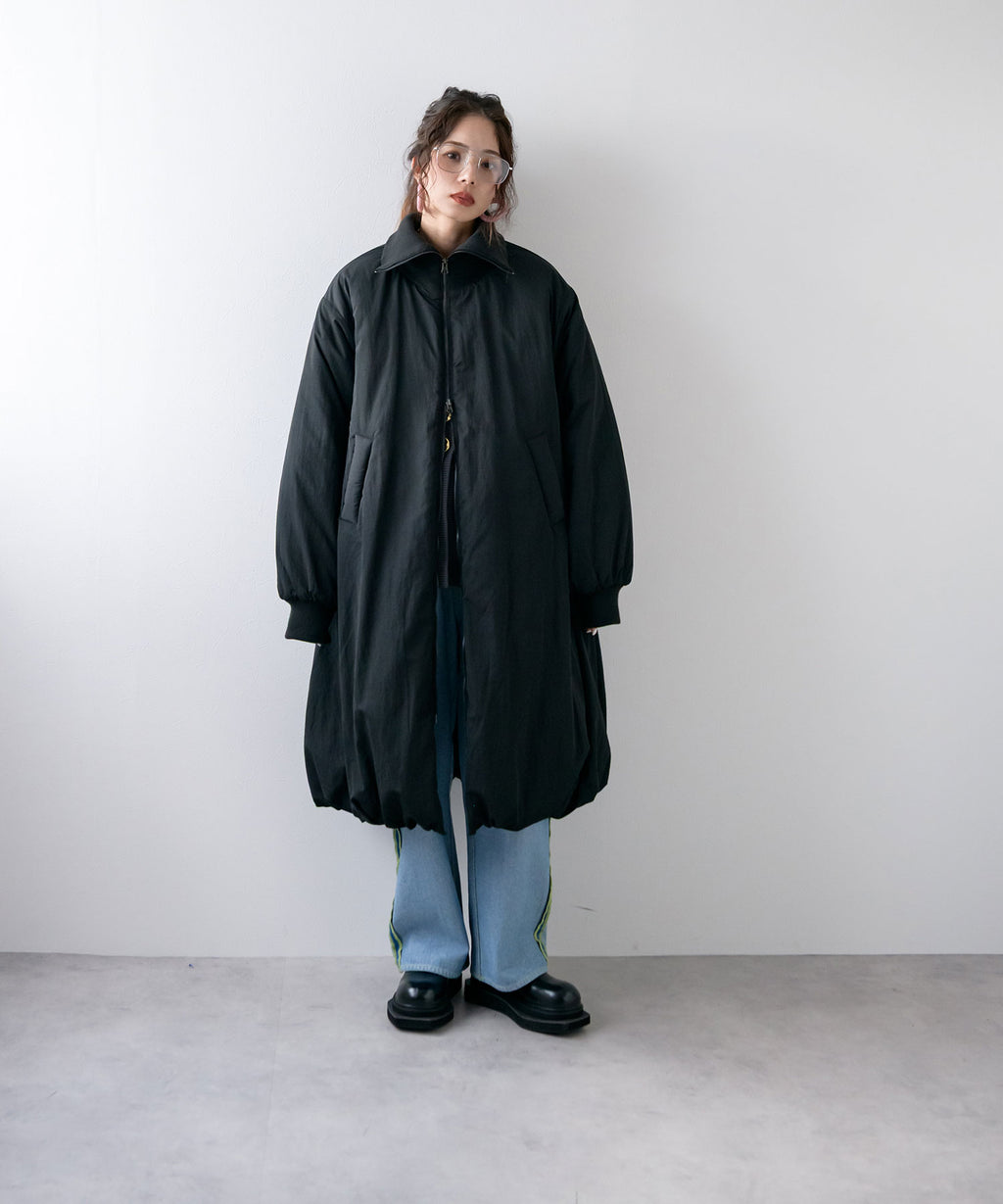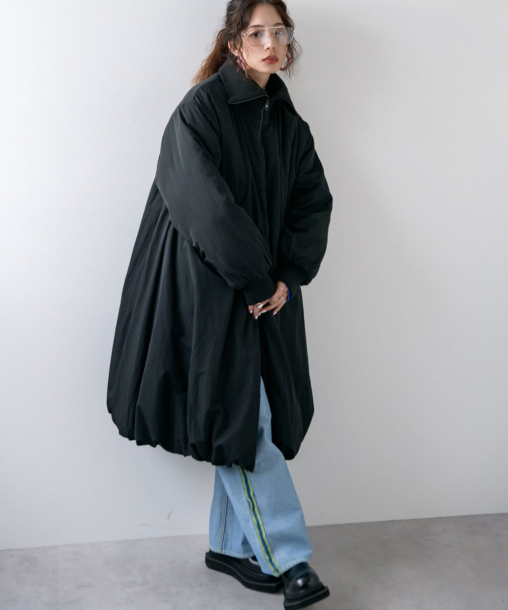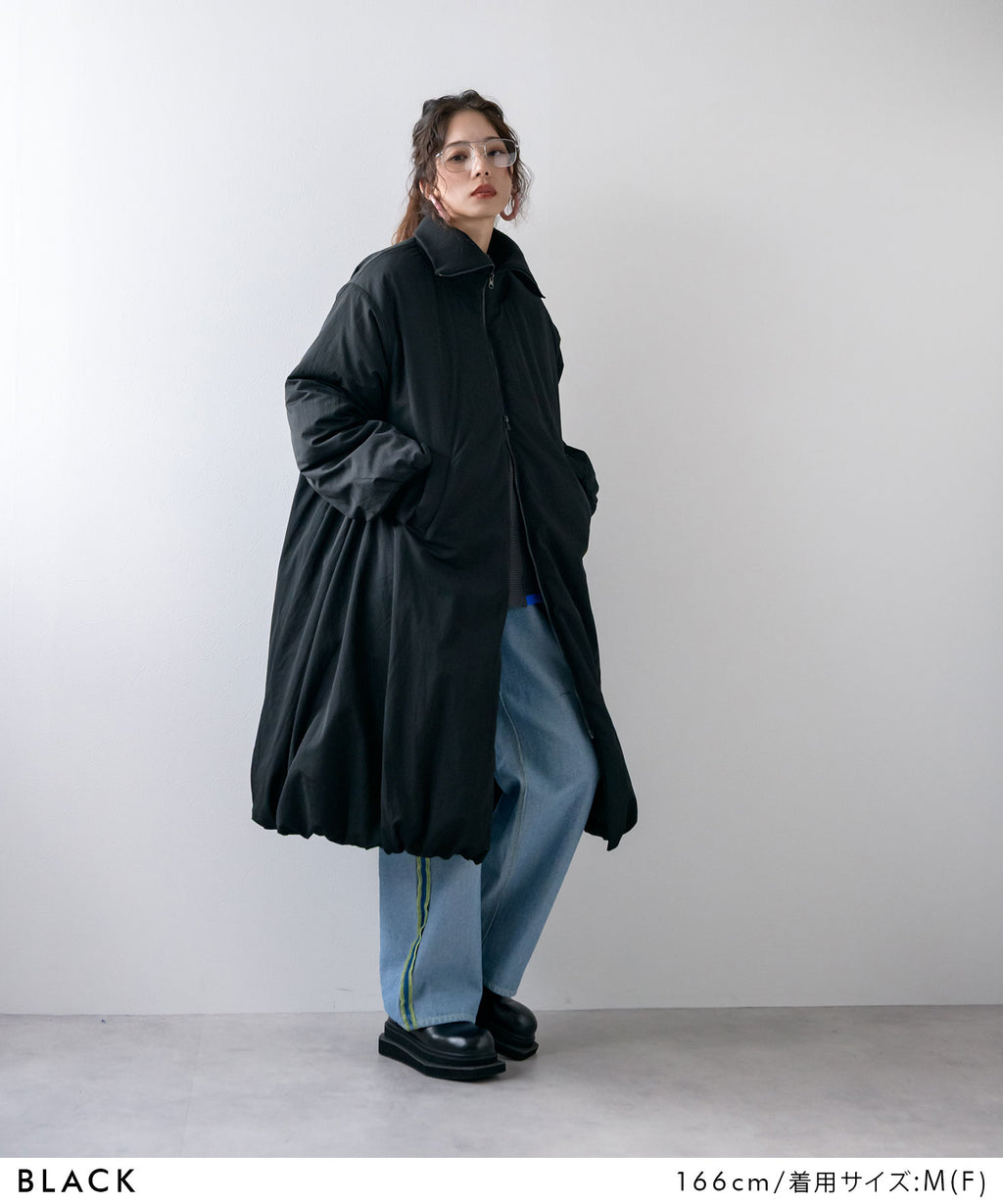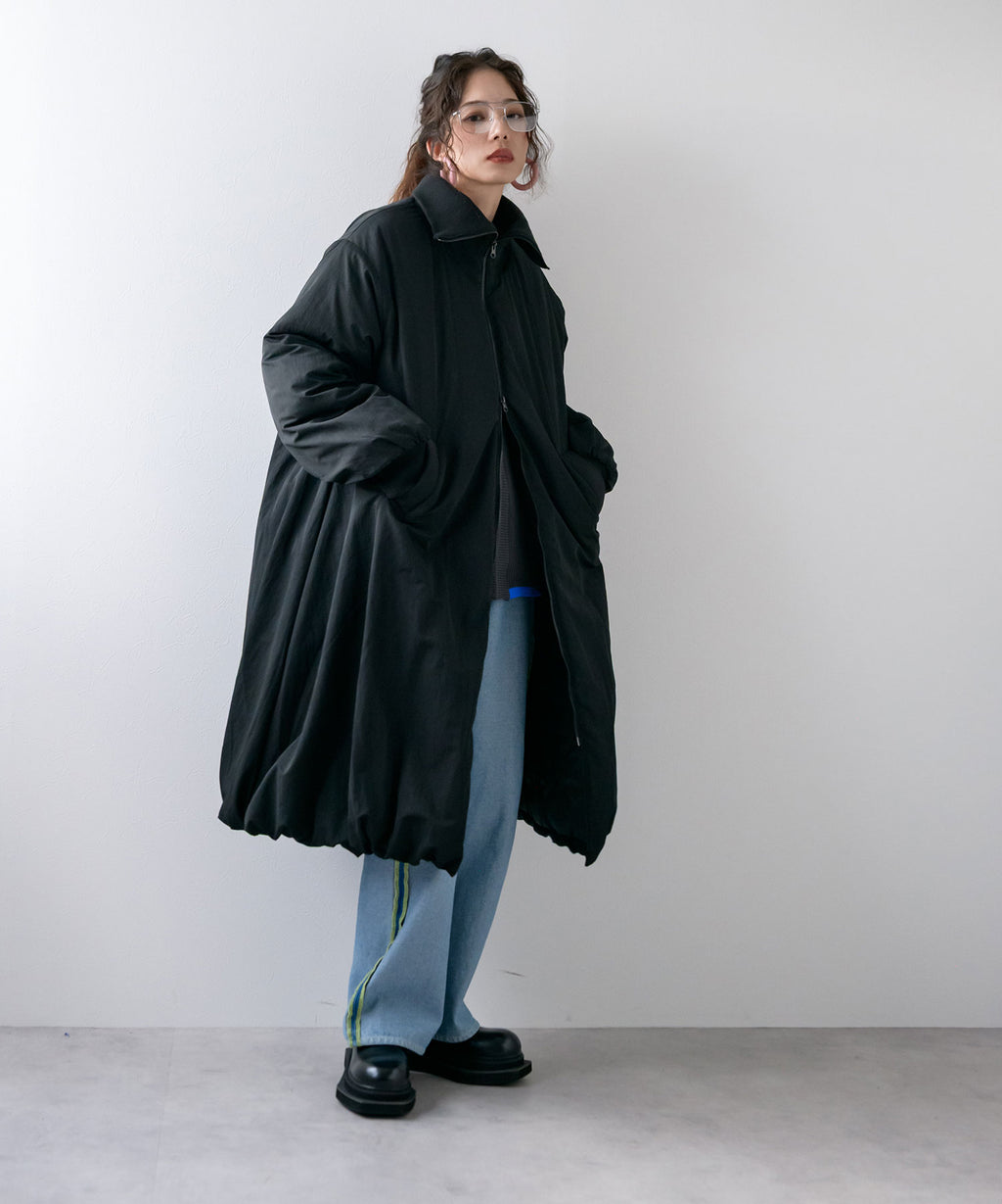 丸みを帯びたバルーンシルエットが、シンプルながら印象的な存在感を放つロングコート。
