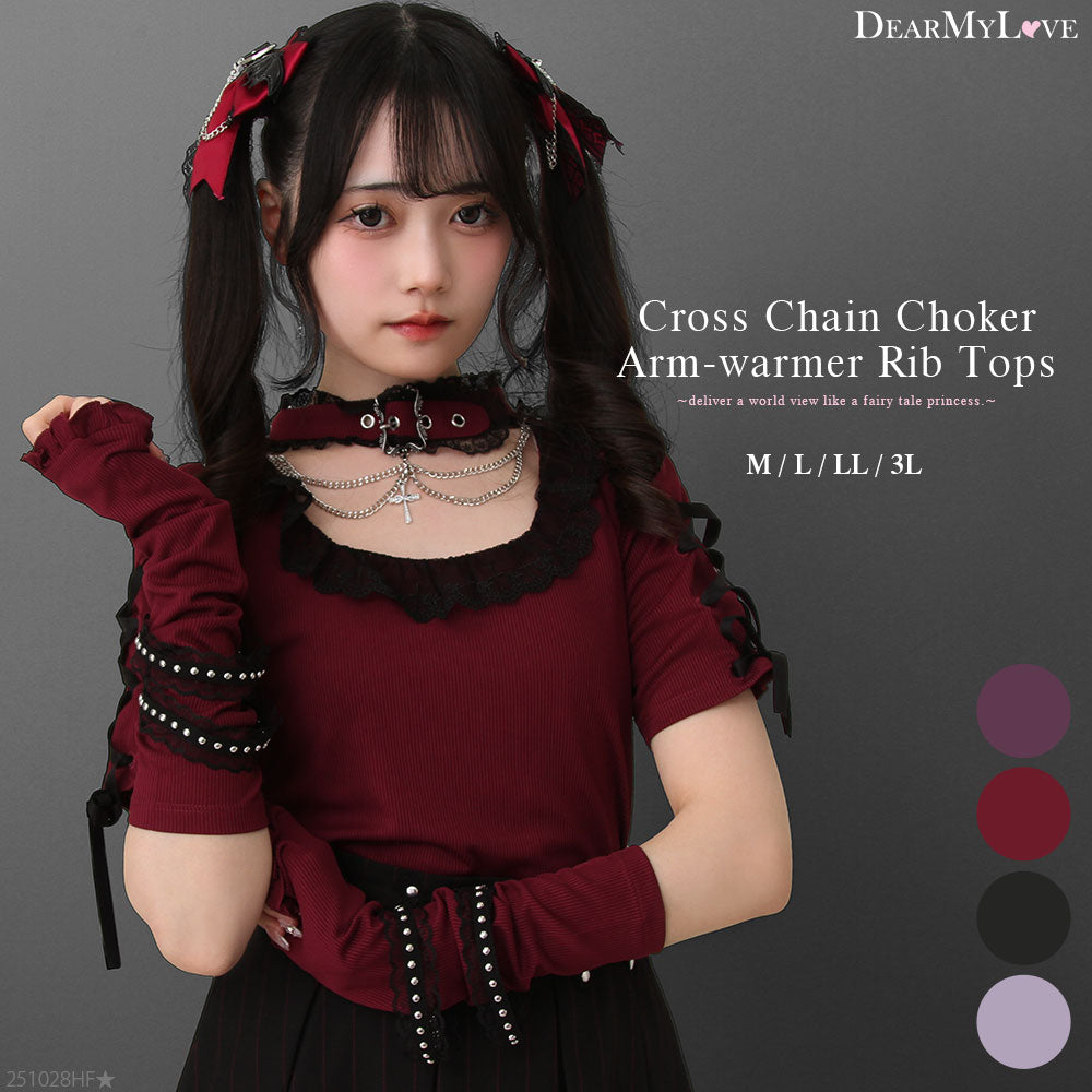 首元のレース付きチョーカーには、存在感たっぷりのシルバーチェーンと十字架チャームが施され、ひと目で視線を奪う印象的なデザイン。