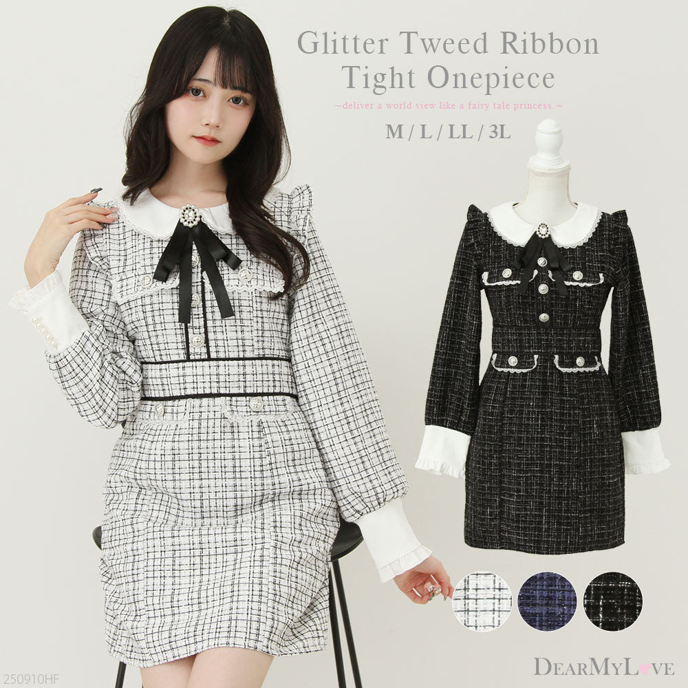 キラキラ輝くラメ入りツイード生地で仕立てた、上品で華やかなタイトシルエットワンピースが新登場♪