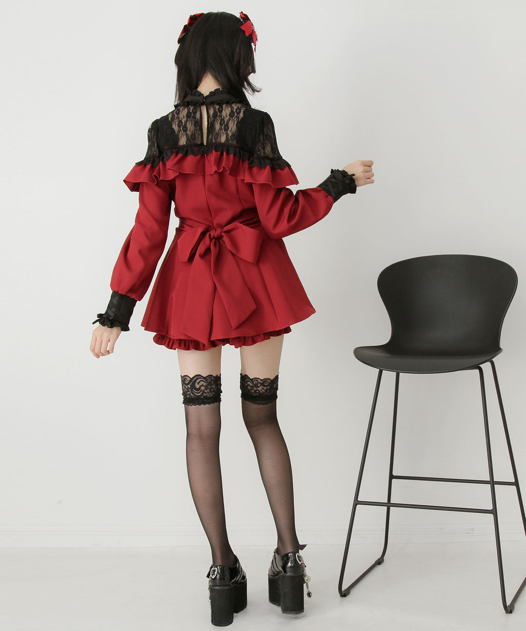 フリルハイネックにレース切替デザインがかわいいセットアップの新作が登場♪