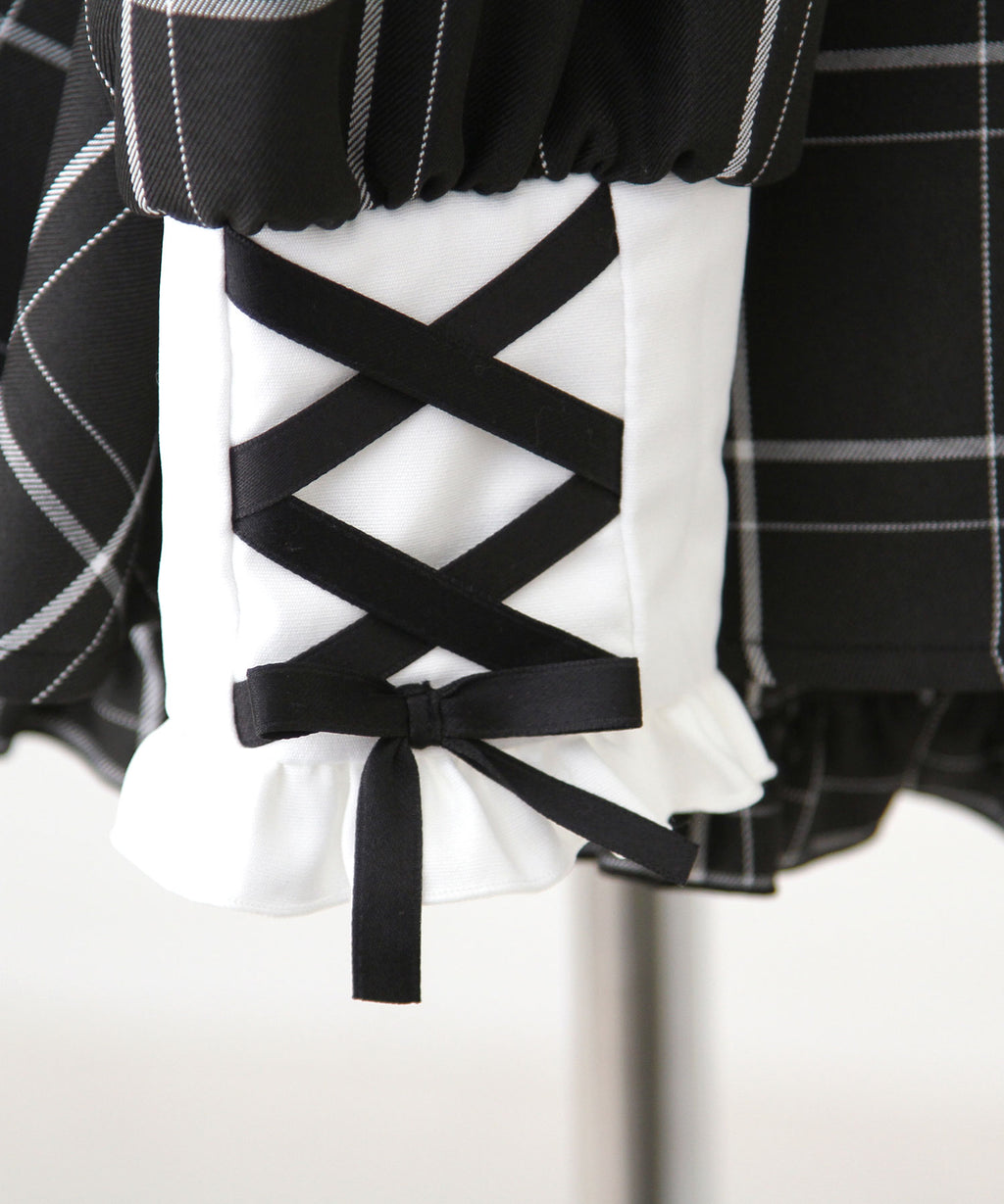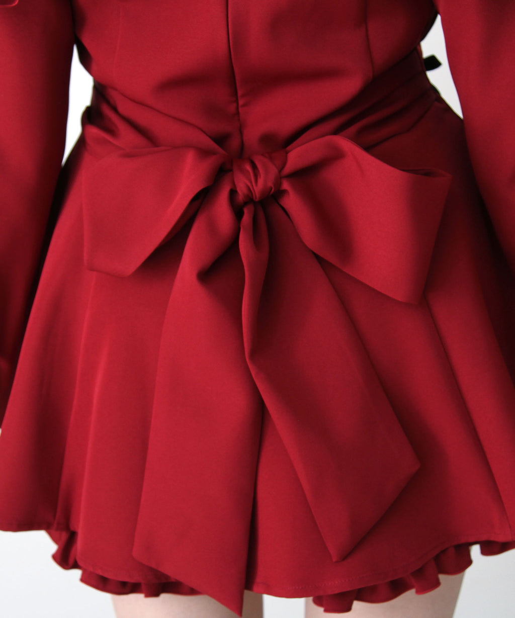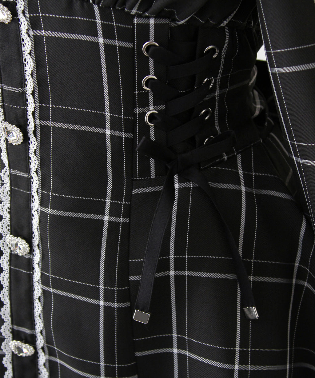 ウエストには細見えするレースアップデザインがあり、後ろには結びリボンでウエストを調整可能です。