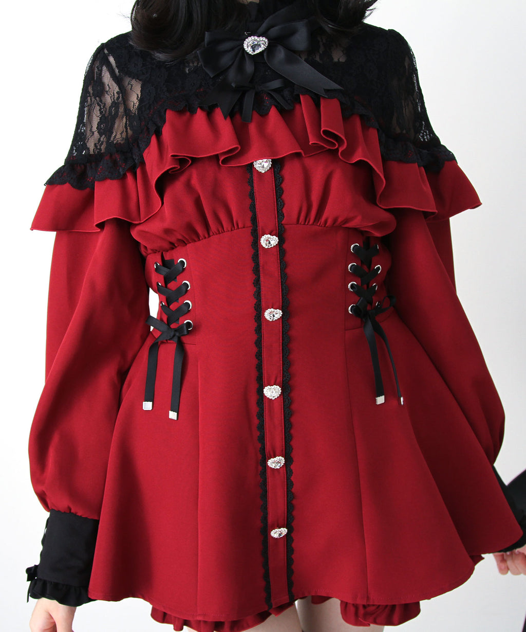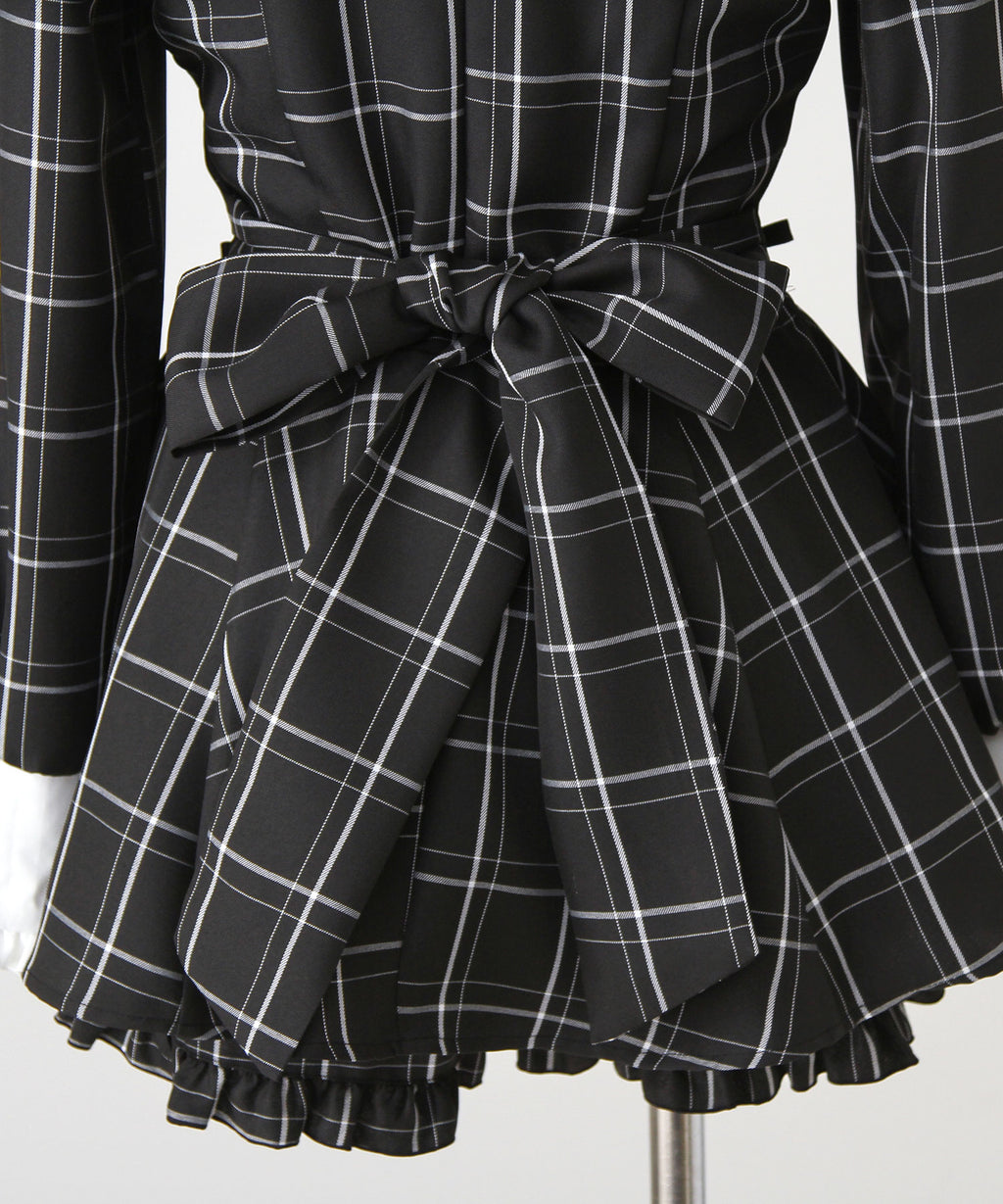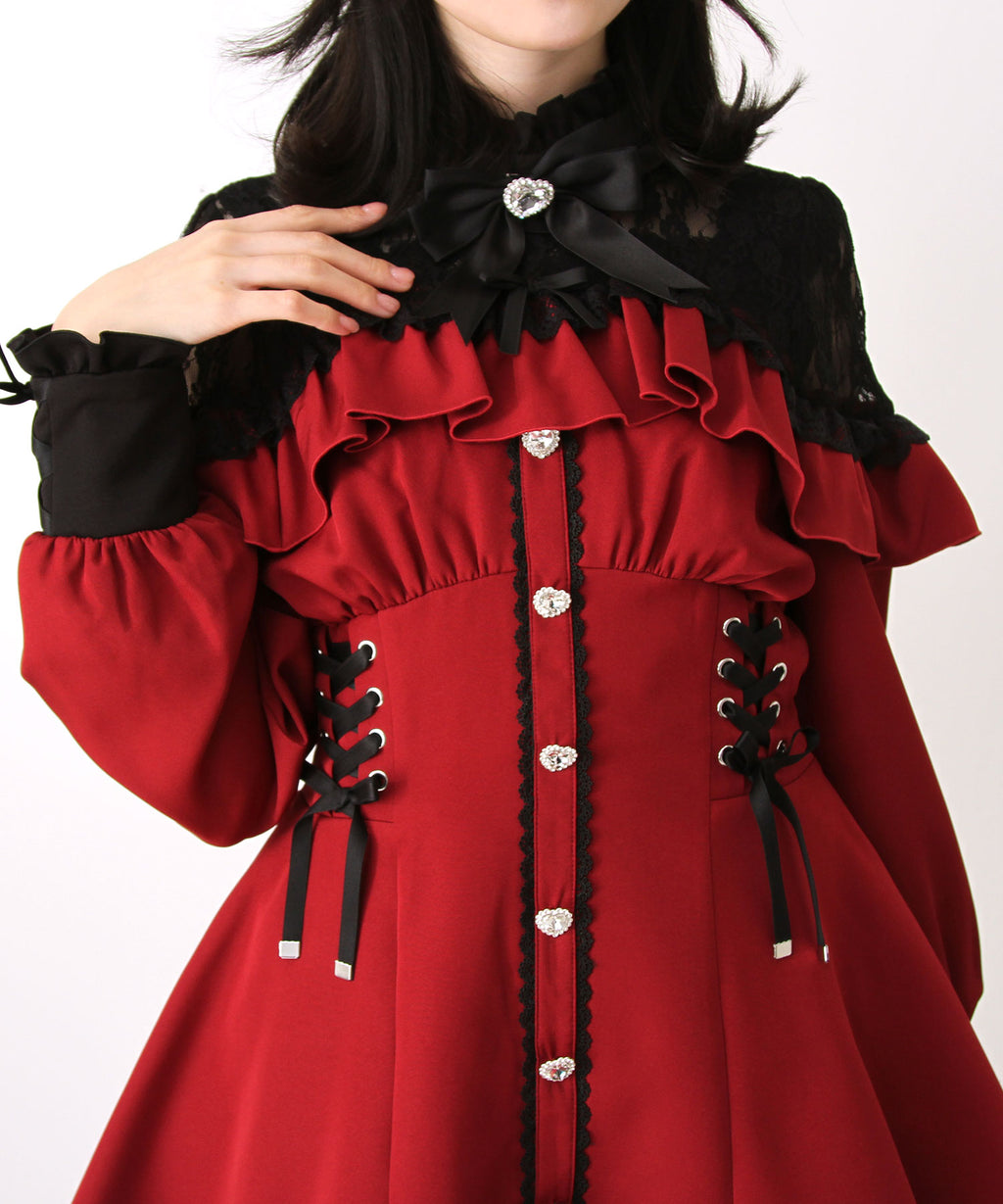 ウエストには細見えするレースアップデザインがあり、後ろには結びリボンでウエストを調整可能です。