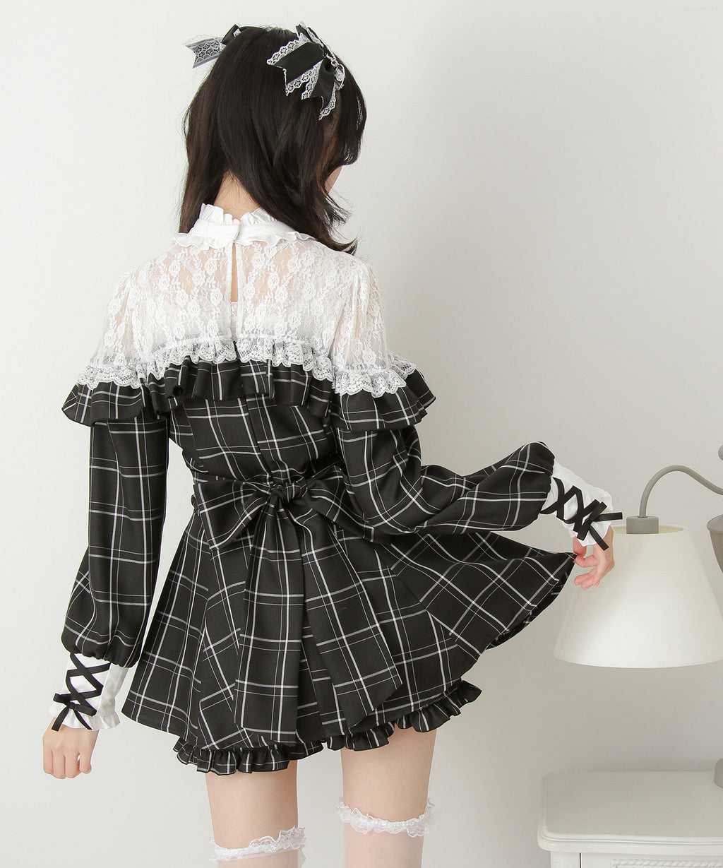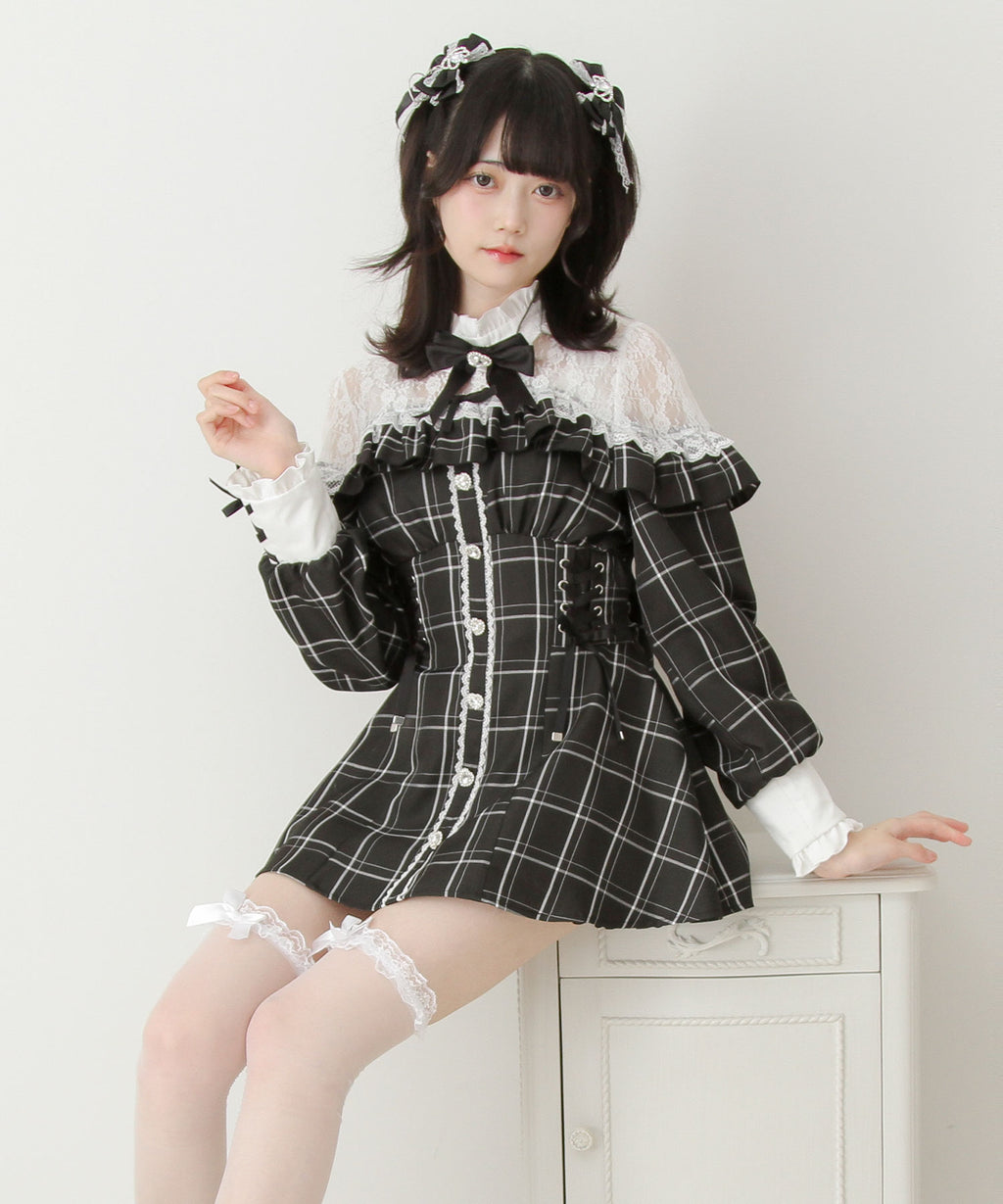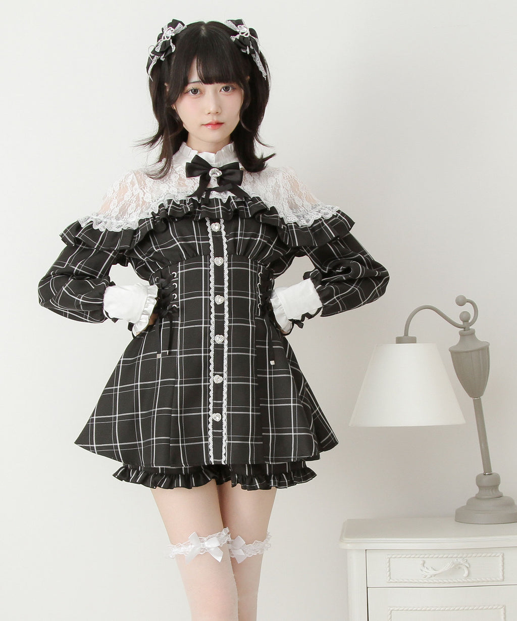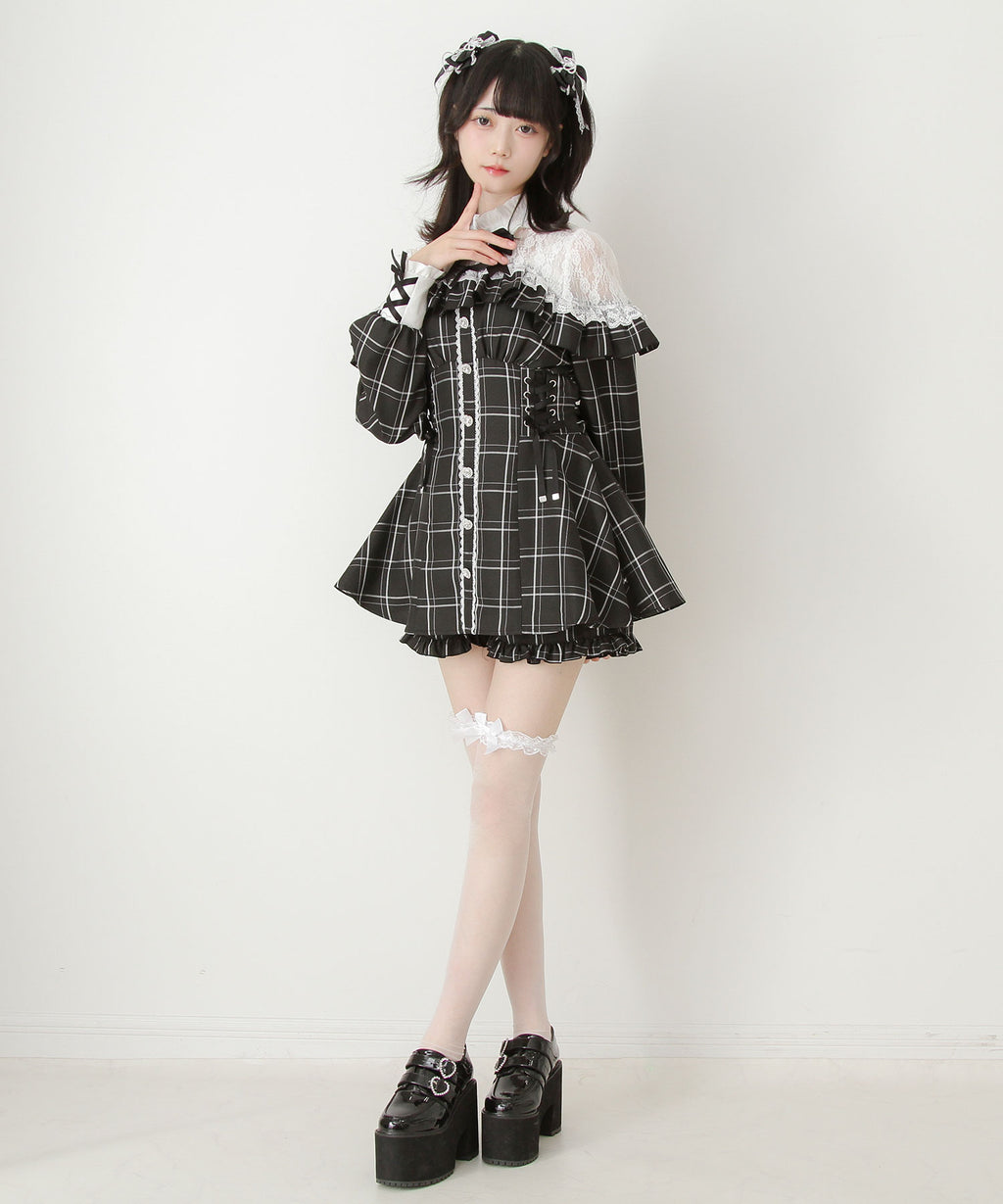 《素材》[表地(無地)]ポリエステル : 95% / ポリウレタン : 5% / [表地(チェック)、裏地、ケミカルレース]ポリエステル : 100% / [レース]レーヨン : 90% / ポリウレタン : 10% /