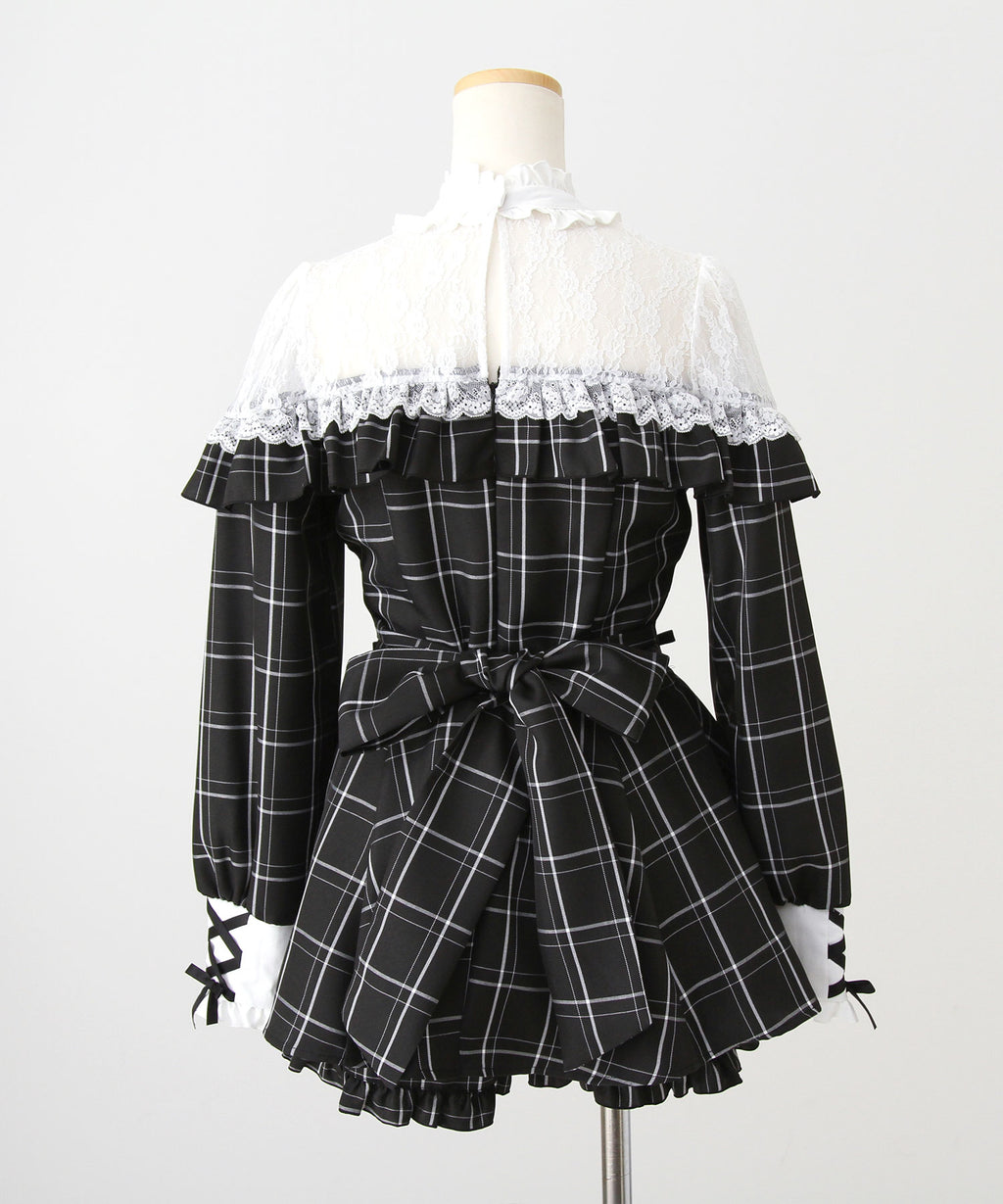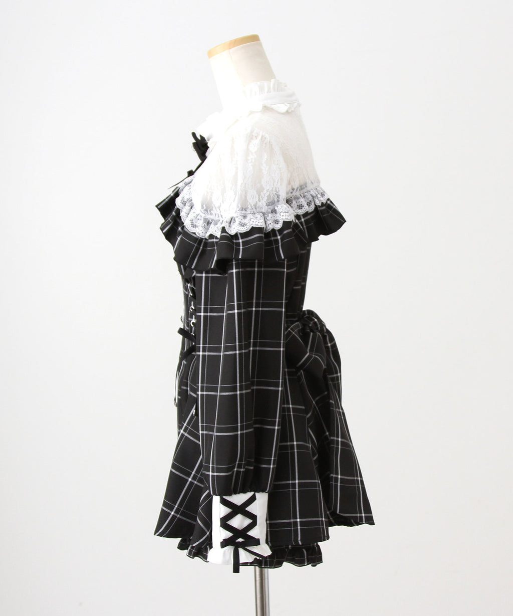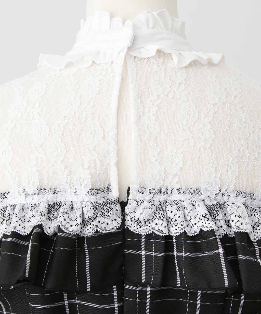 《素材》[表地(無地)]ポリエステル : 95% / ポリウレタン : 5% / [表地(チェック)、裏地、ケミカルレース]ポリエステル : 100% / [レース]レーヨン : 90% / ポリウレタン : 10% /