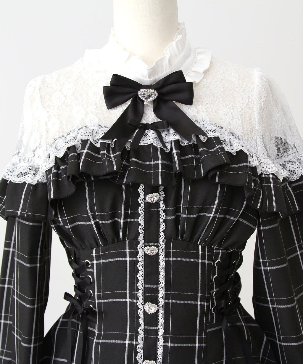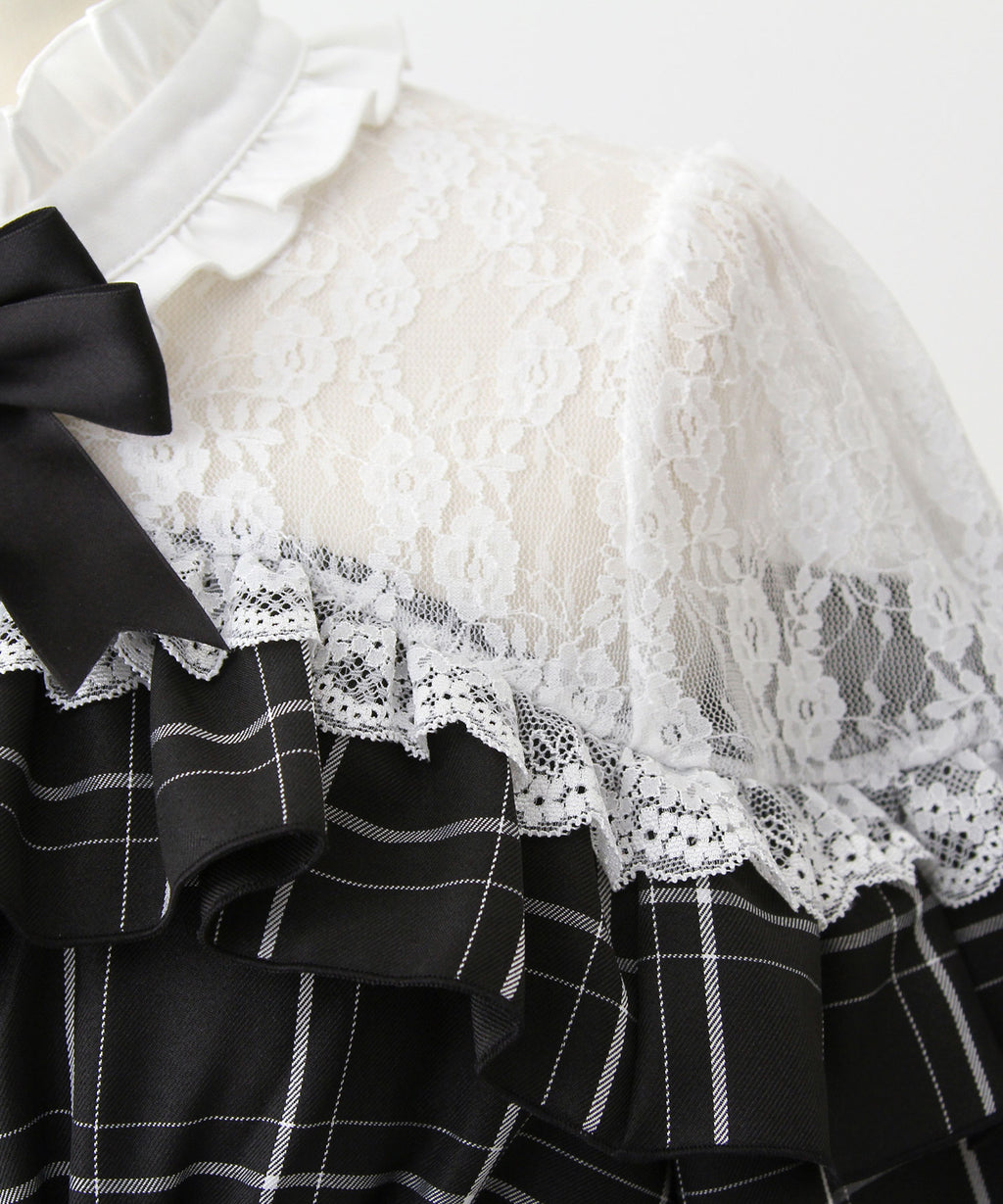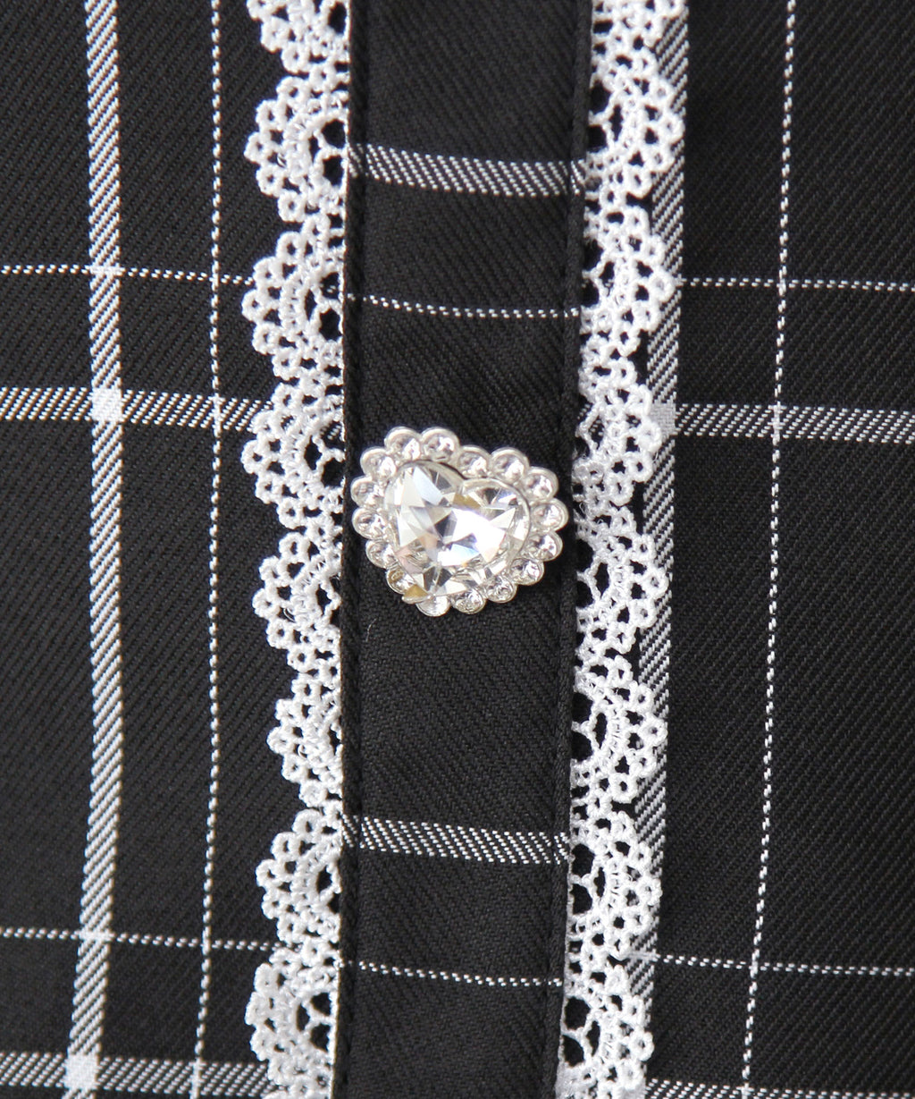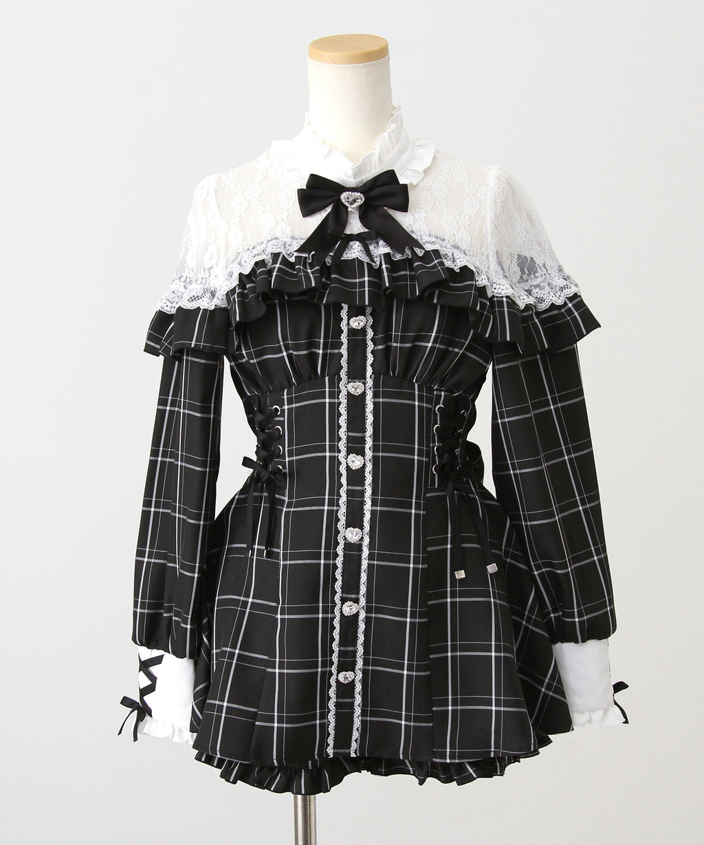 《素材》[表地(無地)]ポリエステル : 95% / ポリウレタン : 5% / [表地(チェック)、裏地、ケミカルレース]ポリエステル : 100% / [レース]レーヨン : 90% / ポリウレタン : 10% /